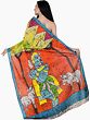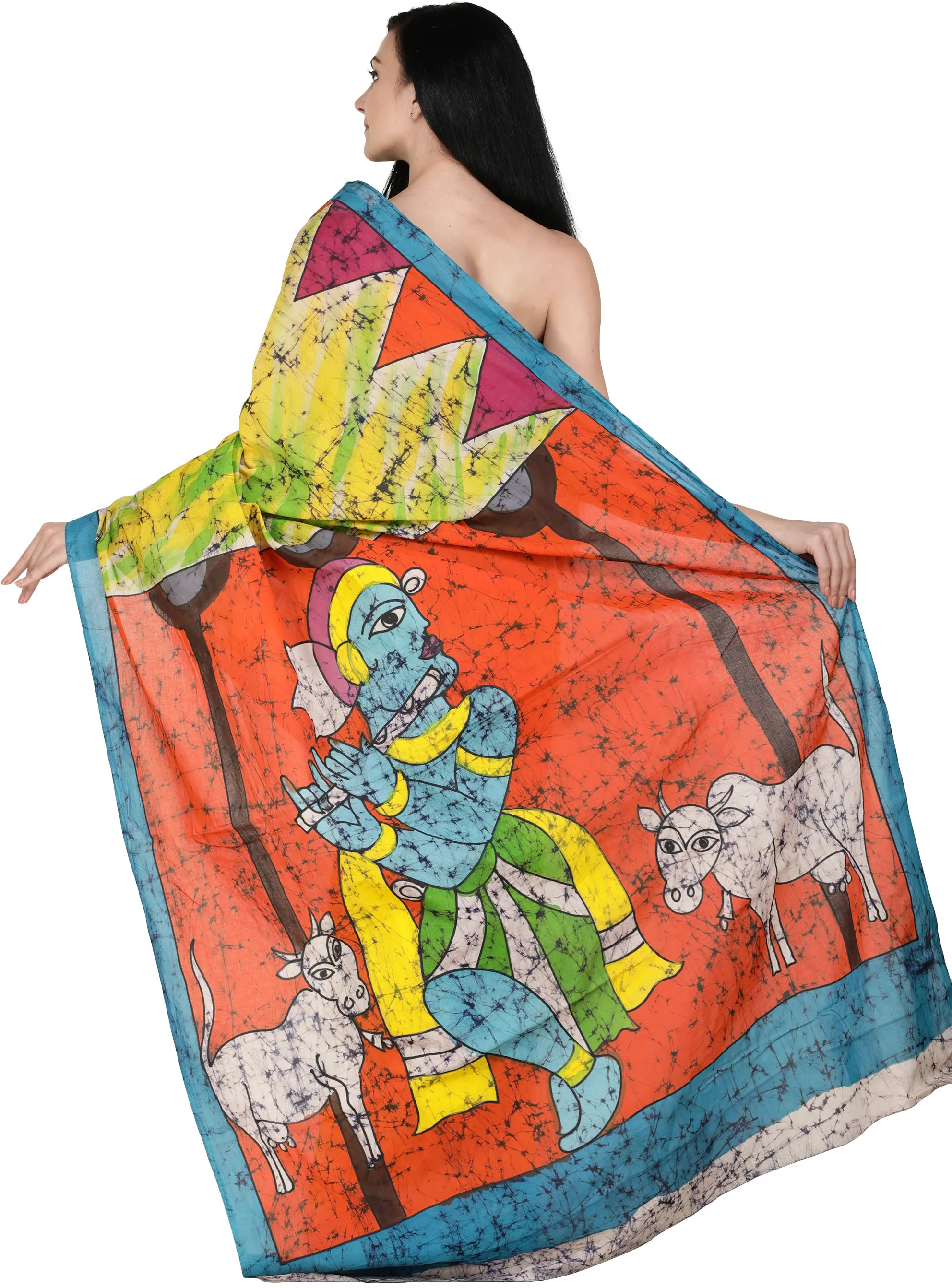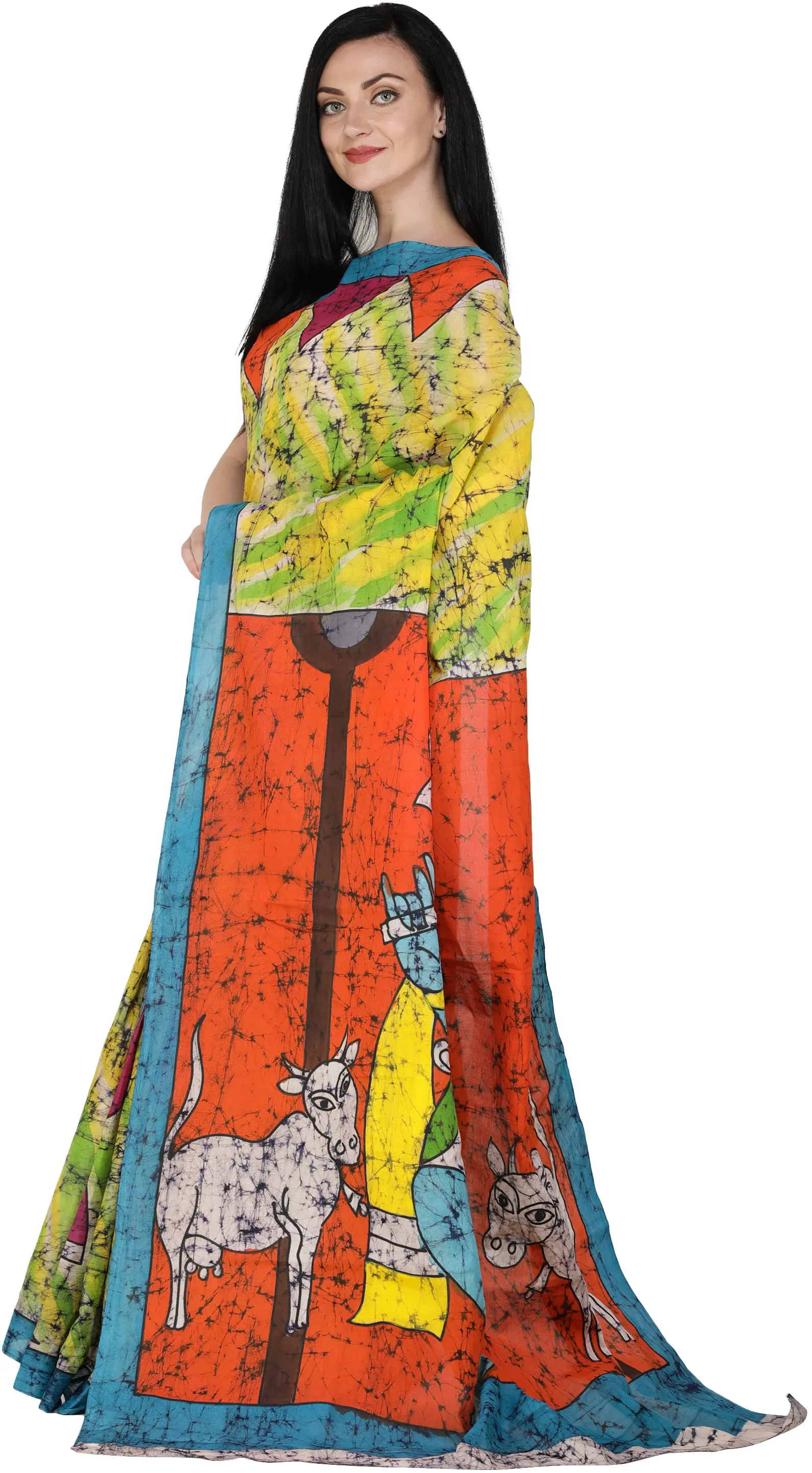 Multicolor Batik Sari from Madhya Pradesh with Printed Krishna with Cows (Gopala)
