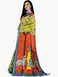 The heart of this sari's narrative lies in its captivating printed motif. Here, the divine figure of Gopala, another name for Lord Krishna, is depicted in a serene embrace with his beloved cows. This imagery evokes a sense of pastoral harmony, devotion, and the timeless connection between the divine and the natural world. The vibrant hues of orange, yellow, green, and blue form a lively backdrop, making the central figures pop with an almost three-dimensional presence. The playful depiction of Gopala, perhaps in a moment of playful interaction or serene contemplation with his gentle companions, is sure to resonate with those who appreciate spiritual art and folklore.
