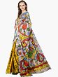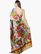 The design of this sari is a celebration of nature's beauty, featuring a playful yet elegant arrangement of printed paisleys and florals. The motifs are rendered in a spectrum of vivid hues – bold reds, sunny yellows, serene blues, and lush greens – all set against the delicate, crinkled off-white base. The paisley, a symbol of fertility and prosperity, is reimagined here with a modern twist, its graceful curves enhanced by the vibrant colors. Similarly, the floral elements bloom with an artistic flourish, adding a touch of organic charm to the overall composition. The juxtaposition of these traditional motifs with the lively color palette creates a sari that is both timeless and utterly contemporary.