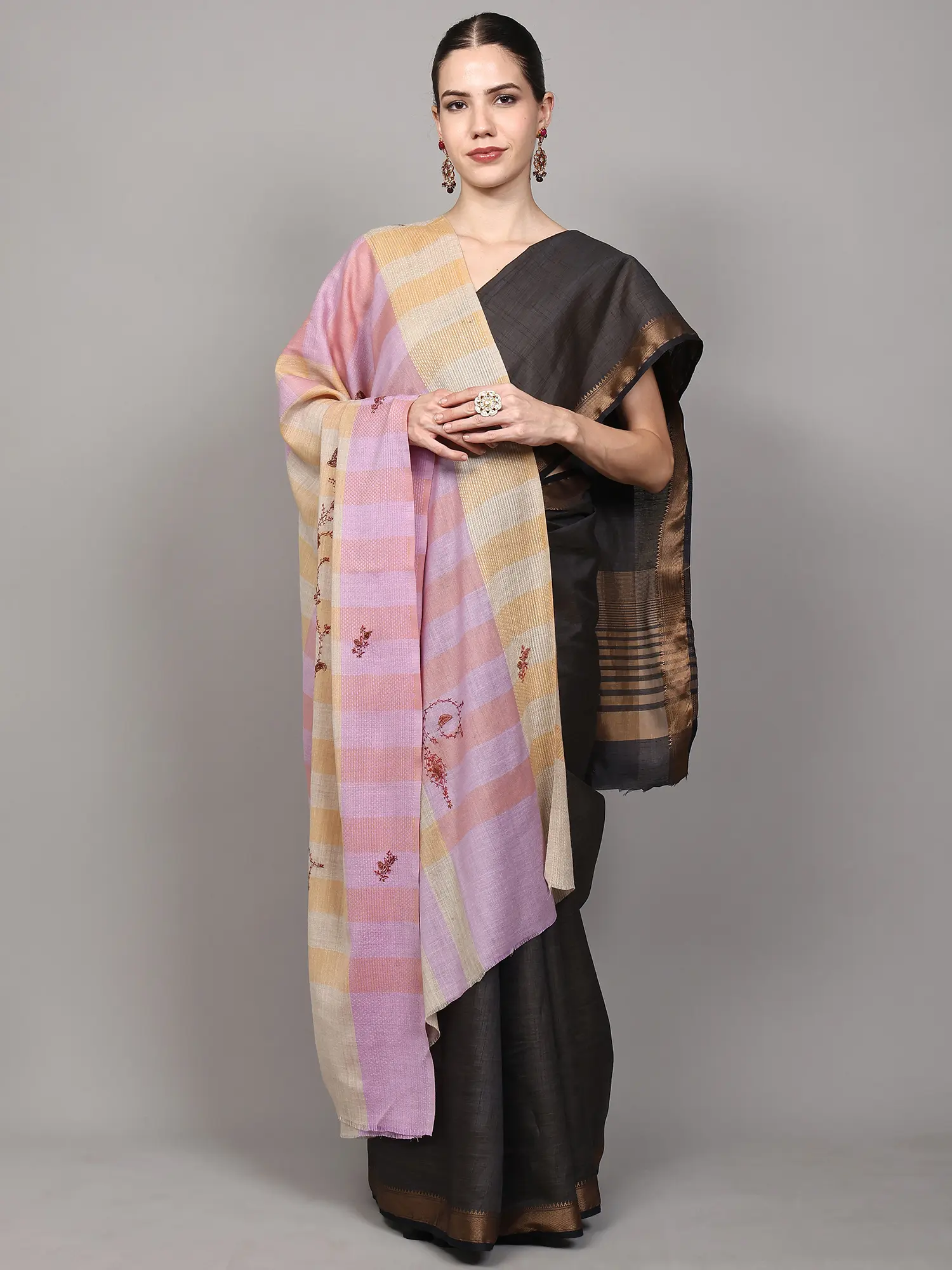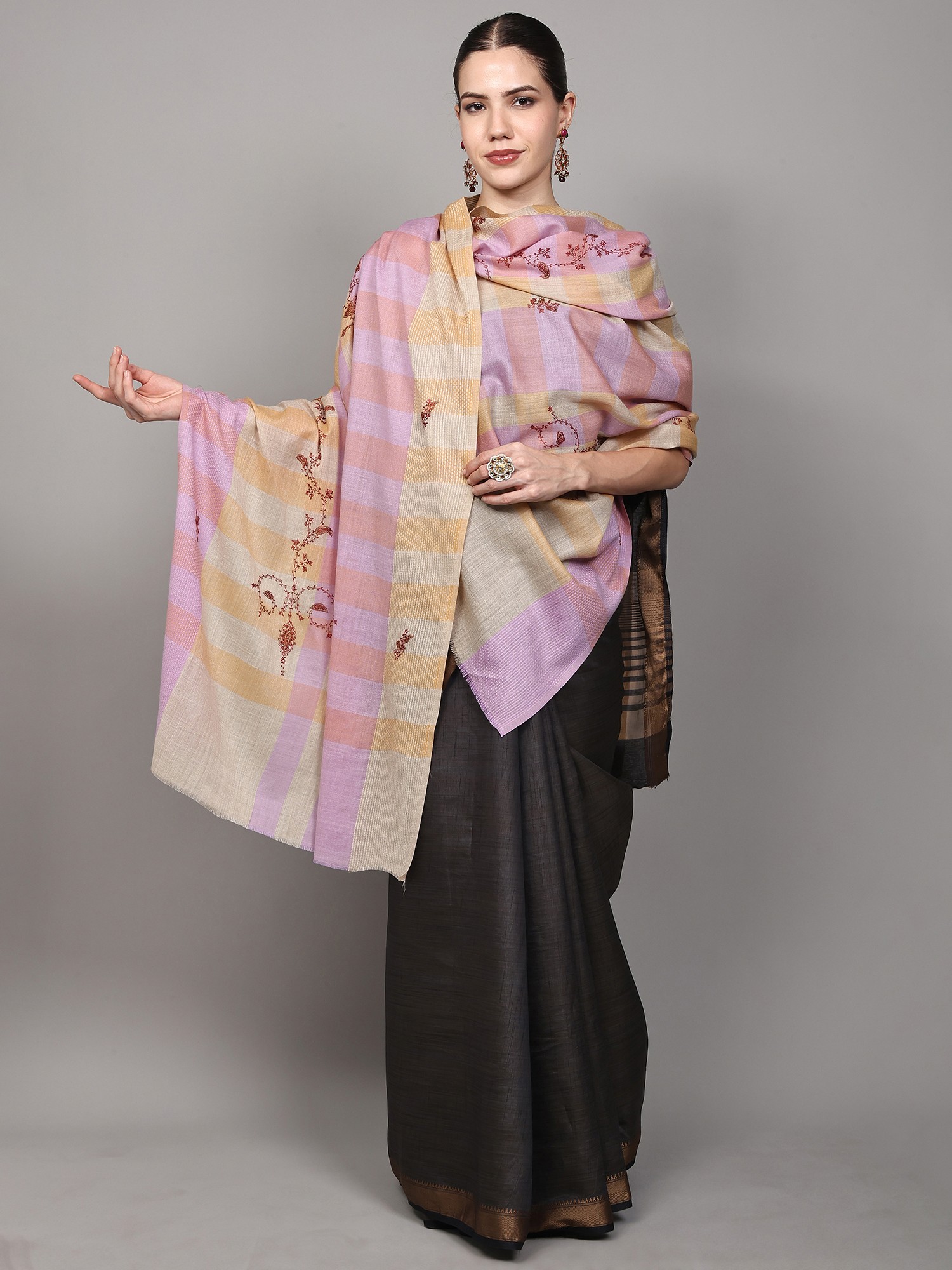 Light-Taupe Kalamkari Embroidered Shawl with Multicolor Paisleys-Flowers Motifs from Amritsar