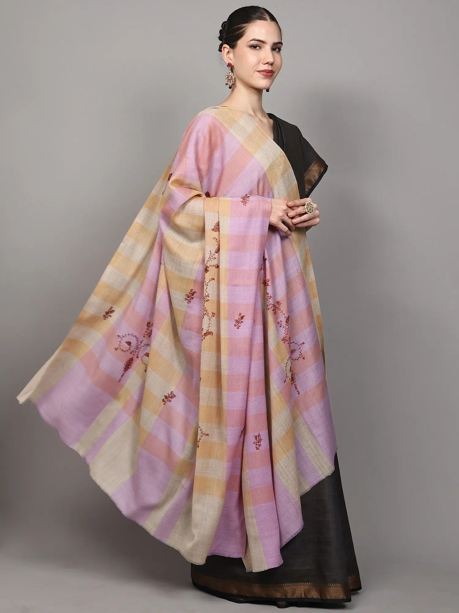 Two-Ply Reversible Ikat Shawl with Multicolor Checks and Floral Palla from Amritsar