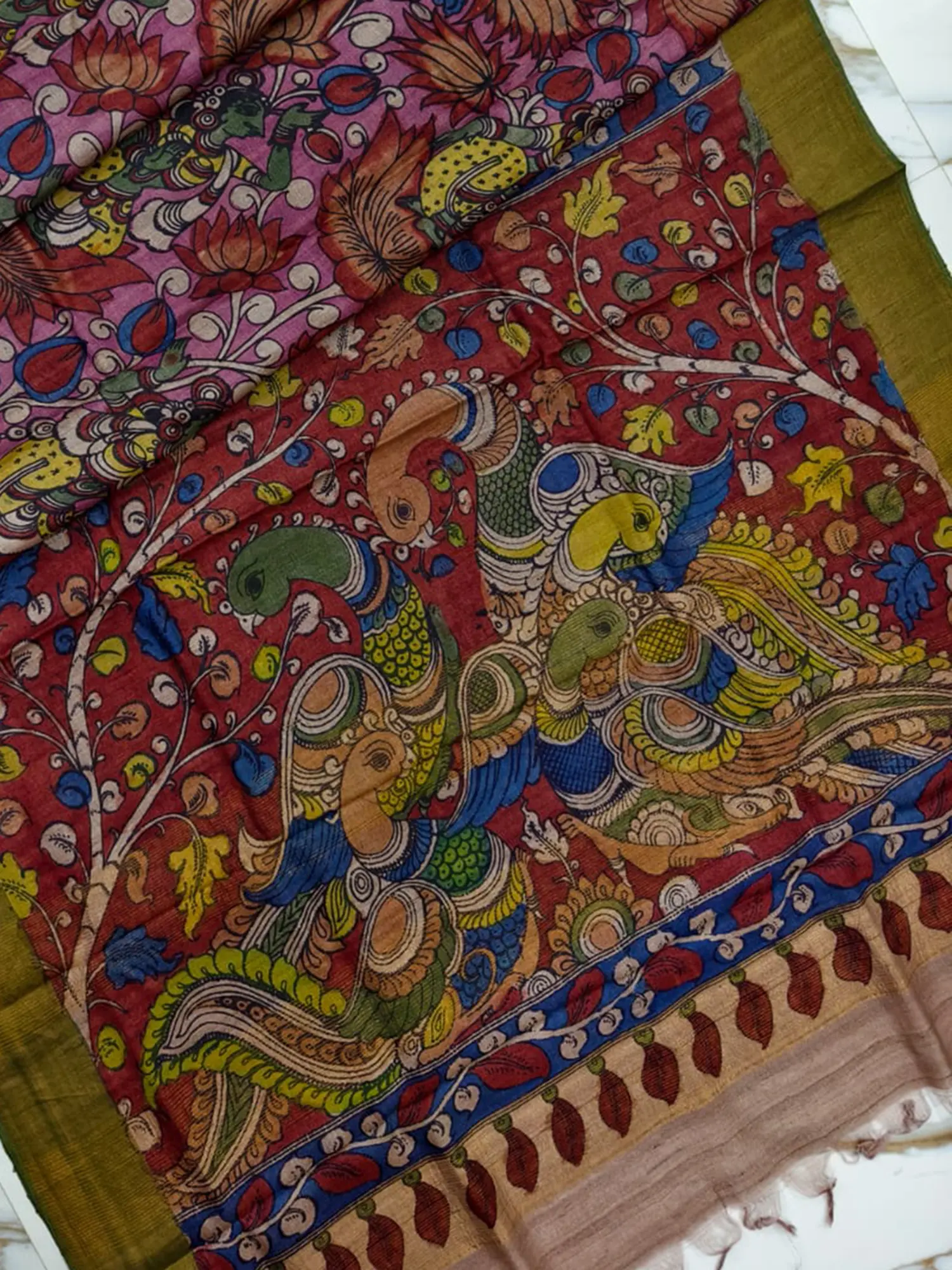 Red-Dahlia Pure Silk Swarnachari Baluchari Saree from Bengal with Zari Weave Village Tribe Scene