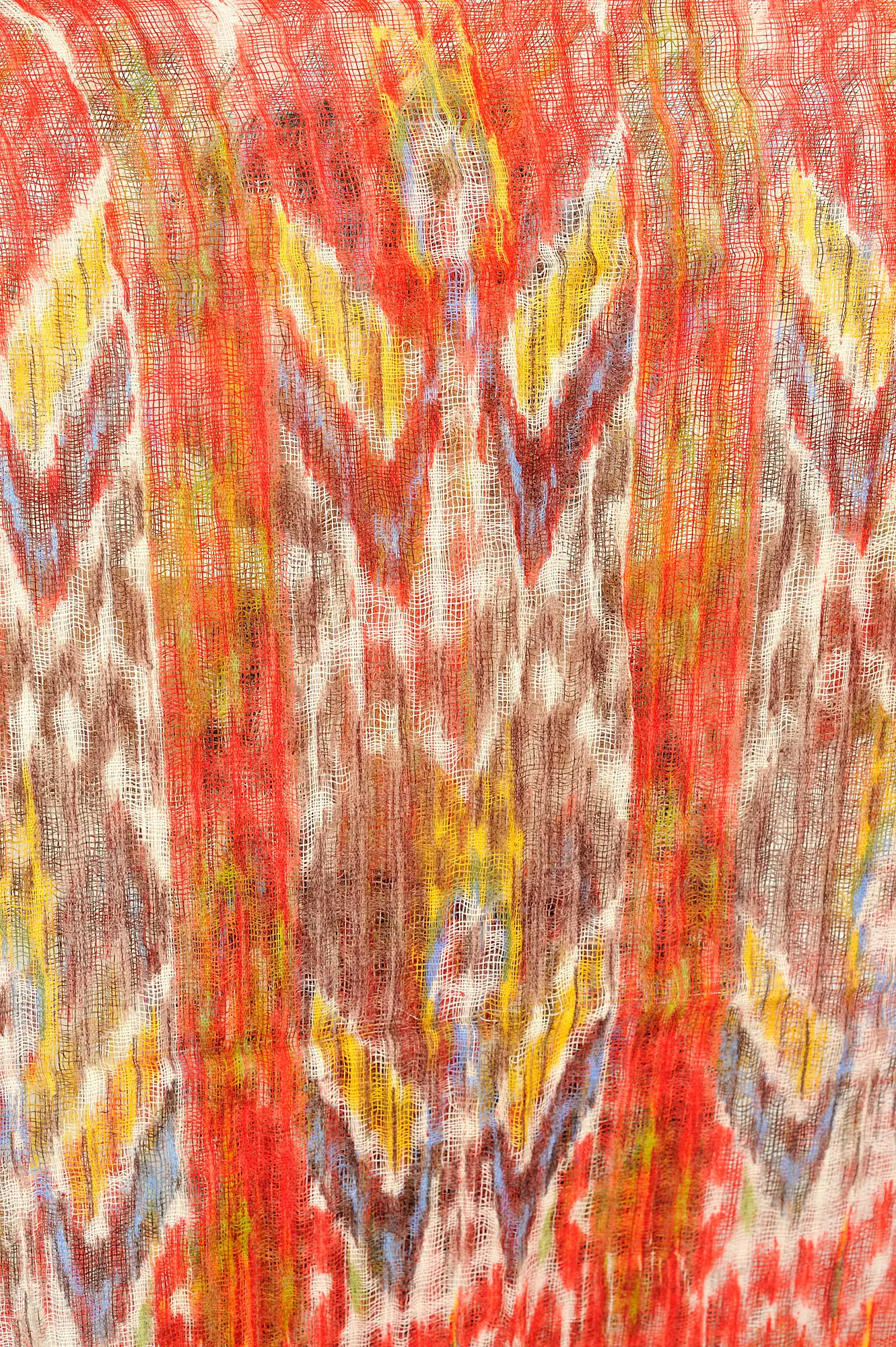 The surface of this stole is adorned with a mesmerizing digital print that bursts with a kaleidoscope of colors. Bold strokes of fiery reds and warm oranges blend seamlessly with earthy browns and vibrant yellows, punctuated by hints of cool blues and whites. The abstract, almost painterly quality of the print evokes a sense of movement and energy, reminiscent of a dynamic sunset or a vibrant abstract artwork. Each wear is an opportunity to showcase a unique composition, as the pattern unfolds and shifts with every drape and fold.