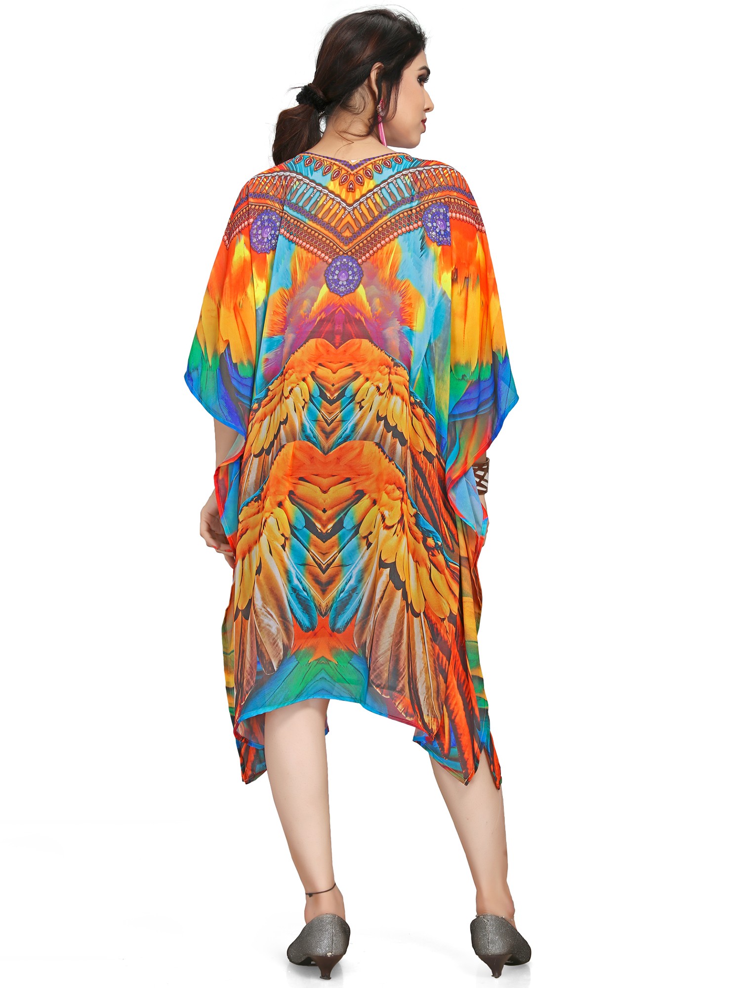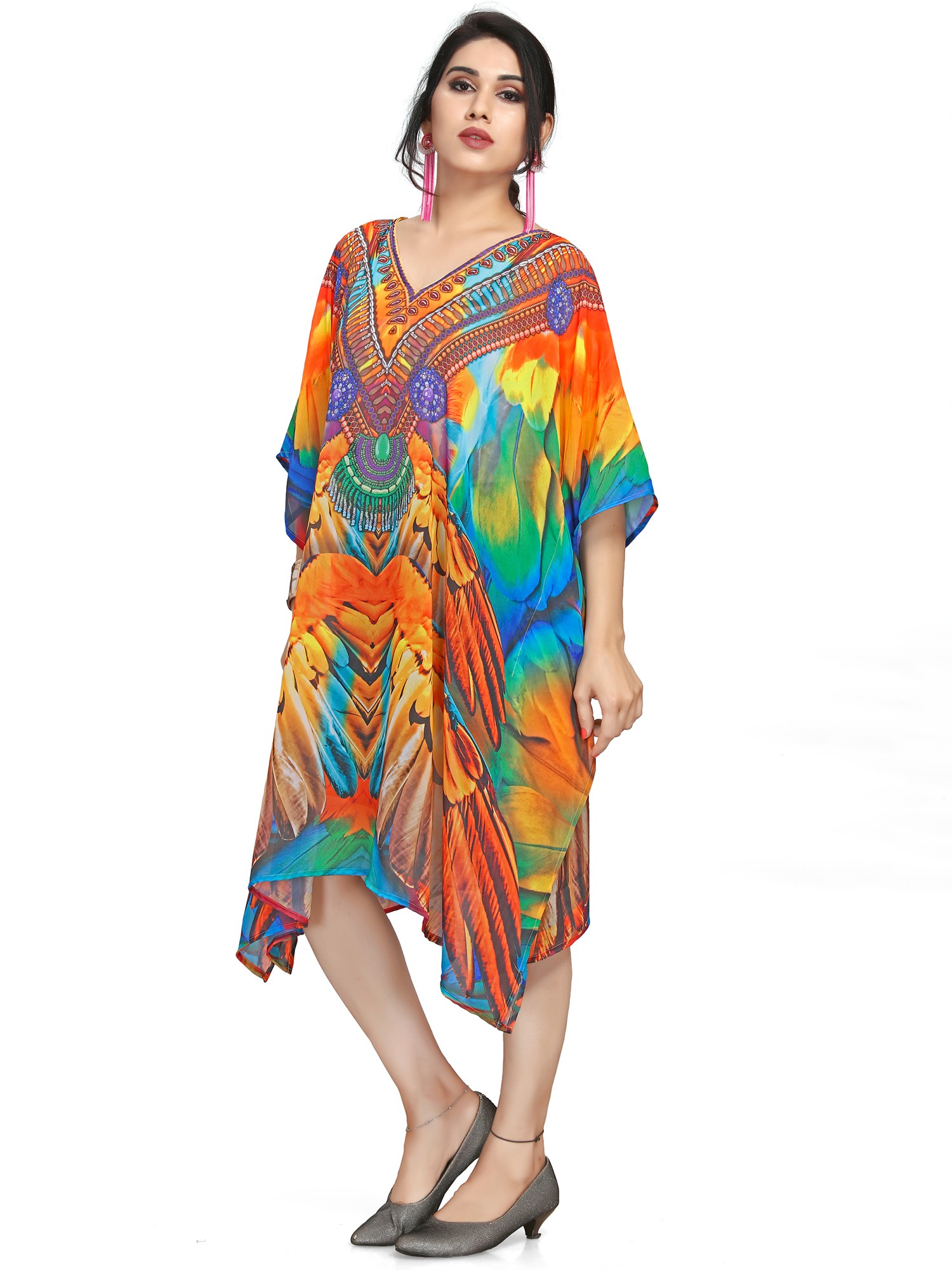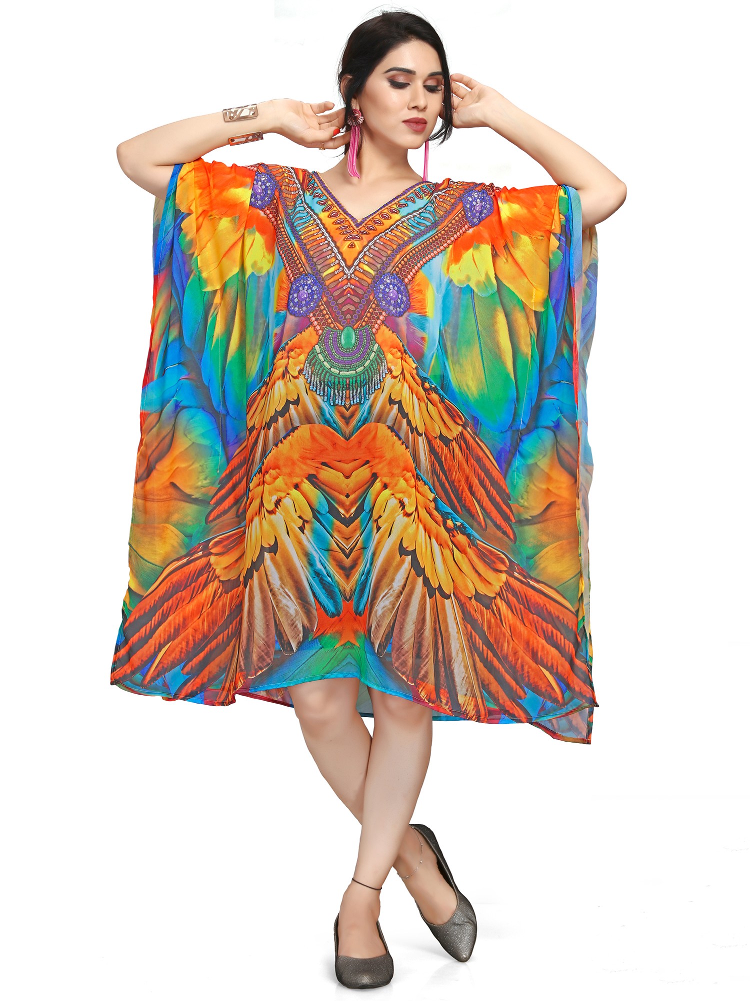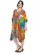 Yellow and Green Georgette Short Kaftan with Printed Hibiscus Flowers