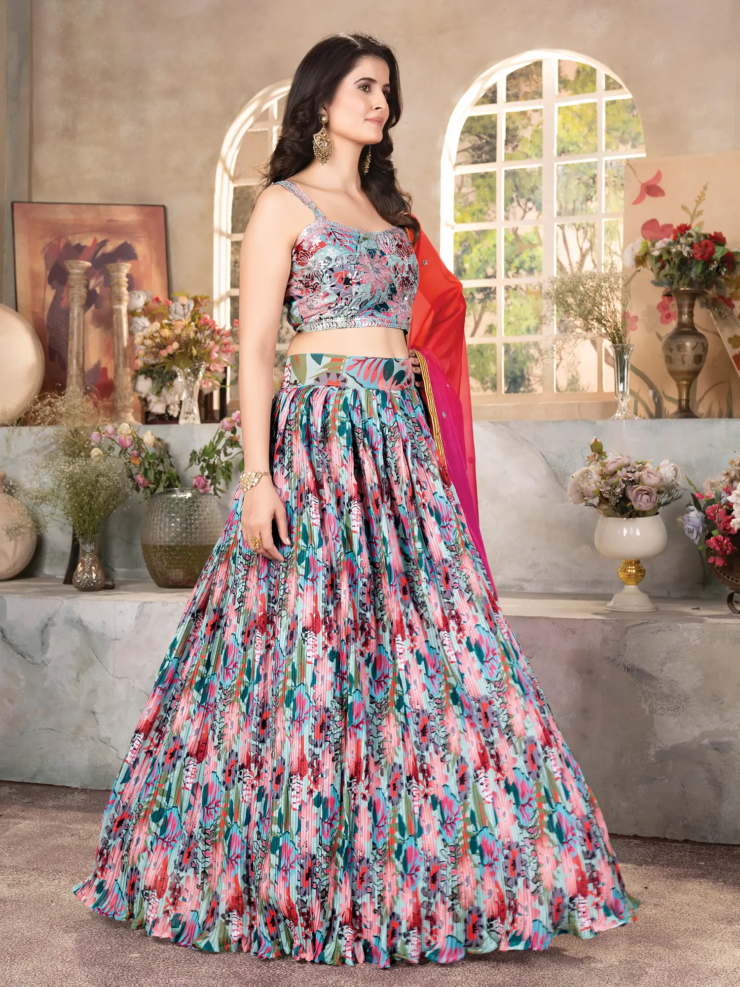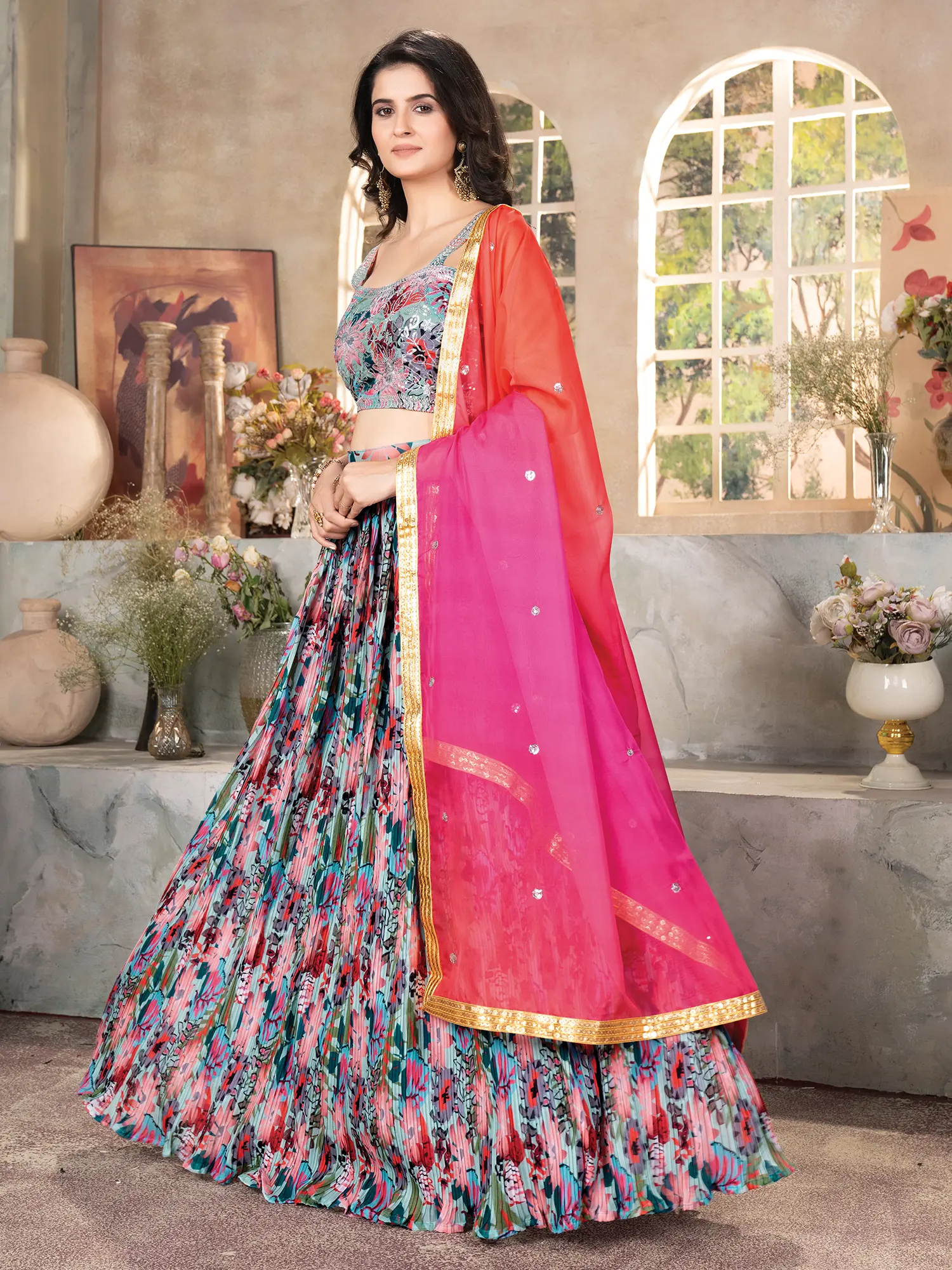 Multicolor Printed Elegant Art Silk Party Wear Lehenga Choli With Matching Organza Dupatta