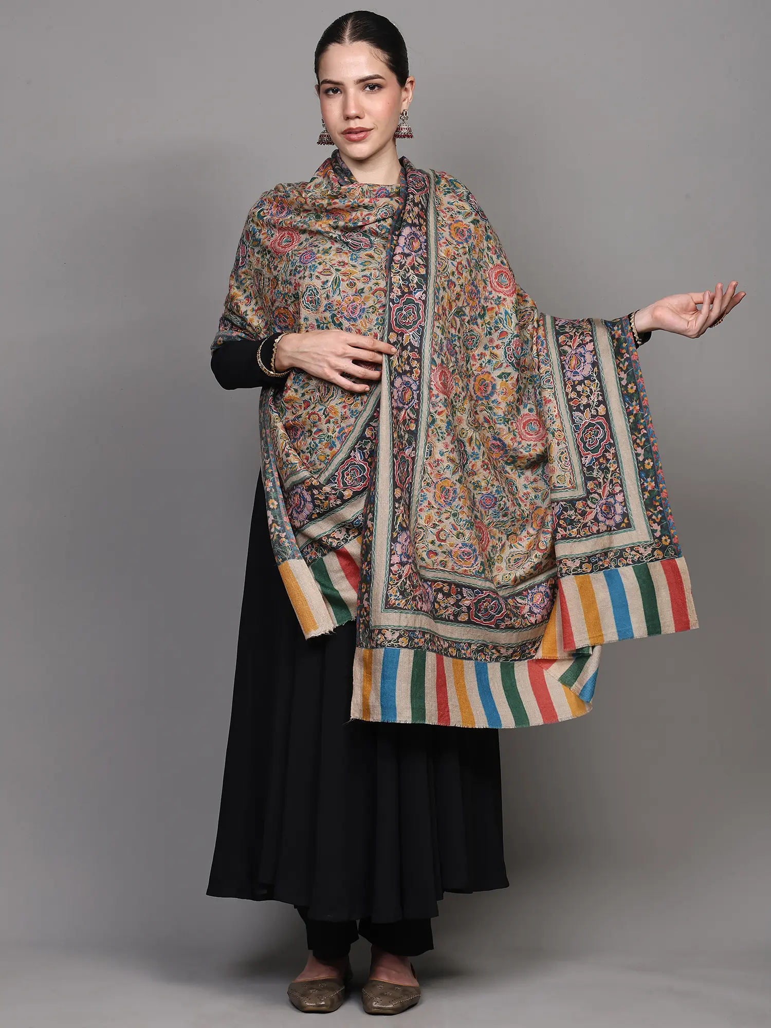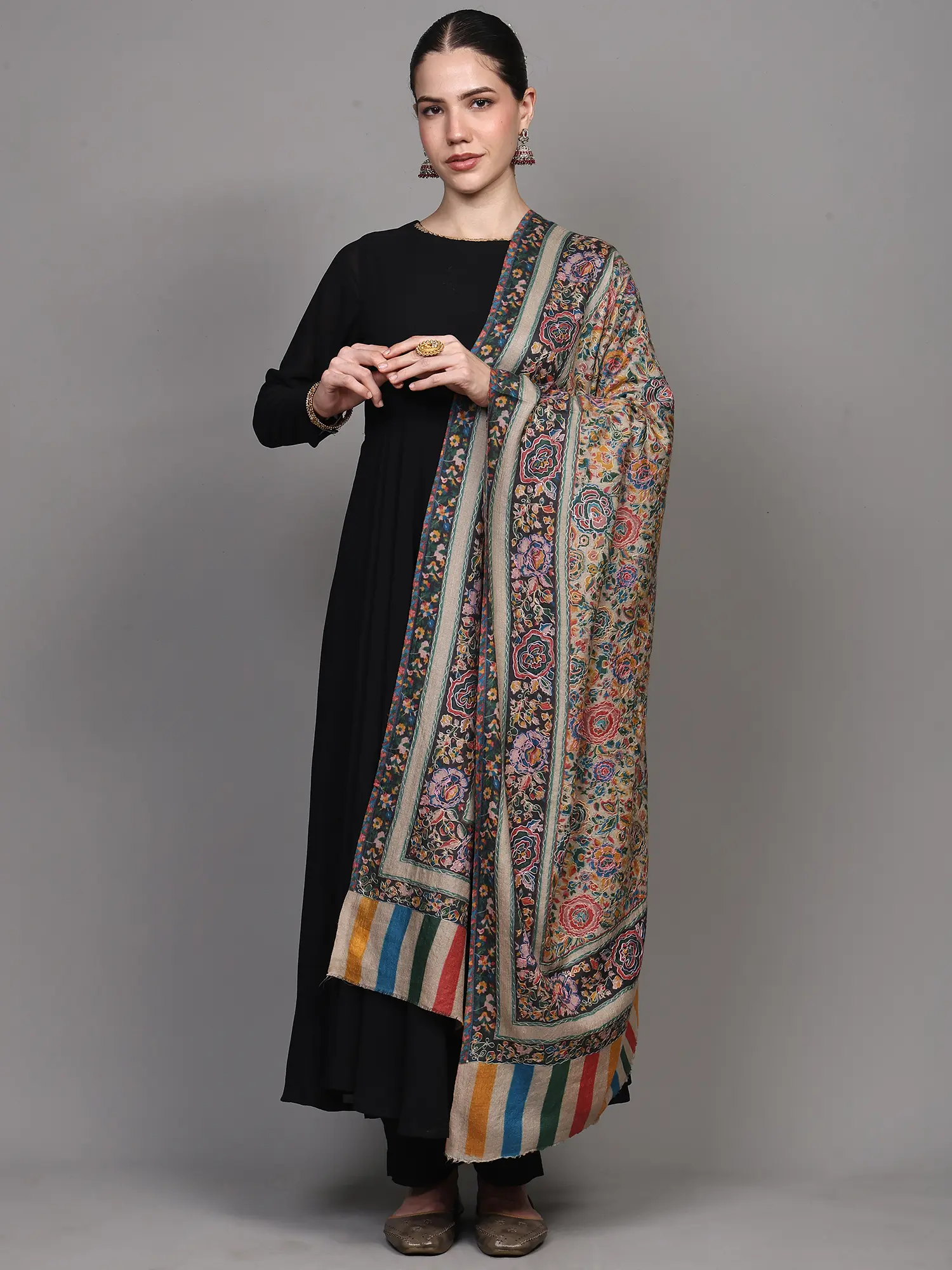 Light-Taupe Kalamkari Embroidered Shawl with Multicolor Paisleys-Flowers Motifs from Amritsar