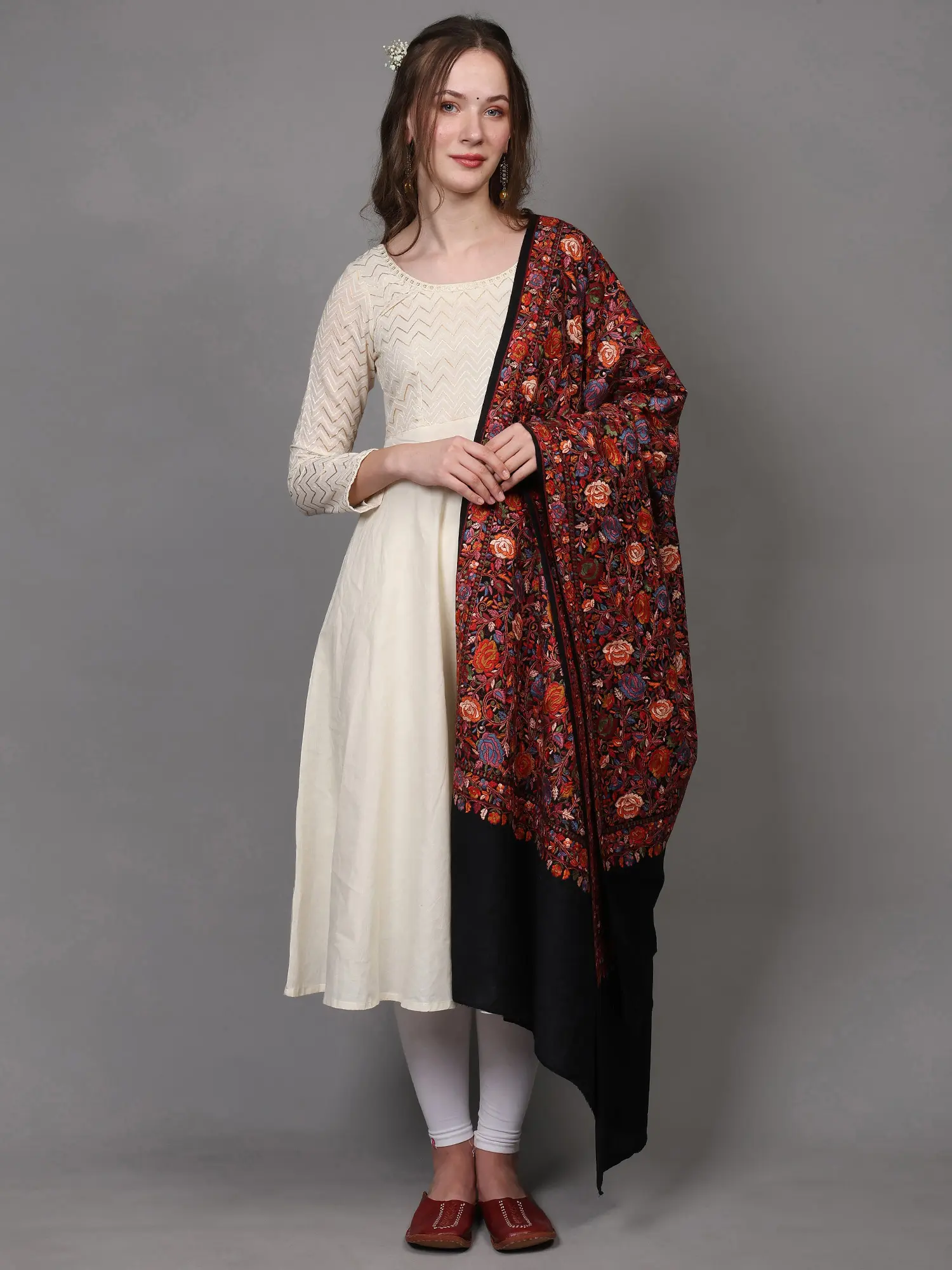 The defining feature of this stunning shawl is its elaborate embroidery. A vibrant tapestry of multicolored floral vines climbs across the fabric, showcasing the incredible skill and dedication of the embroiderers. Each stitch is carefully placed to create a dense, intricate pattern that captures the eye and evokes a sense of timeless beauty. The flowers burst with color, creating a lively contrast against the shawl's base. From delicate rosebuds to full-blown blossoms, the embroidery showcases a delightful array of floral motifs, making it a truly unique and eye-catching piece. This detailed embroidery is not merely decorative; it is a testament to the generations of artistic knowledge passed down through families in Punjab.