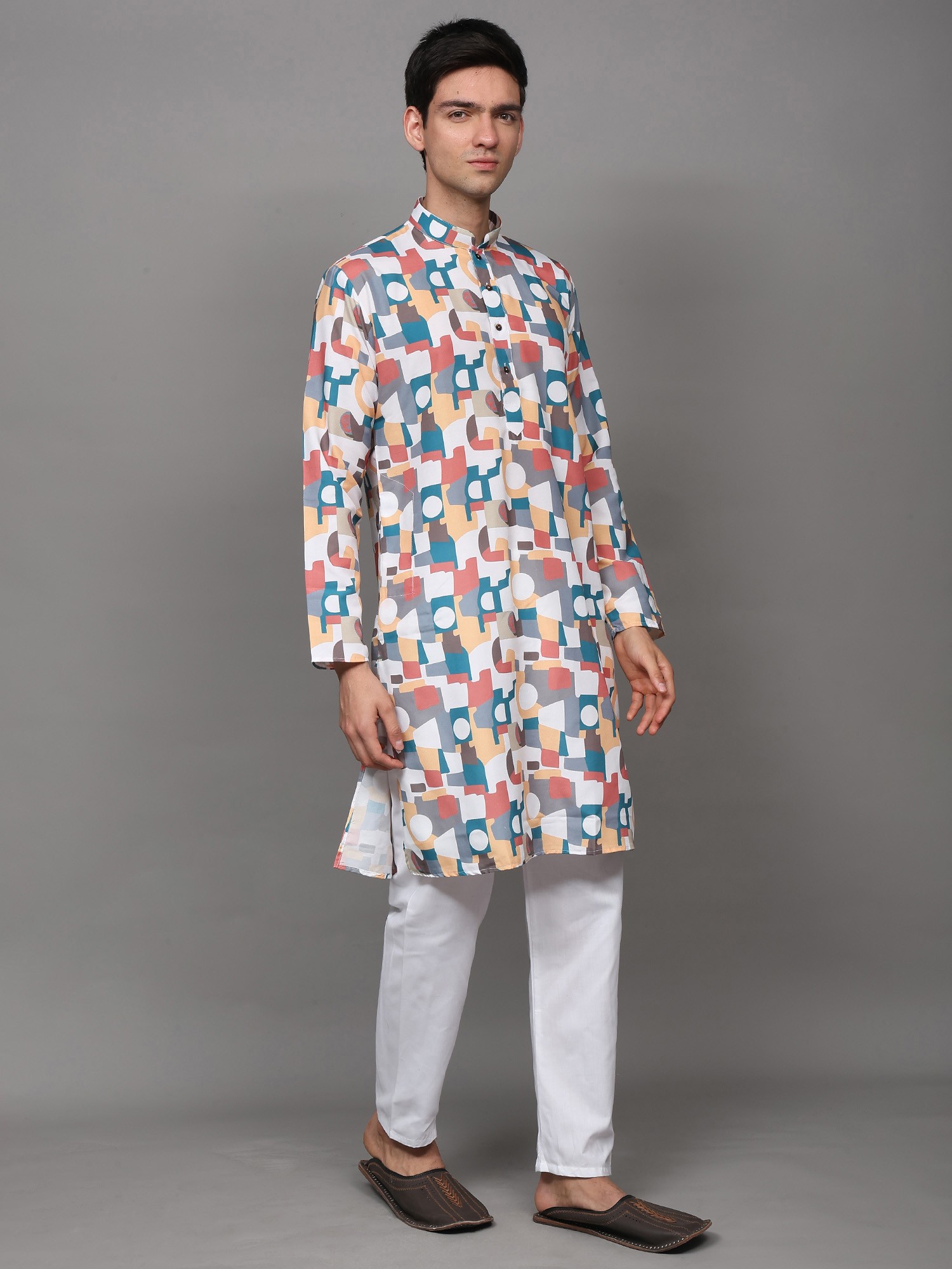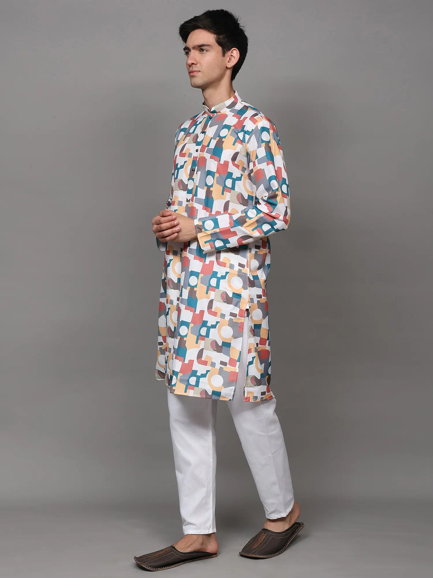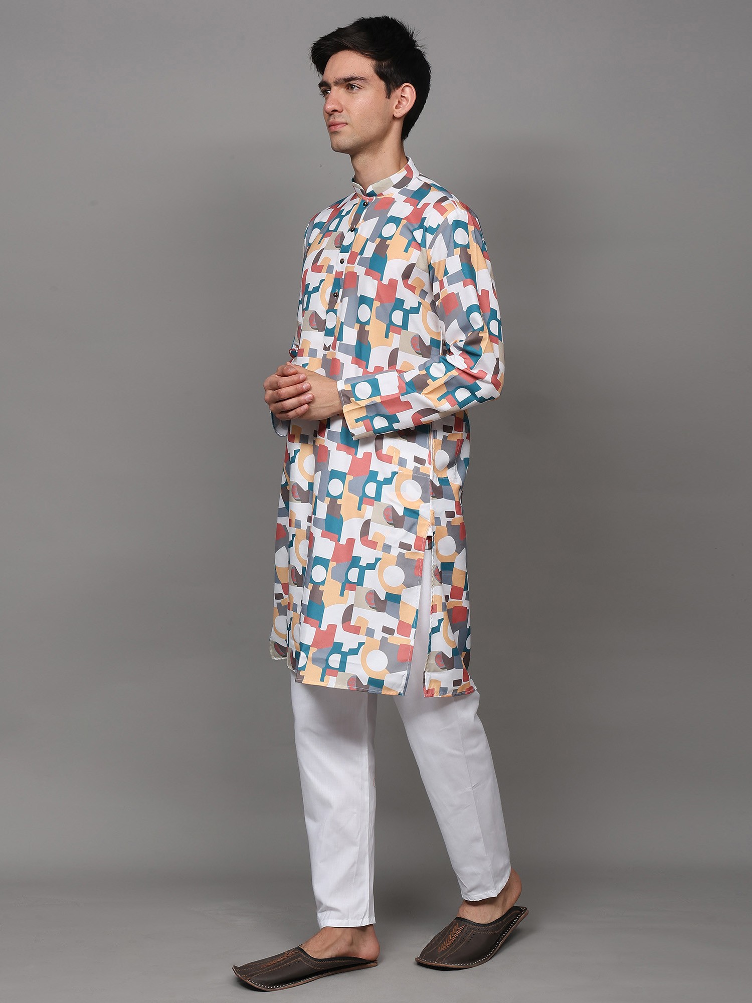 Multicolor Geometric Pattern Print Kurta with White Pajama
