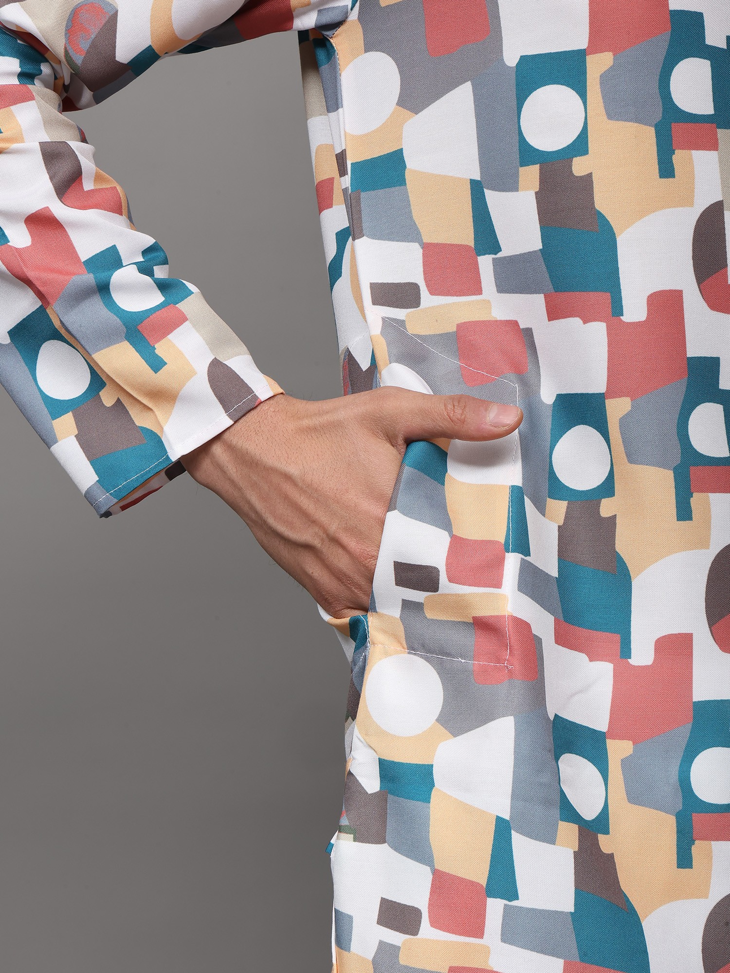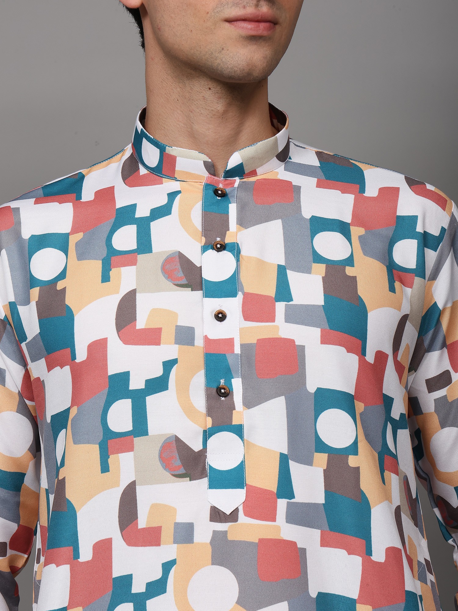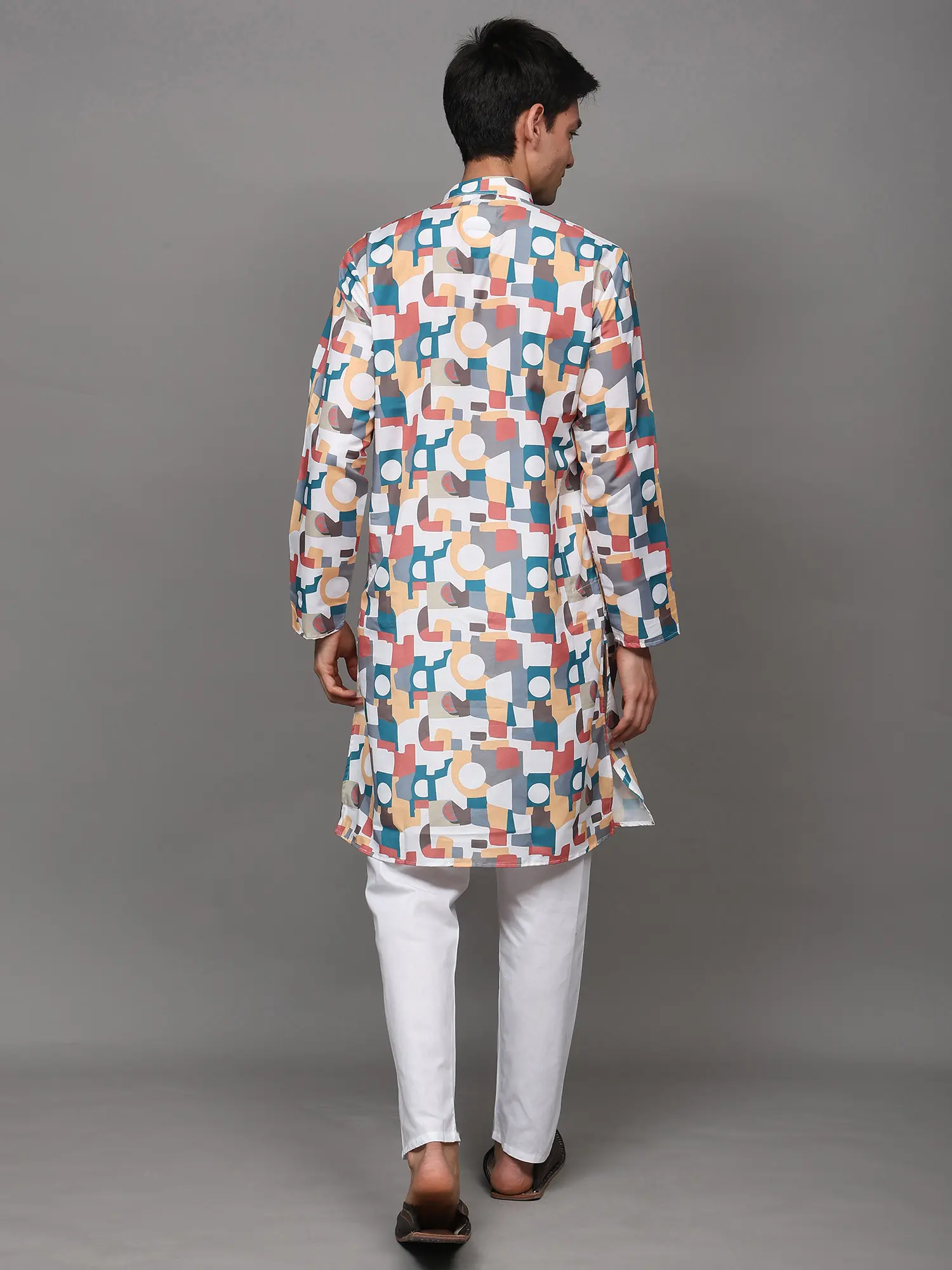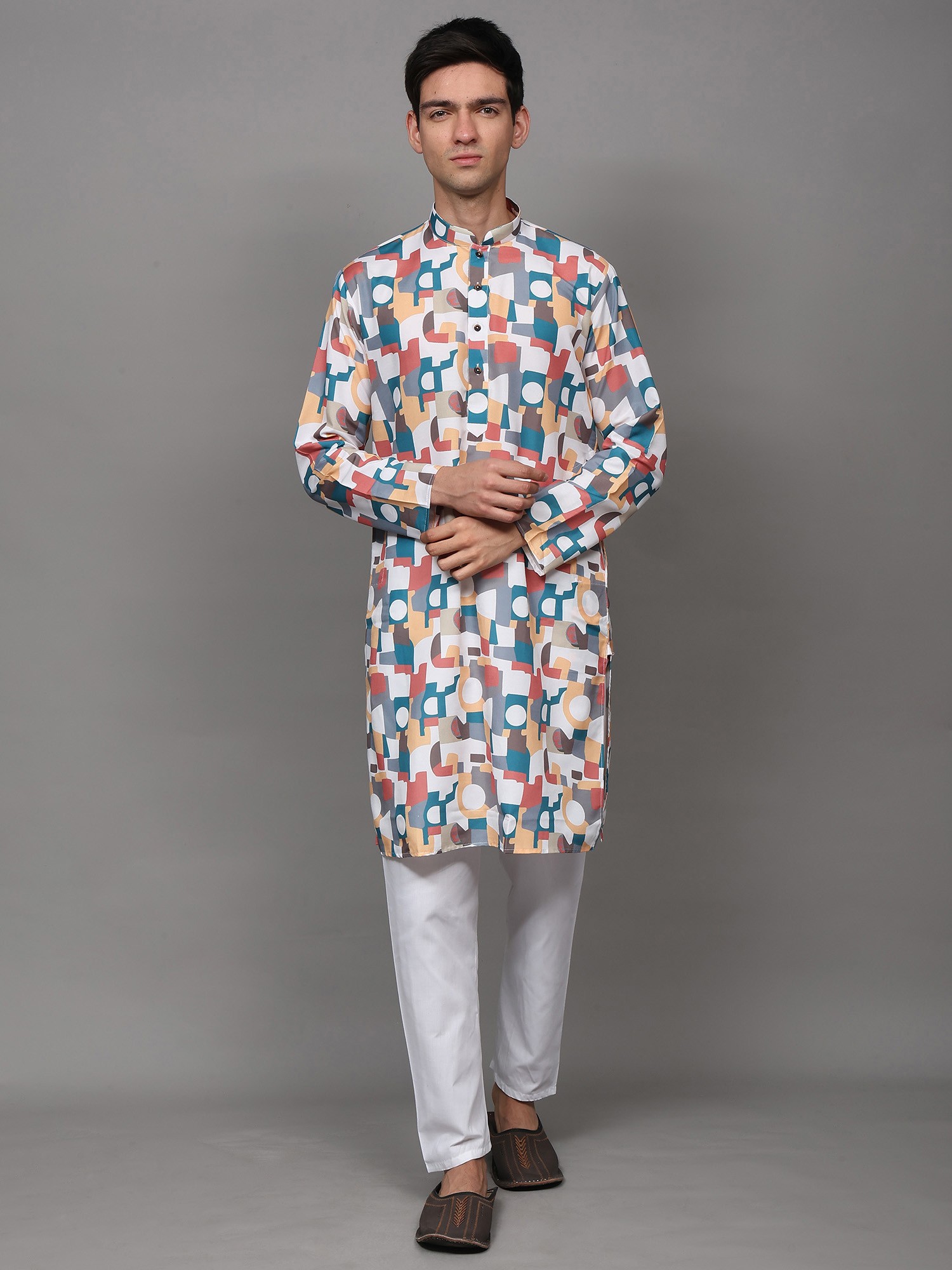 Multicolor Geometric Pattern Print Kurta with White Pajama