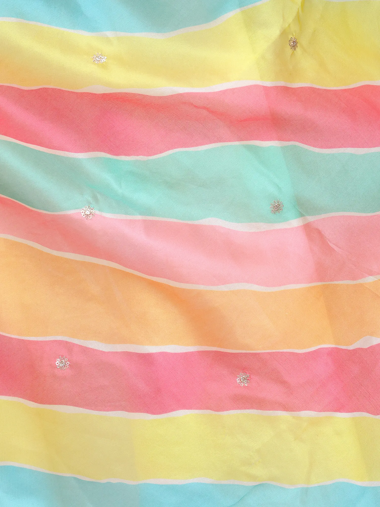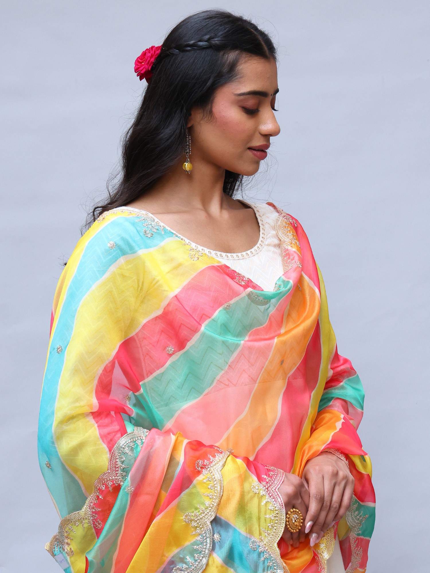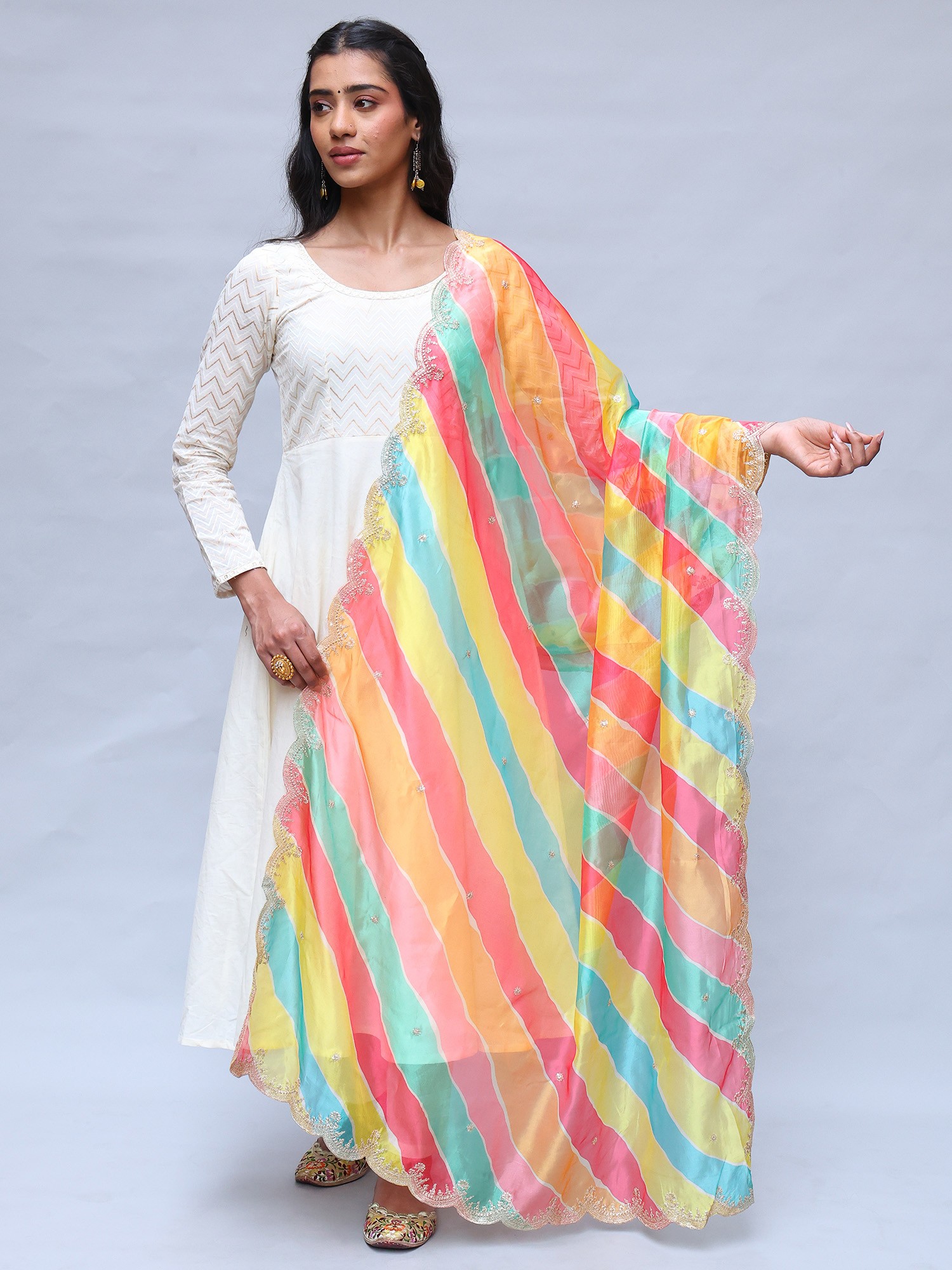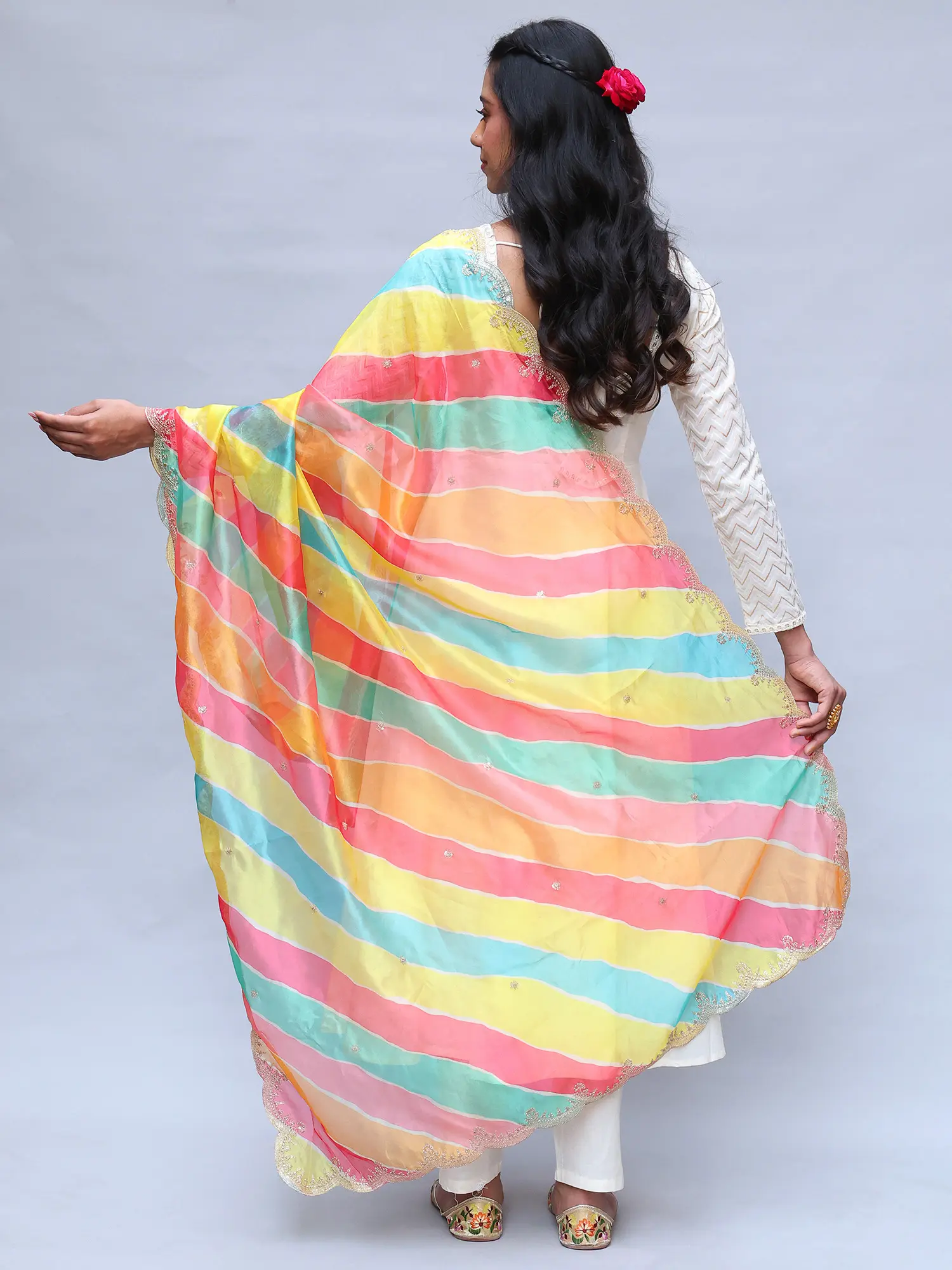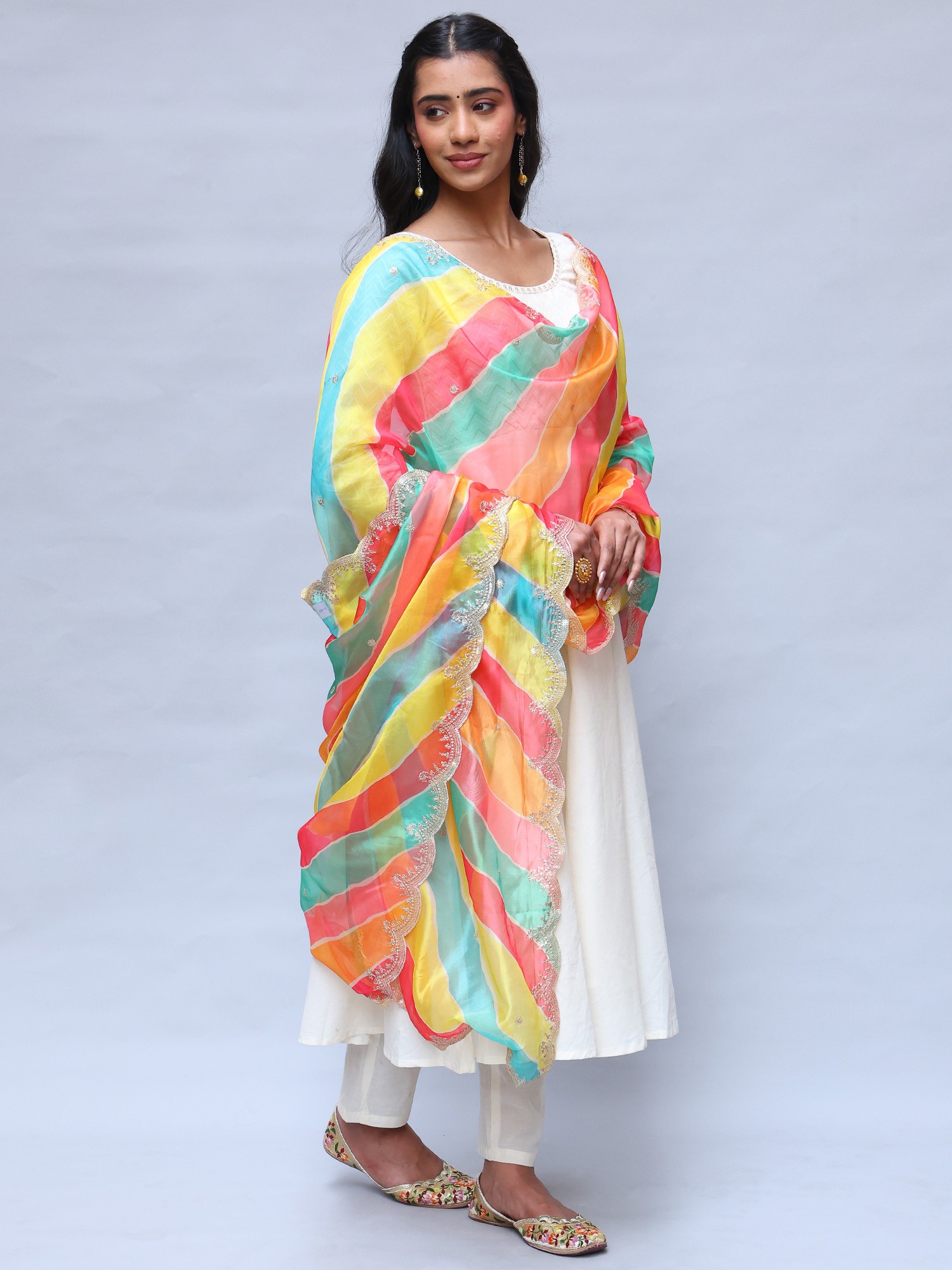 Multicolor Thread Embroidered Phulkari Dupatta with Bead-Mirror work and Scalloped Border from Amritsar