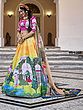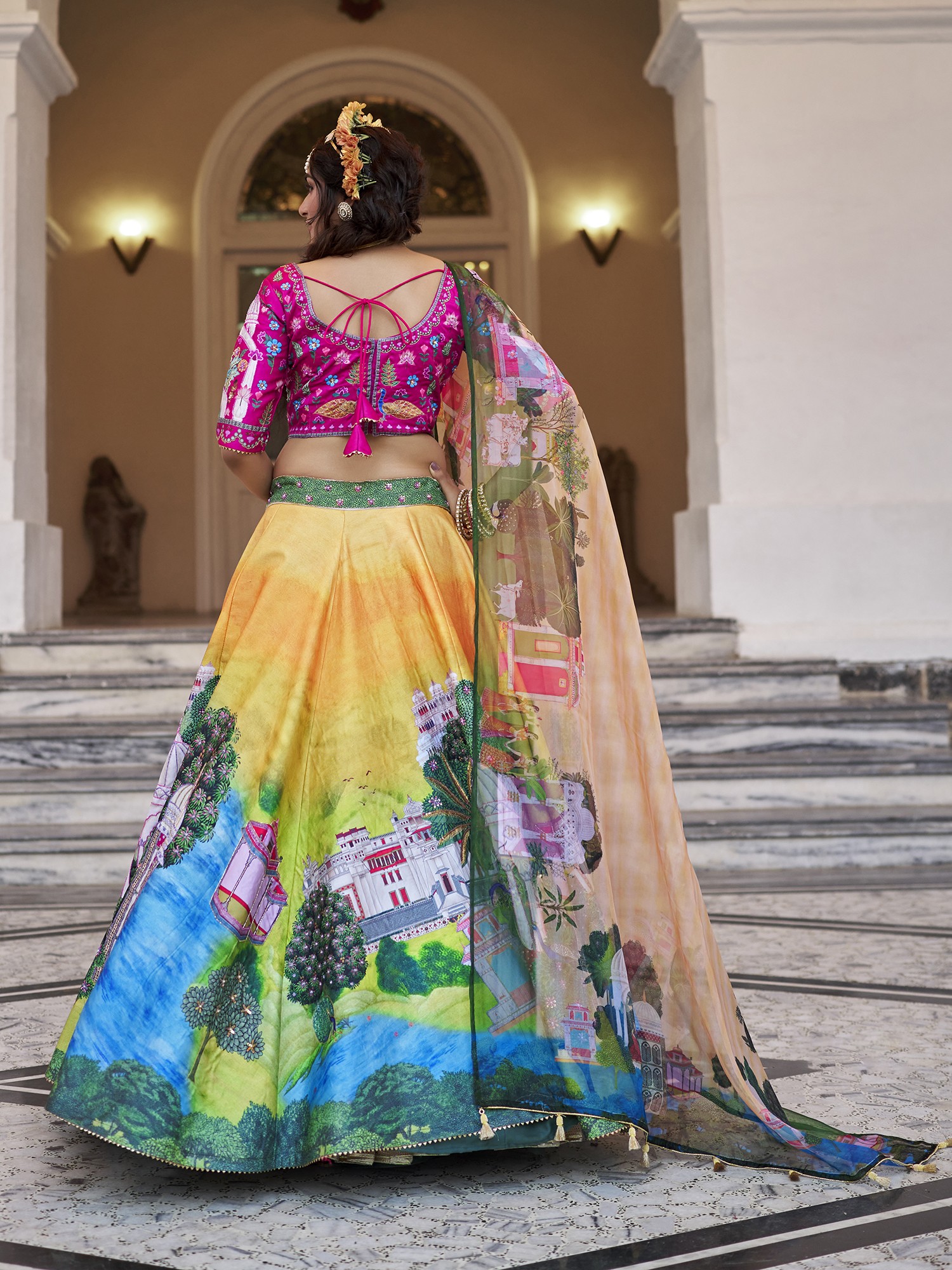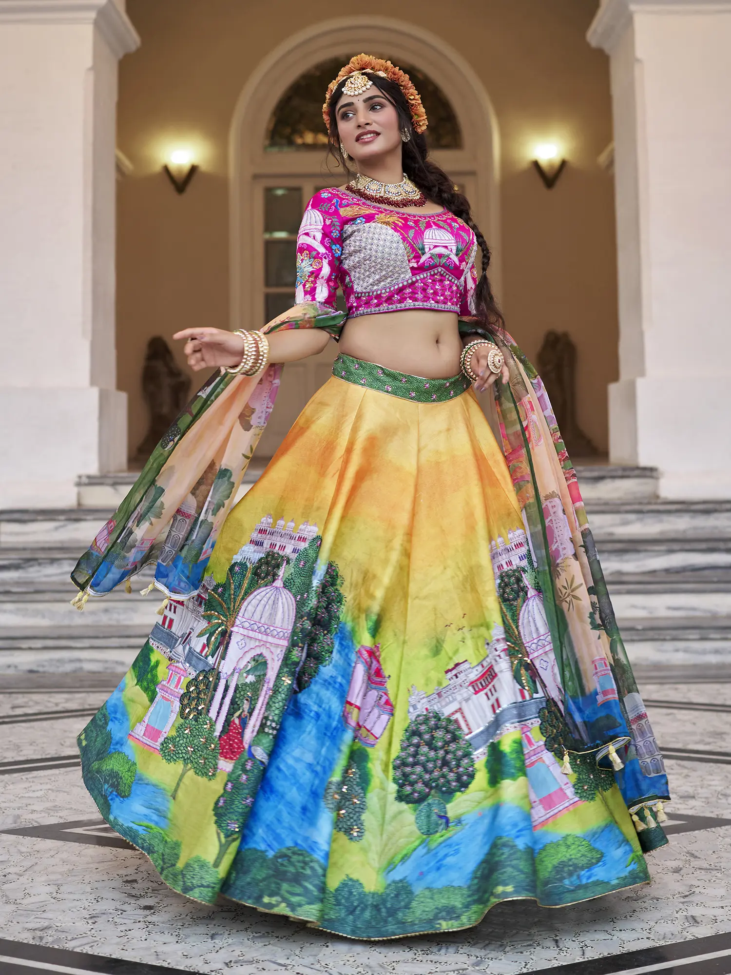 Multicolor Chinon Silk Printed Flared Party Wear Lehenga Choli With Art Silk Dupatta