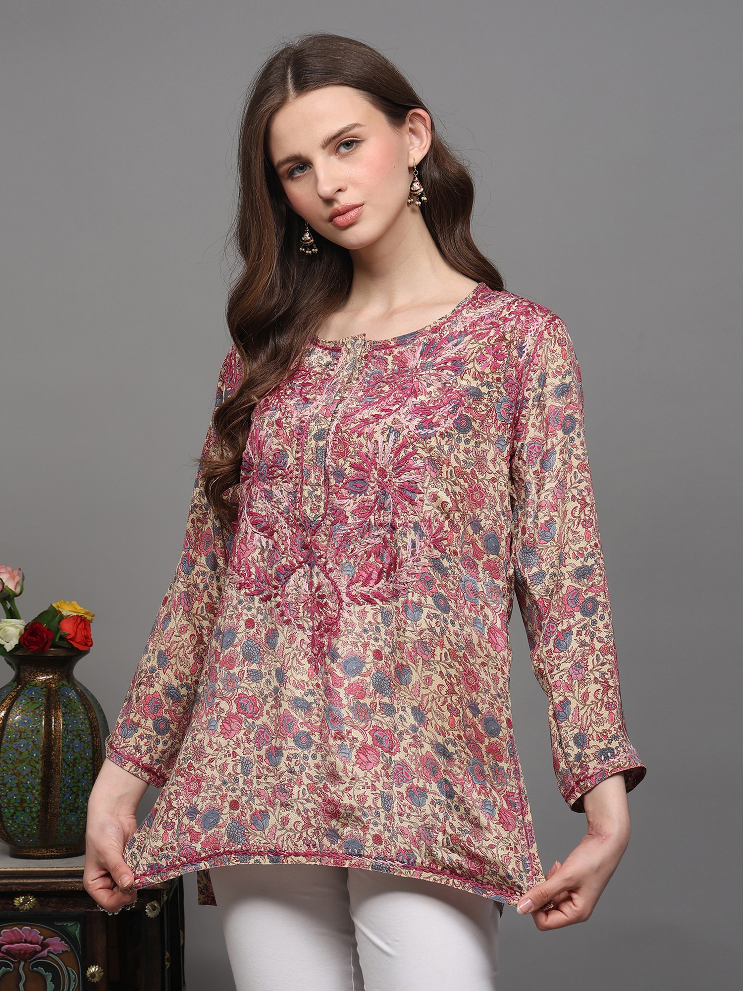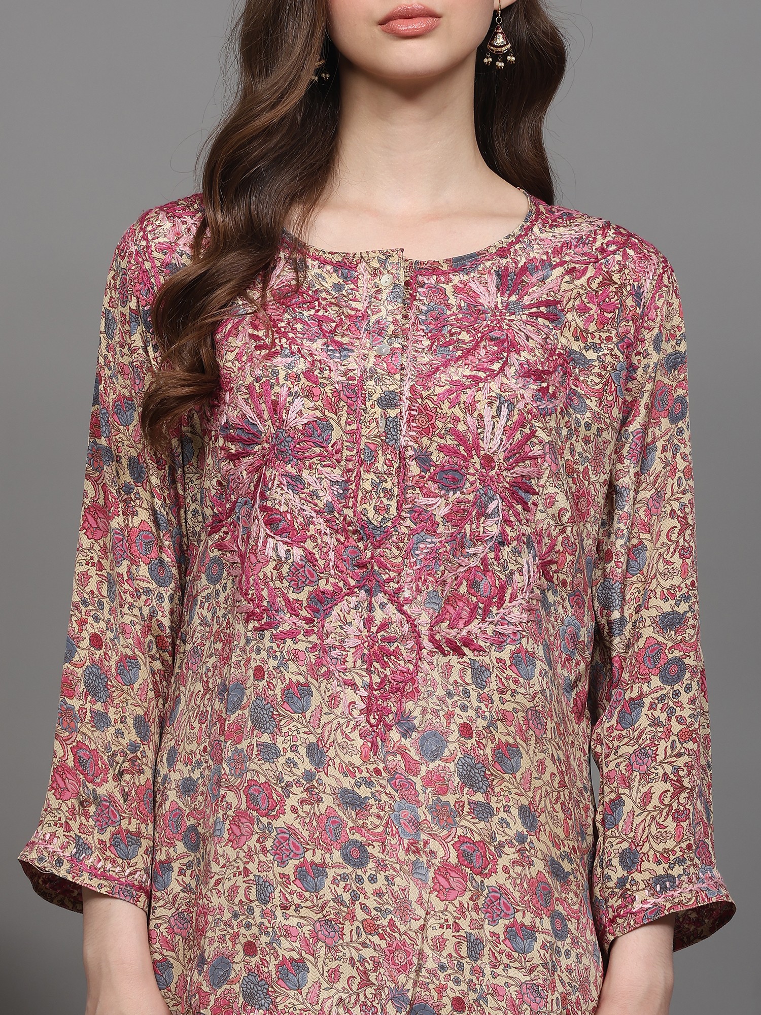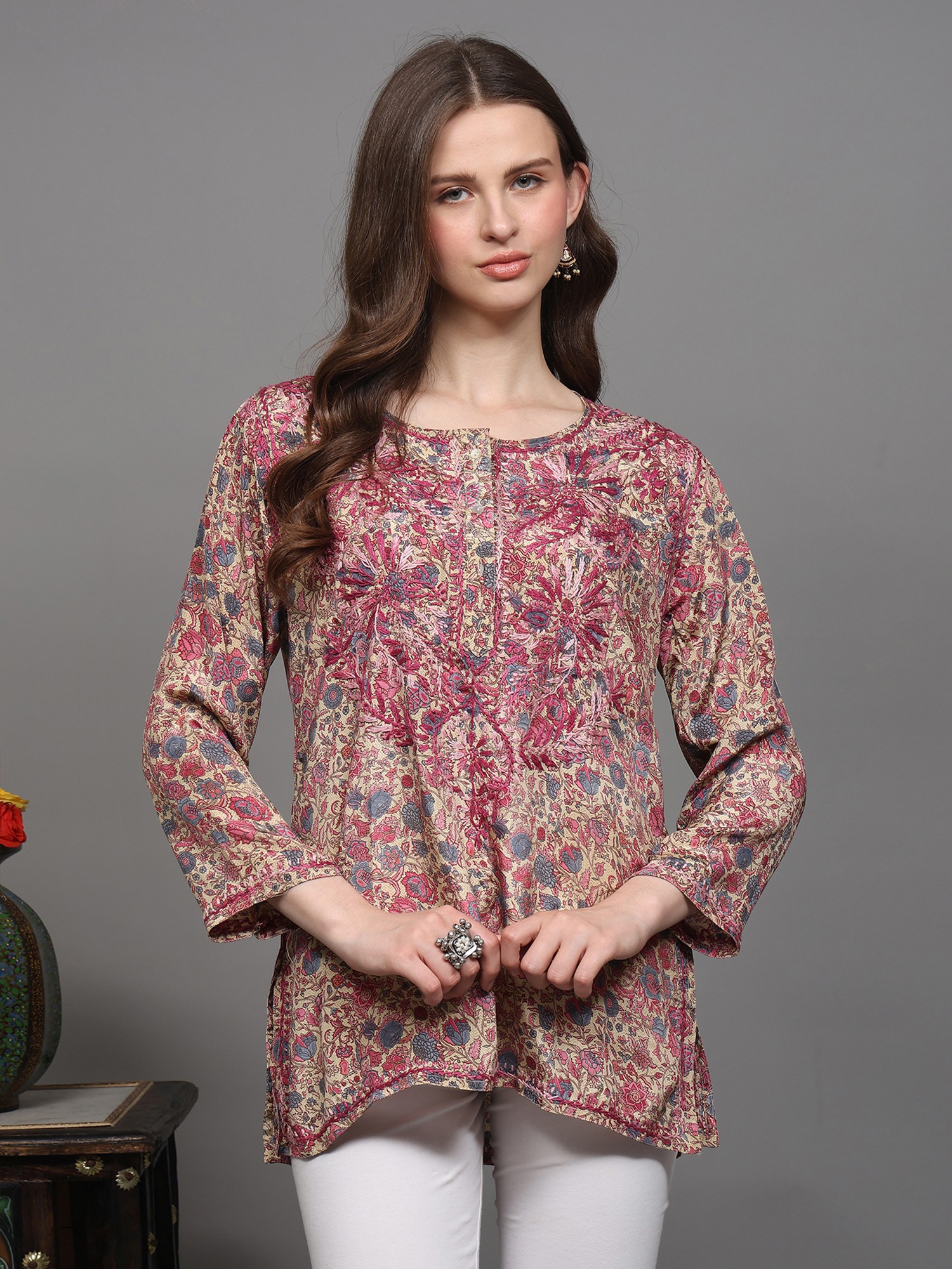 Tomato-Red Kashmiri Kurti with Hand-Embroidered Flowers
