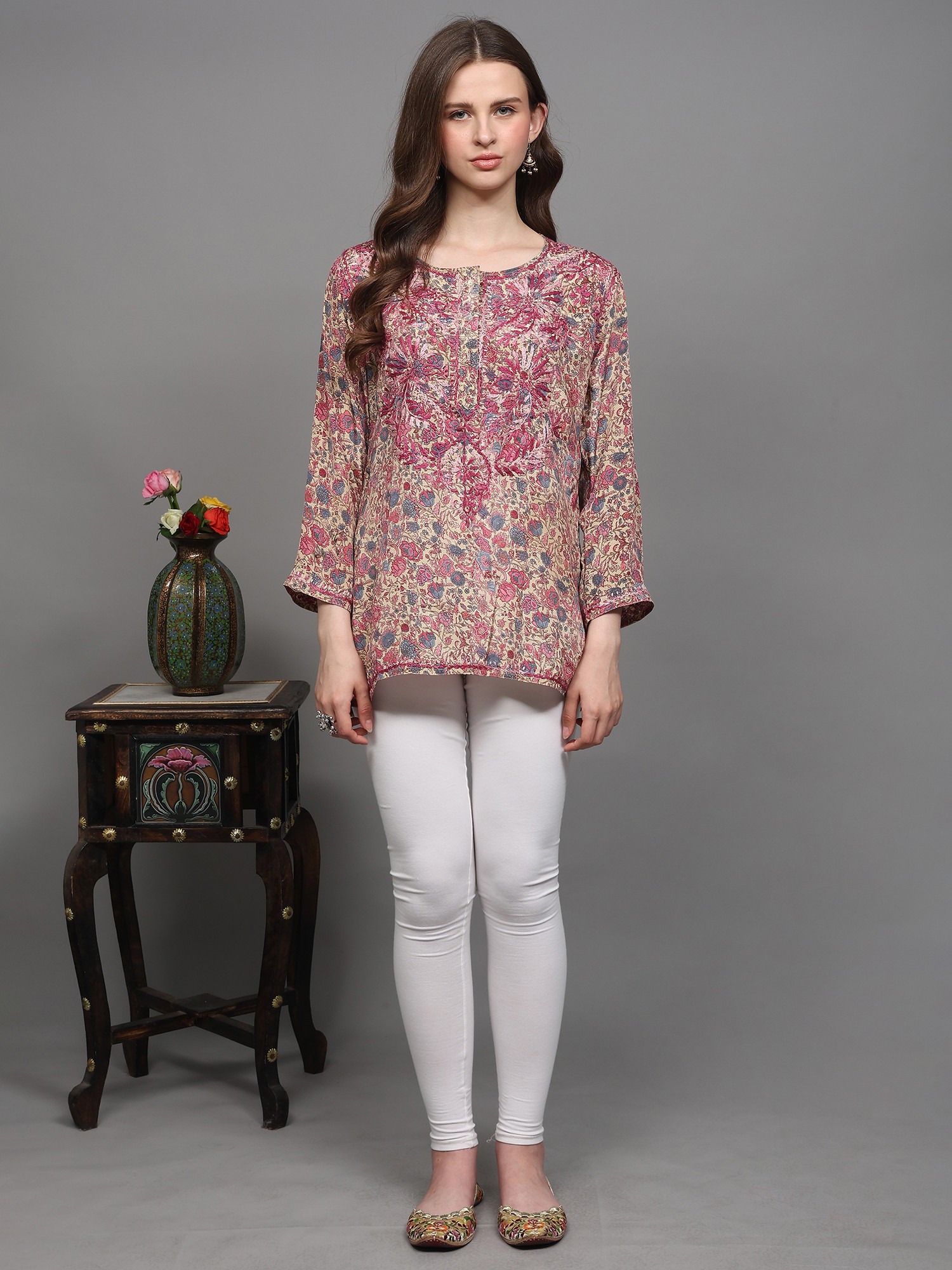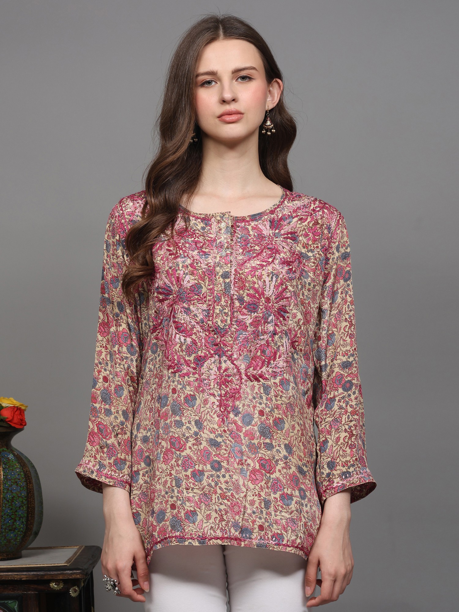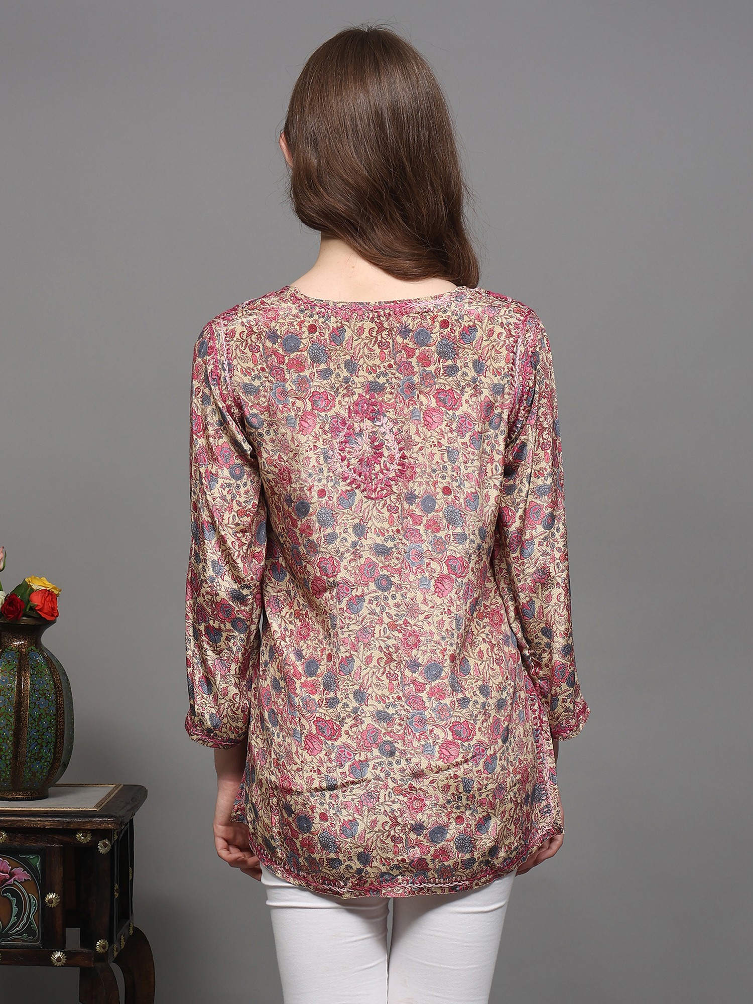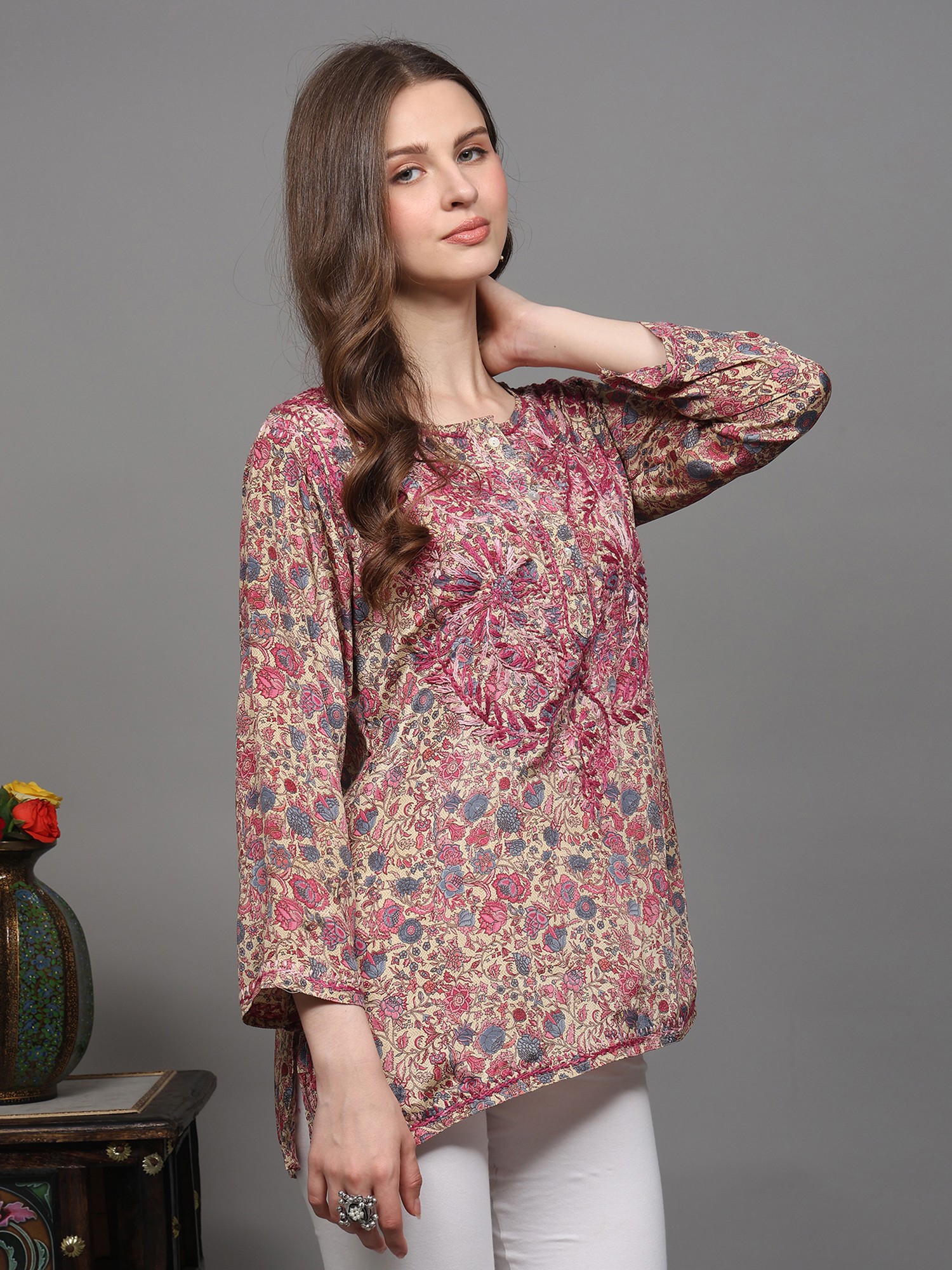 Tomato-Red Kashmiri Kurti with Hand-Embroidered Flowers