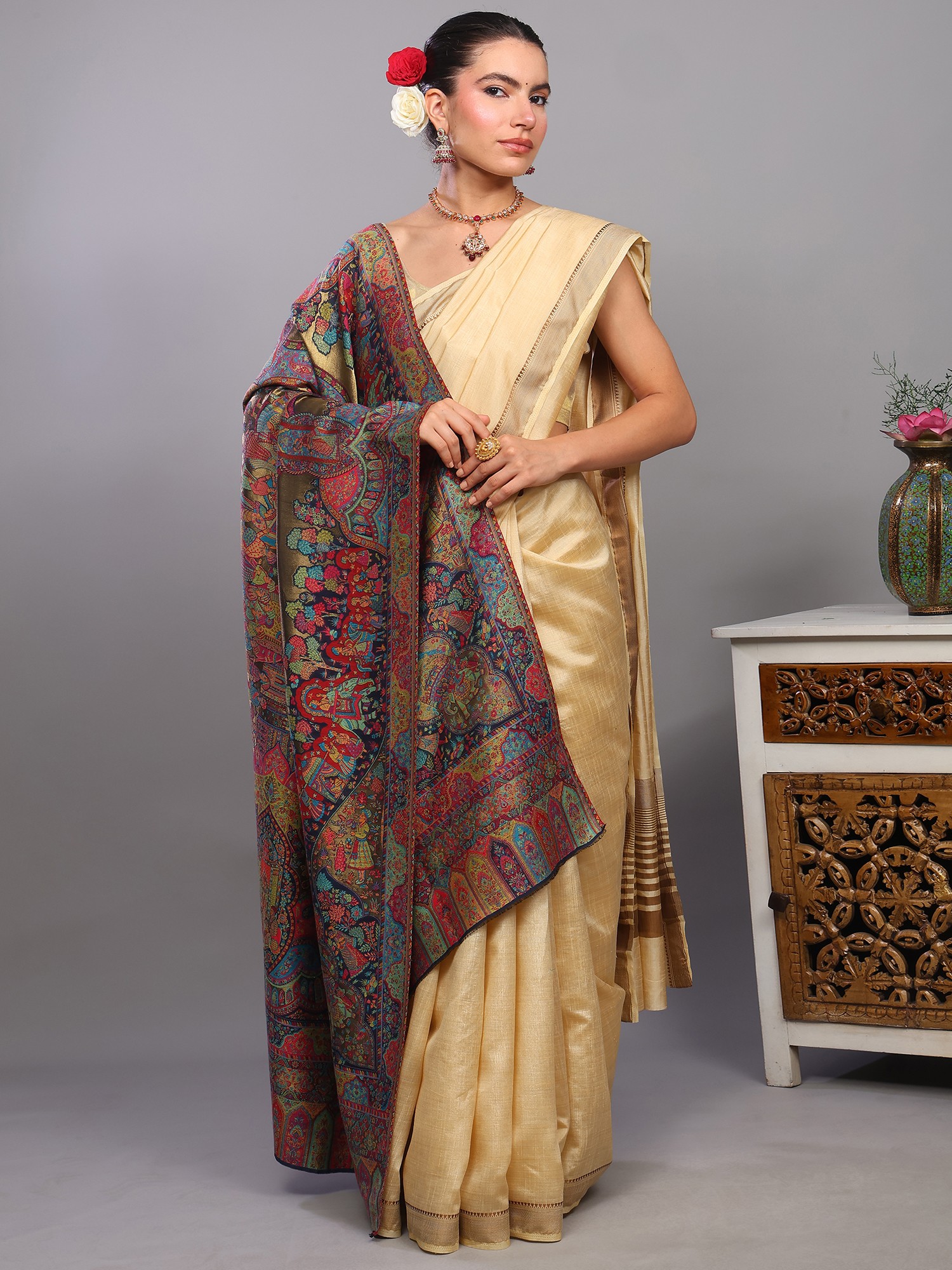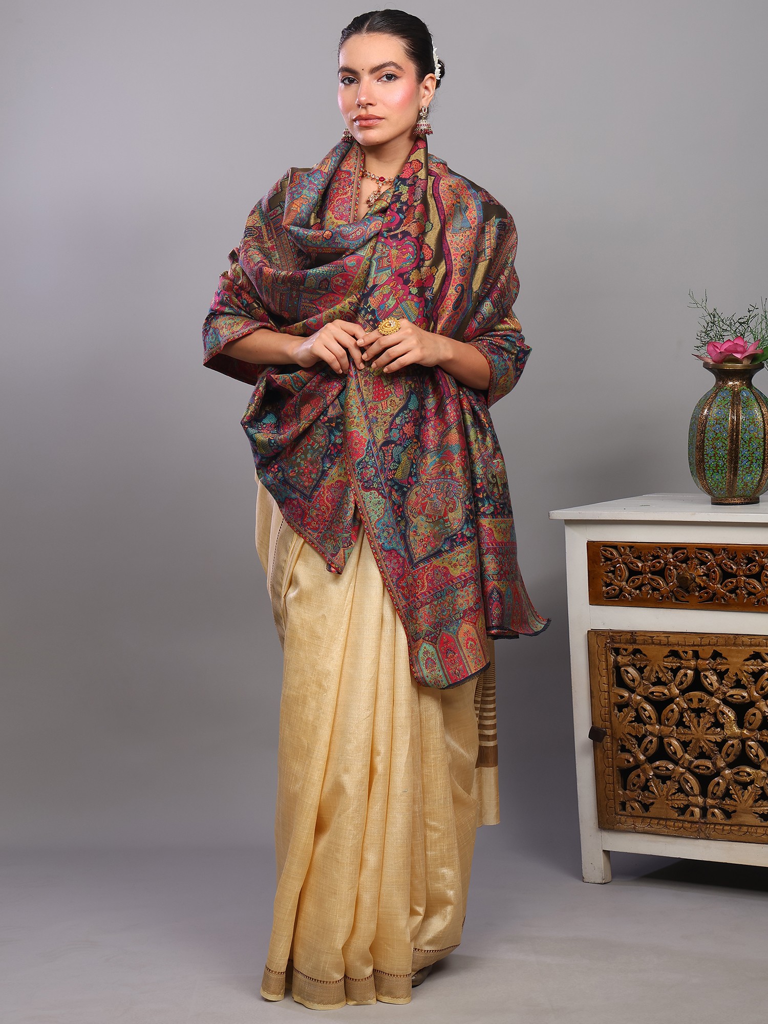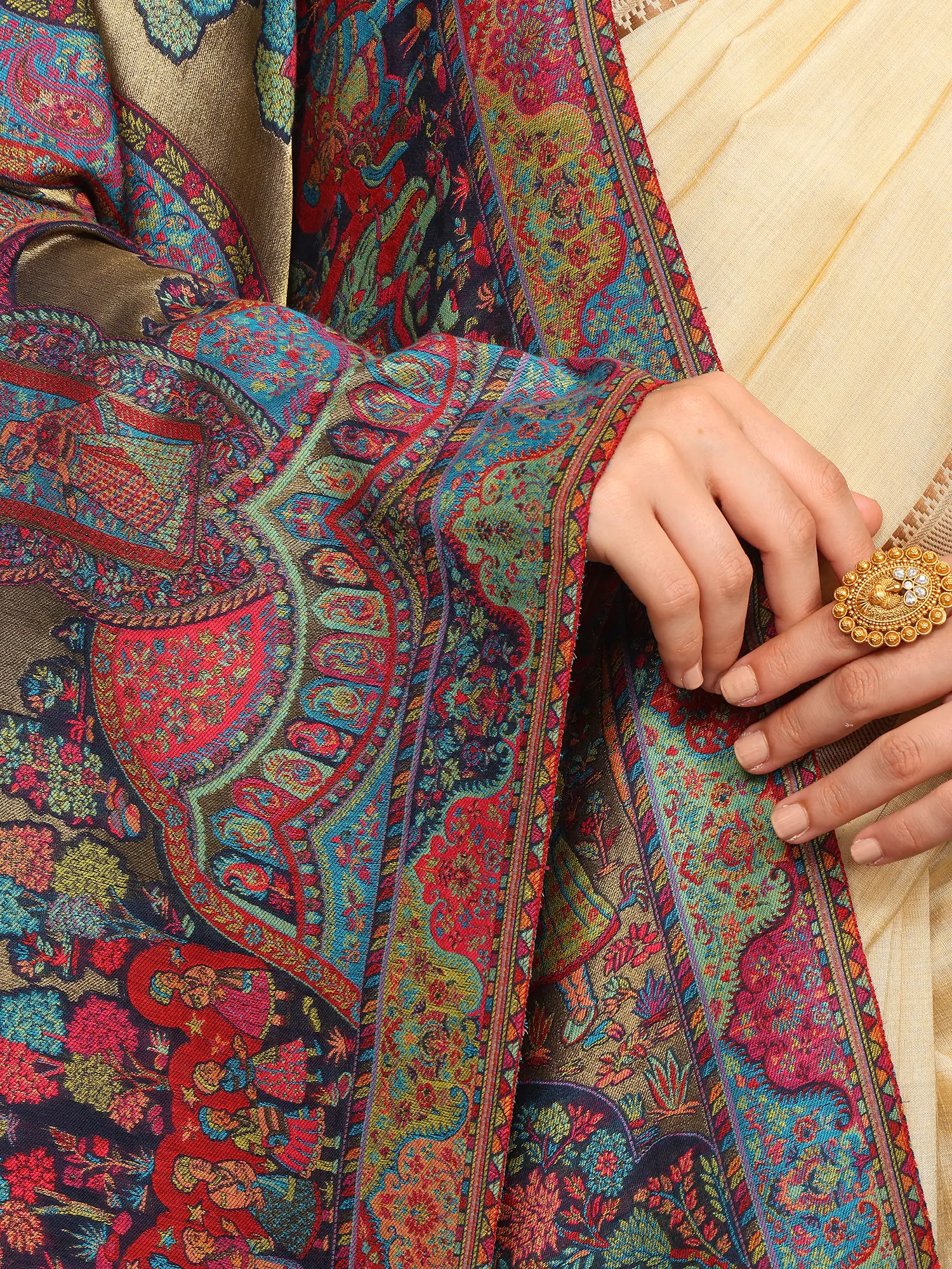 Cuban-Sand Wool Shawl with Intricate Zari Woven Paisley Kani Border