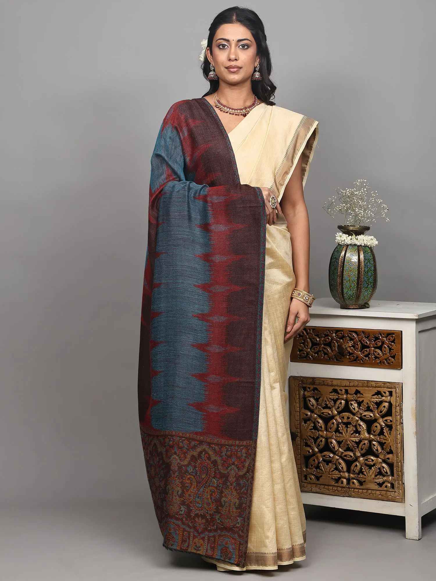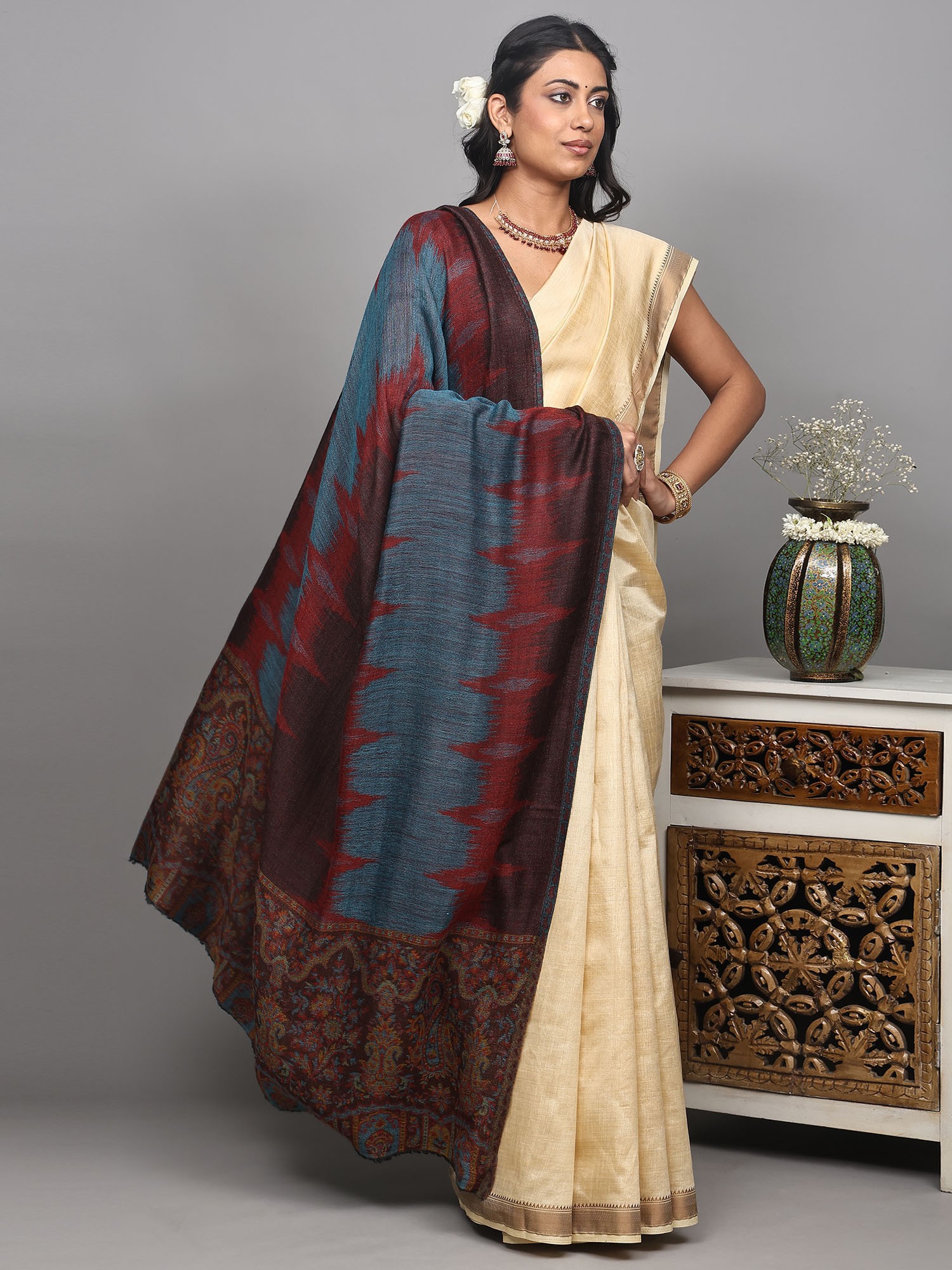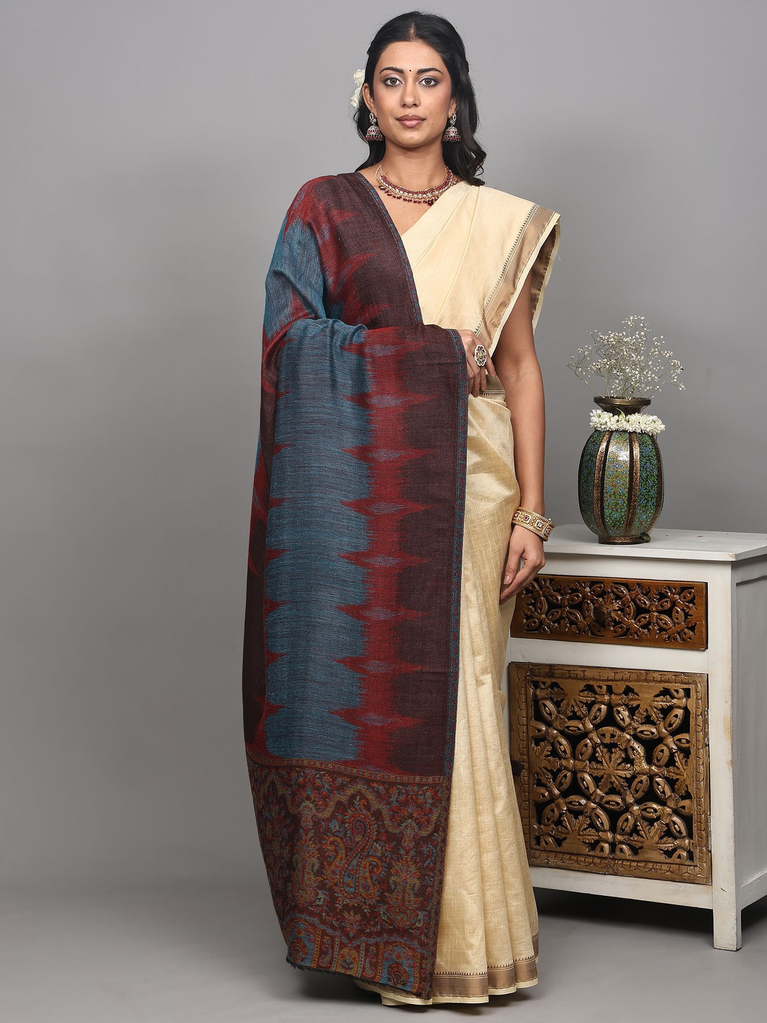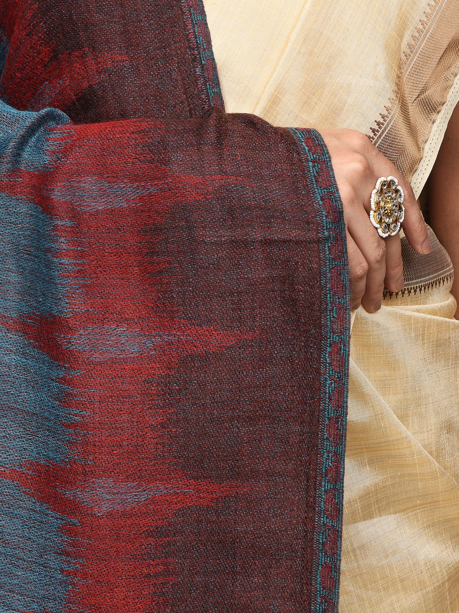 Rythmic-Red Reversible Kani Stole with Woven Giant Paisleys from Amritsar