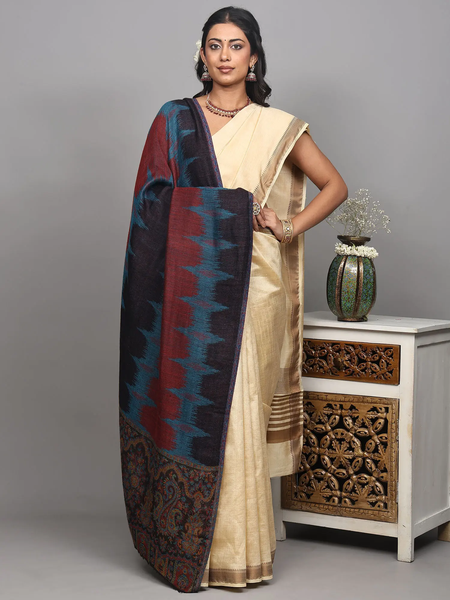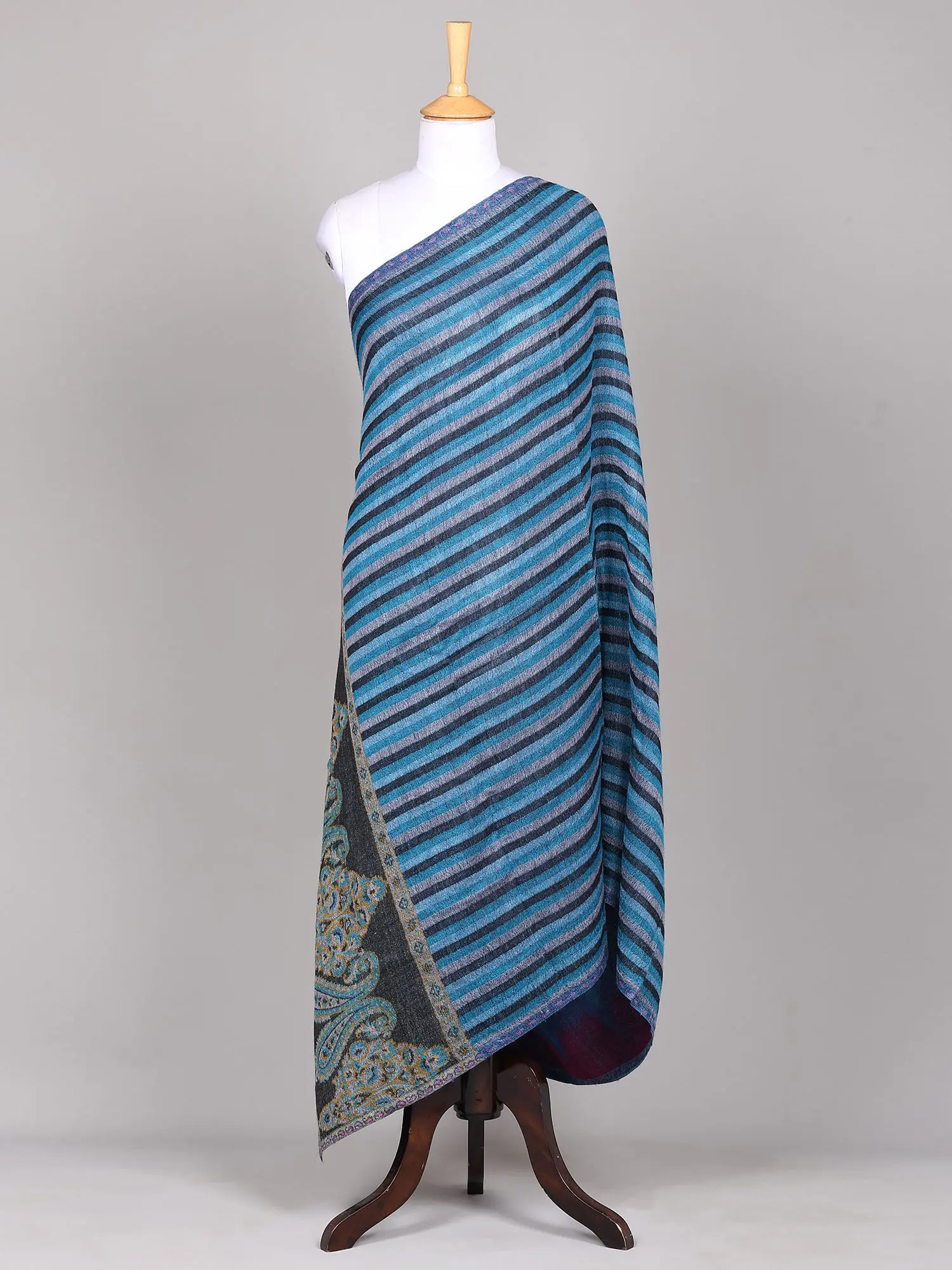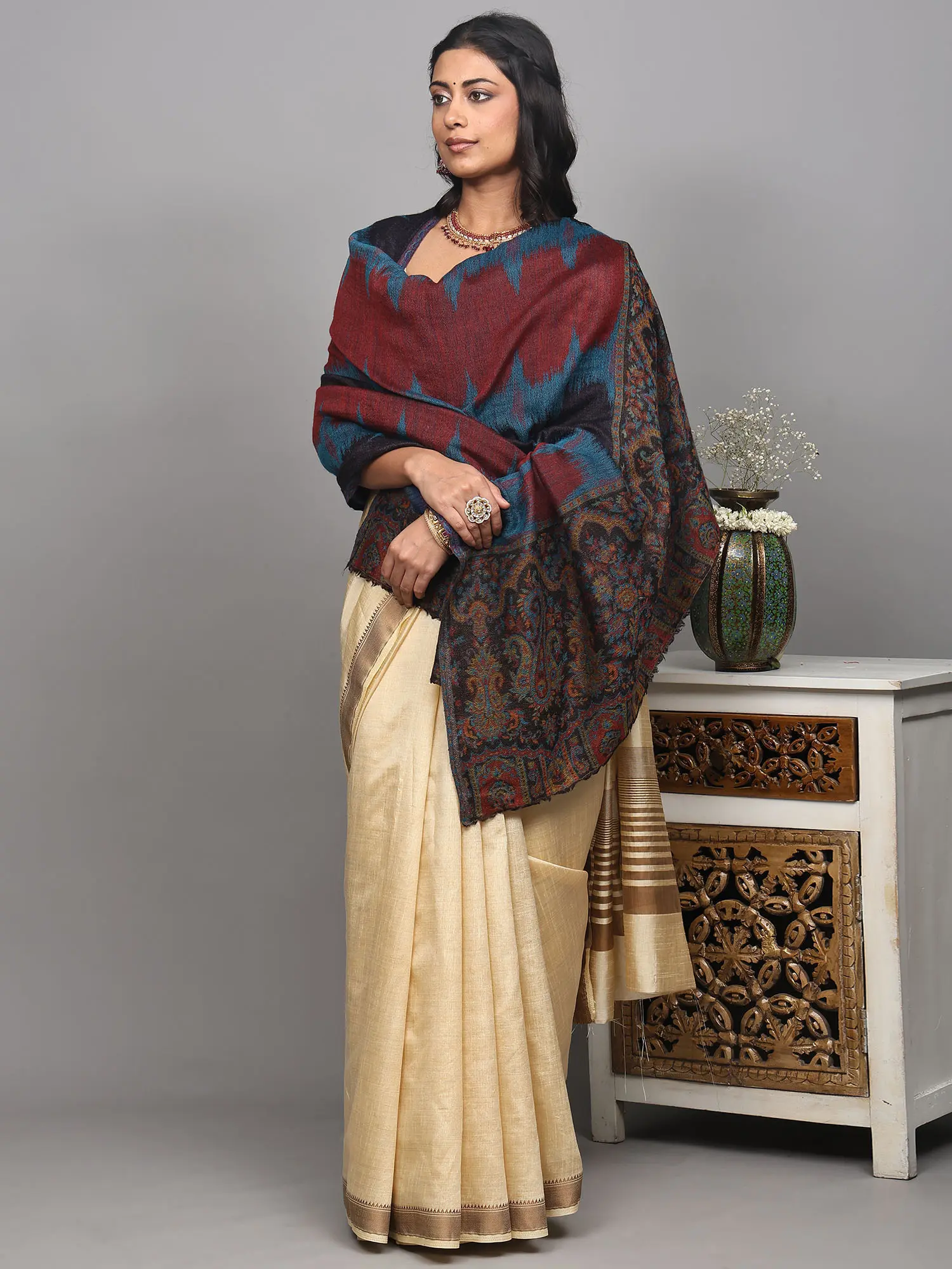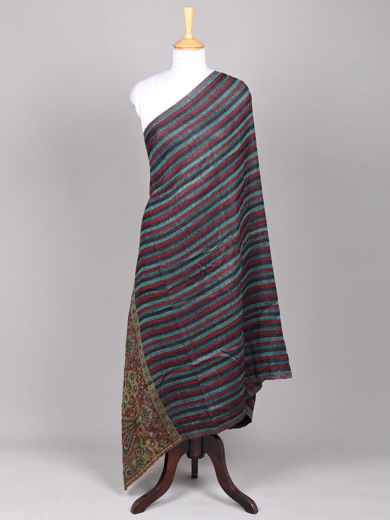 Woolen Stole from Amritsar with Embroidered Patch Border and Woven Stripes