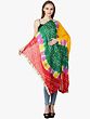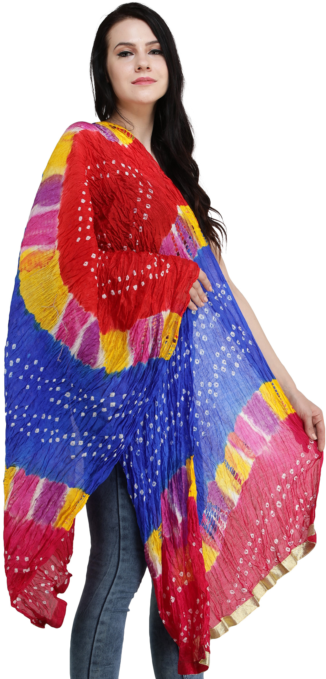 This beautiful crinkled dupatta is an ideal addition to your ethnic wear collection. This tie-dye dupatta has a unique bandhani design which gives it a vibrant look. The border of this dupatta is designed using gota work, with a golden lock giving it a traditional yet contemporary feel. The multicoloured Dupatta is a gorgeous piece of craftsmanship. The multicolour feature adds extra charm to the dupatta for a free and effortless look.