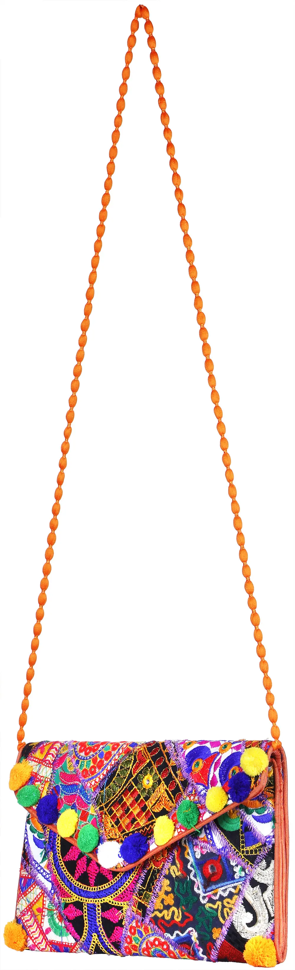 Elevate your simple ethnic look with a touch of traditional glamour that this multicolor embroidered clutch carries. With a long strap and front flap, the bag is beautified by classic mirrorwork and embroidery that is inspired by the ethnic tapestry of Indian textiles.