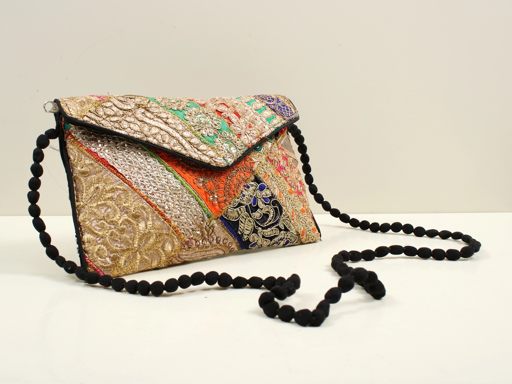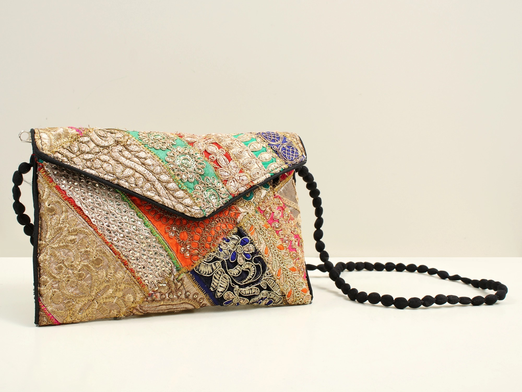 Multicolored Ethnic Zari Sequin Embroidered Handcrafted Clutch Bag with Damru Dori from Jaipur