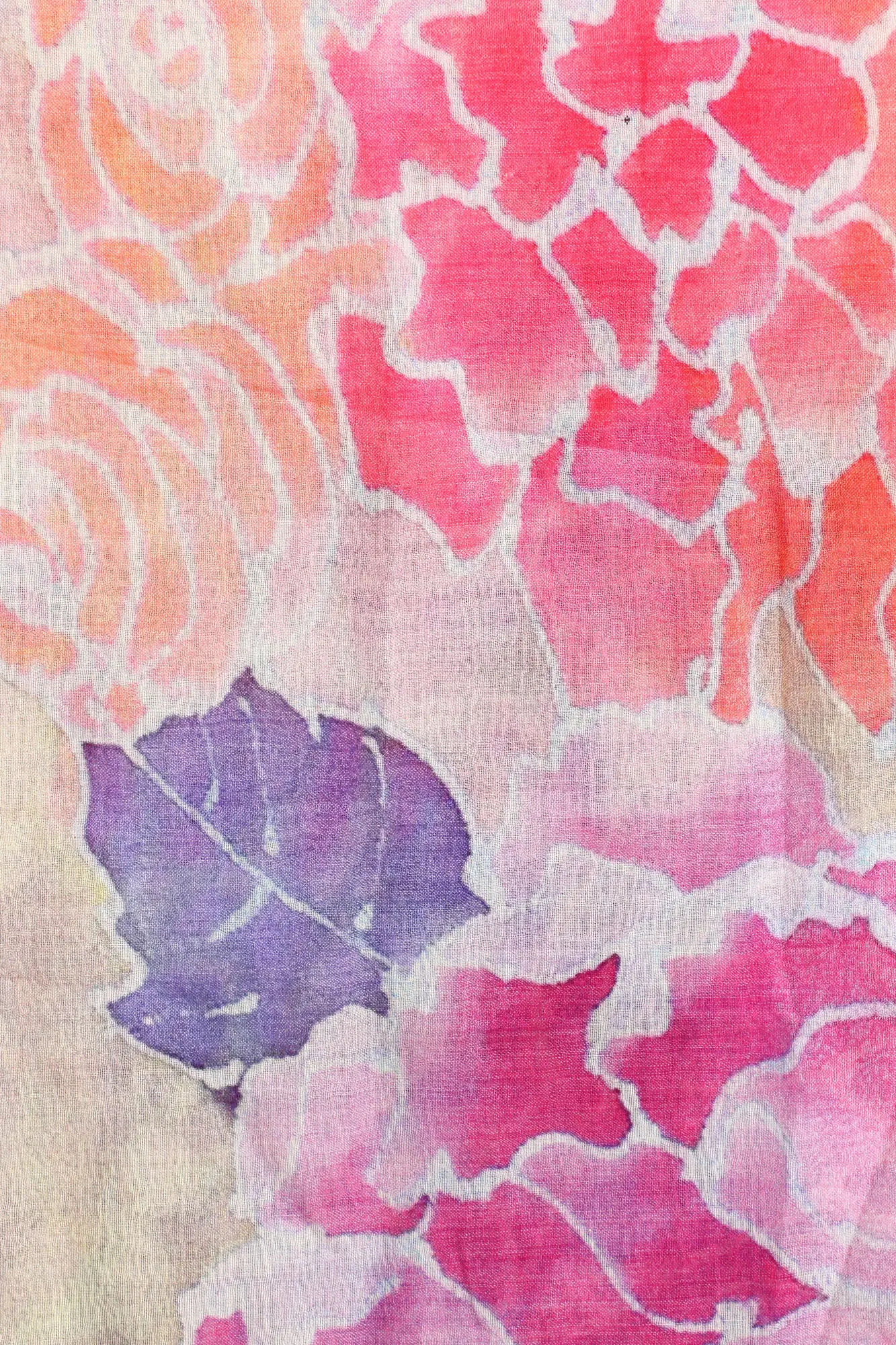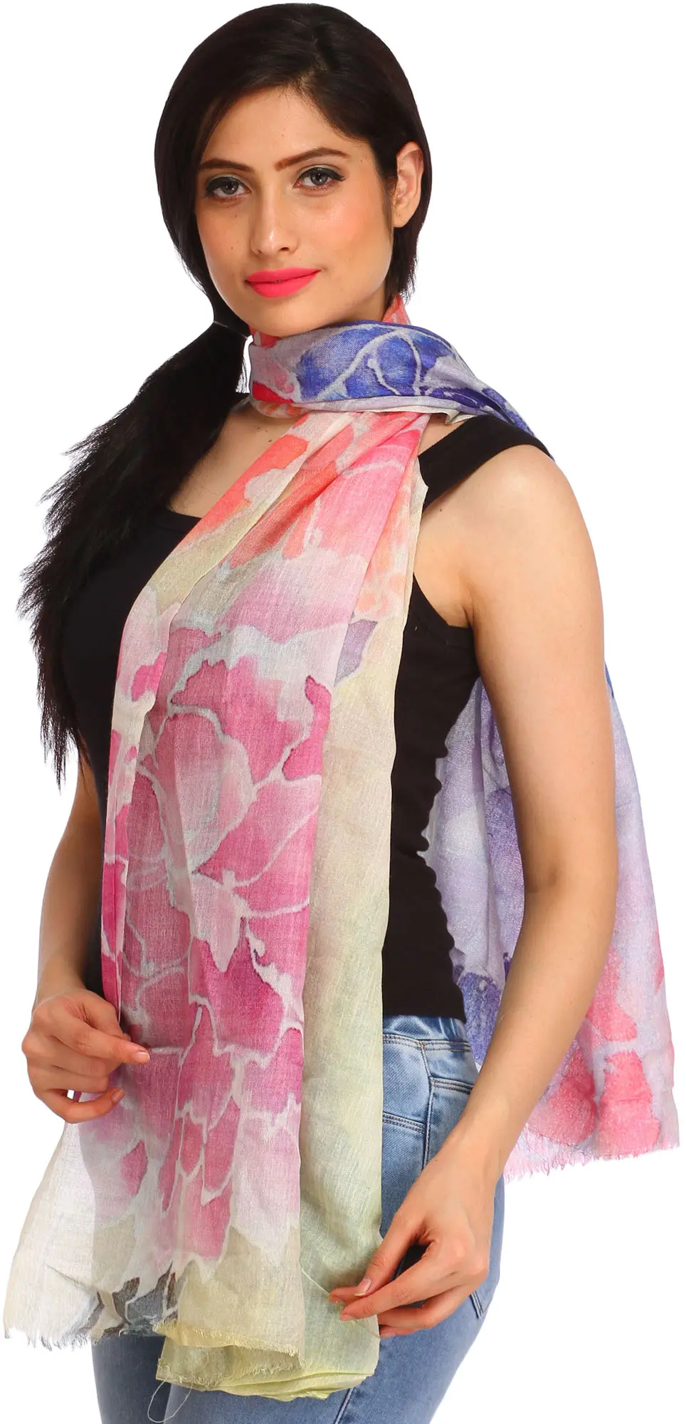 The stole is adorned with a breathtaking digital print featuring a cascade of roses. The artistry lies in the delicate rendering of these floral motifs, which appear almost painterly. The colors transition seamlessly, creating a mesmerizing gradient effect. Deep, rich blues and vibrant purples form the base of lush foliage, interspersed with soft pinks, fiery corals, and gentle oranges that bring the roses to life. This intricate design captures the essence of blooming flowers in a modern, artistic interpretation. The digital printing technique ensures that every detail is sharp and the colors remain vivid, even with repeated wear.