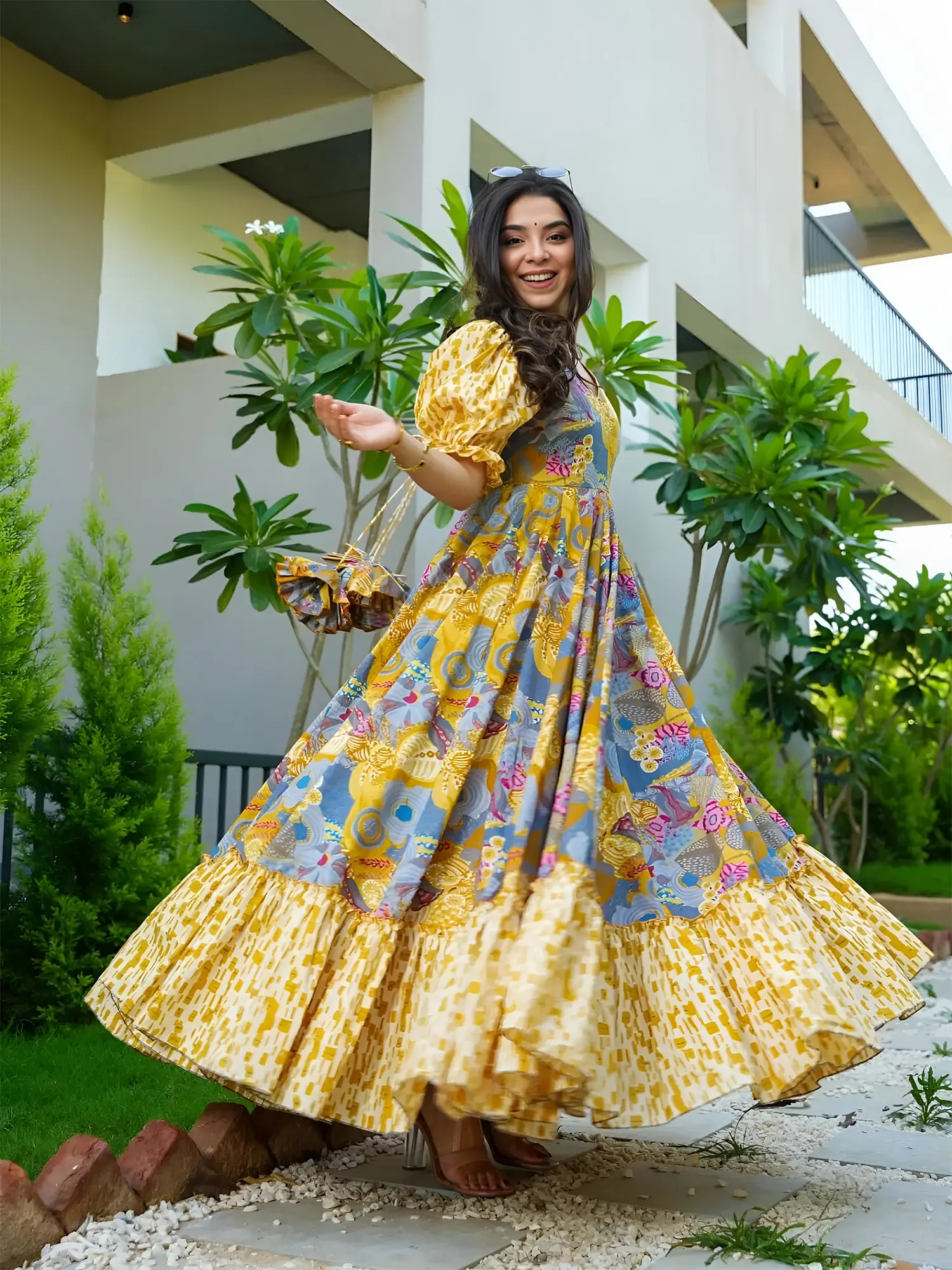 Rayon Printed Tiered Gown Long Flared Maxi Dress For Everyday Wear Shopping And Small Parties For Women