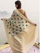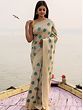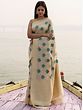 The silken field of the saree remains in a muted shade, with a distinctively large Mughal motif of a tree adorning it with a tint of colors.