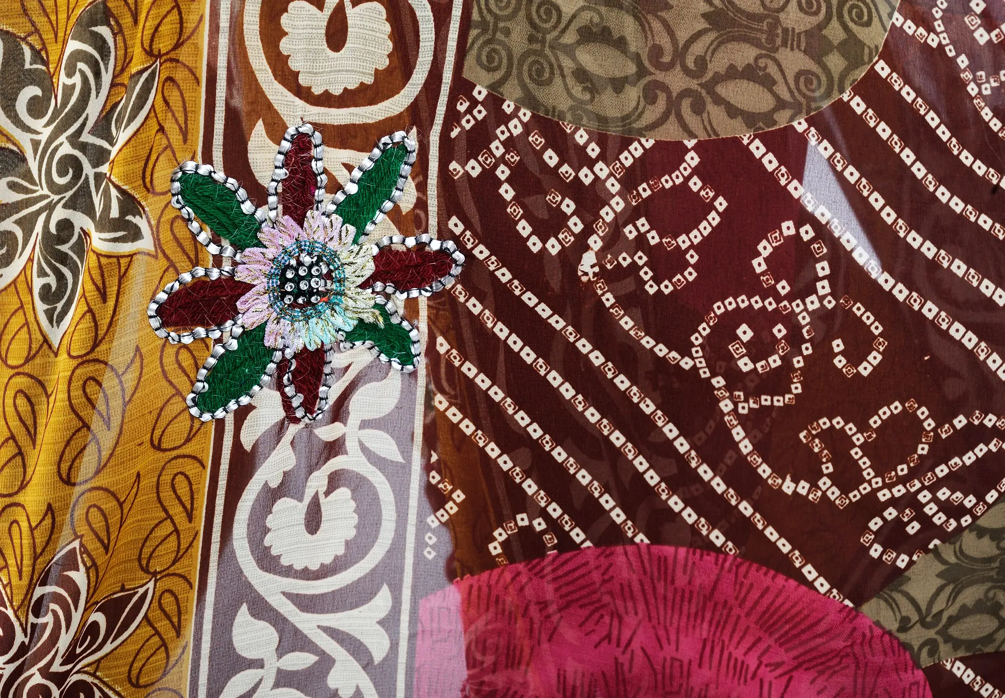 The true charm of this sari lies in its exquisite prints. Delicate paisleys, the quintessential motif symbolizing prosperity and fertility, are interspersed with charming floral designs. Each motif is rendered with precision, creating a visual feast for the eyes. Adding a touch of opulence, some of these floral patterns are subtly embellished, catching the light and drawing attention to the sari's unique artistry. The interplay of colors, from the vibrant mustard to the earthy browns and pops of pink, creates a harmonious and visually striking composition.