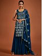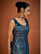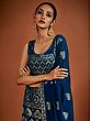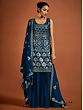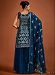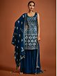 Adorn yourself in festive opulence with the Navy-Blue Georgette Sharara Suit. The richness of blue is heightened by shimmering sequin embroidery that embellishes both kurta and sharara. The intricate spade or Paan motif, an auspicious element in ethnic Indian fashion, imparts a classic Indian feel. The ensemble is perfected with a Latkan Dupatta, creating a resplendent combination of tradition and glamour. This suit is a captivating choice for those who seek to embody the timeless beauty and cultural richness of Indian ethnic wear with a touch of contemporary elegance.