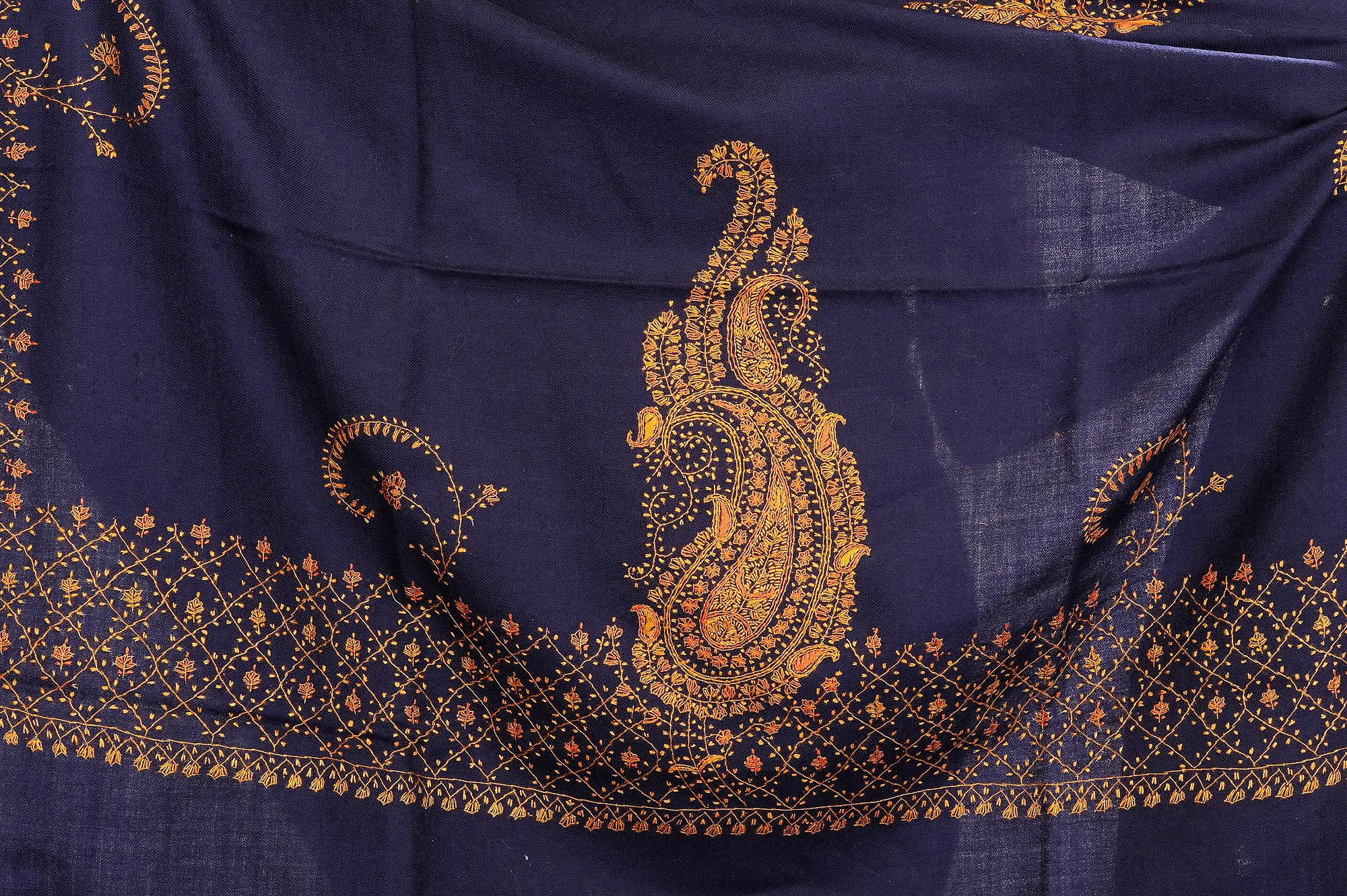 Each paisley and floral swirl is meticulously hand-embroidered by skilled artisans, a testament to generations of passed-down expertise. The golden-orange thread creates a striking contrast against the navy background, making the patterns pop with a captivating richness. The embroidery flows gracefully along the edges and corners, transforming this wearable art into a statement piece that speaks of refinement and cultural appreciation. Whether draped over your shoulders for a formal evening or adding a touch of opulence to a casual ensemble, this shawl is designed to elevate your style. ––––––––––
