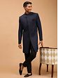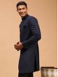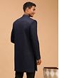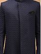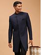 This mesmerising attire, (Navy-Blue Silk Blend Jacquard Weave Sherwani) is a sartorial masterpiece that beckons with its elegance. Crafted from a luxurious silk blend, this outfit embodies refinement and opulence. The jacquard weave adds a mesmerising texture that dances in the play of light, creating an enchanting aura. This Sherwani is not just attire, in fact, it is an embodiment of timeless style. Its deep navy hue evokes a sense of regal allure, while the intricate weave tells a story of artistry. A symphony of tradition and modernity, it drapes the wearer in sophistication. With every step, it whispers tales of grandeur and grace, an emblem of dignified masculinity.