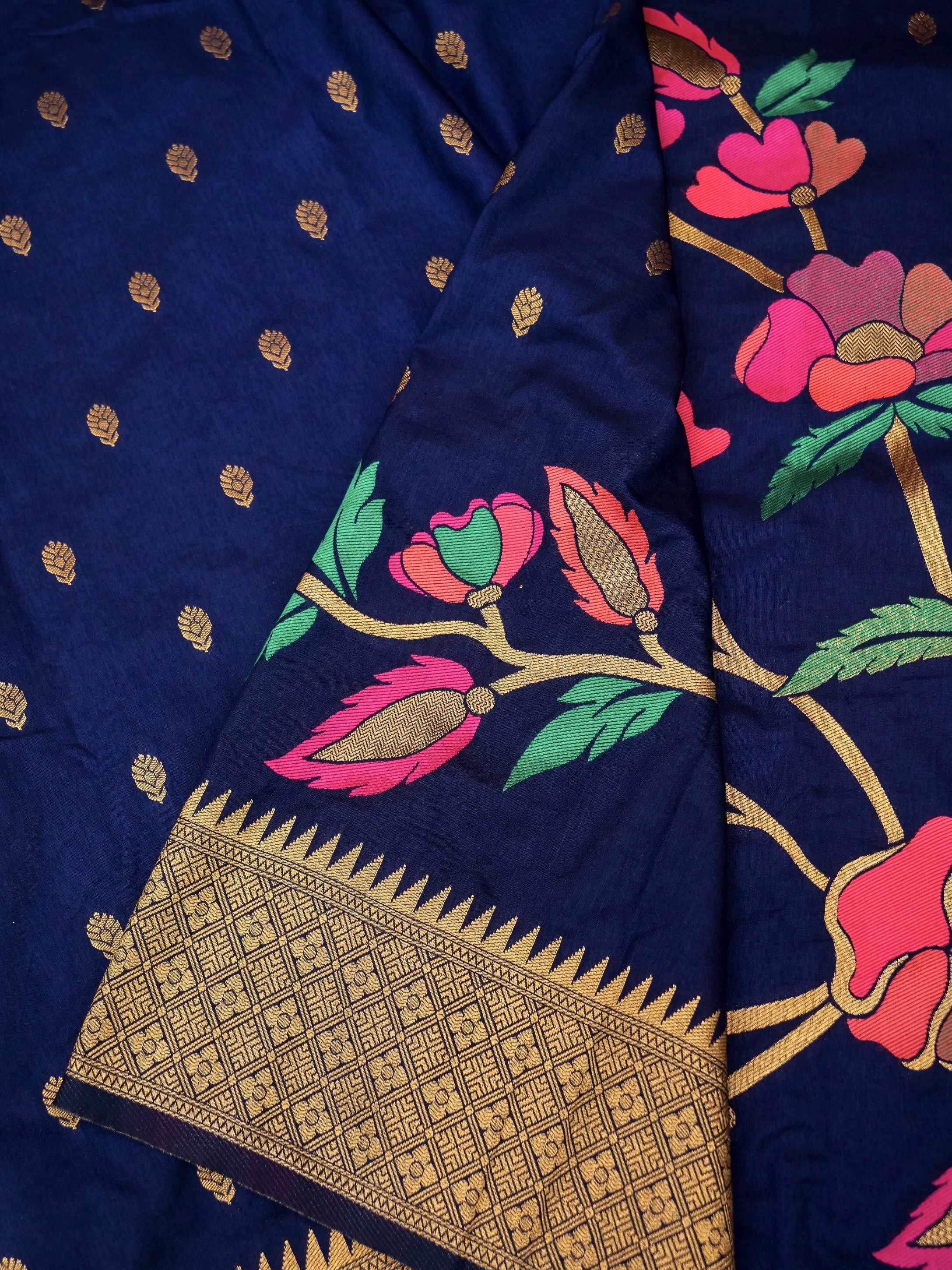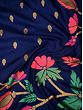 The border and the pallu of this Banarasi saree are decorated with a spread of ethnic floral patterns which bring the charm of traditional Banarasi to this piece.
