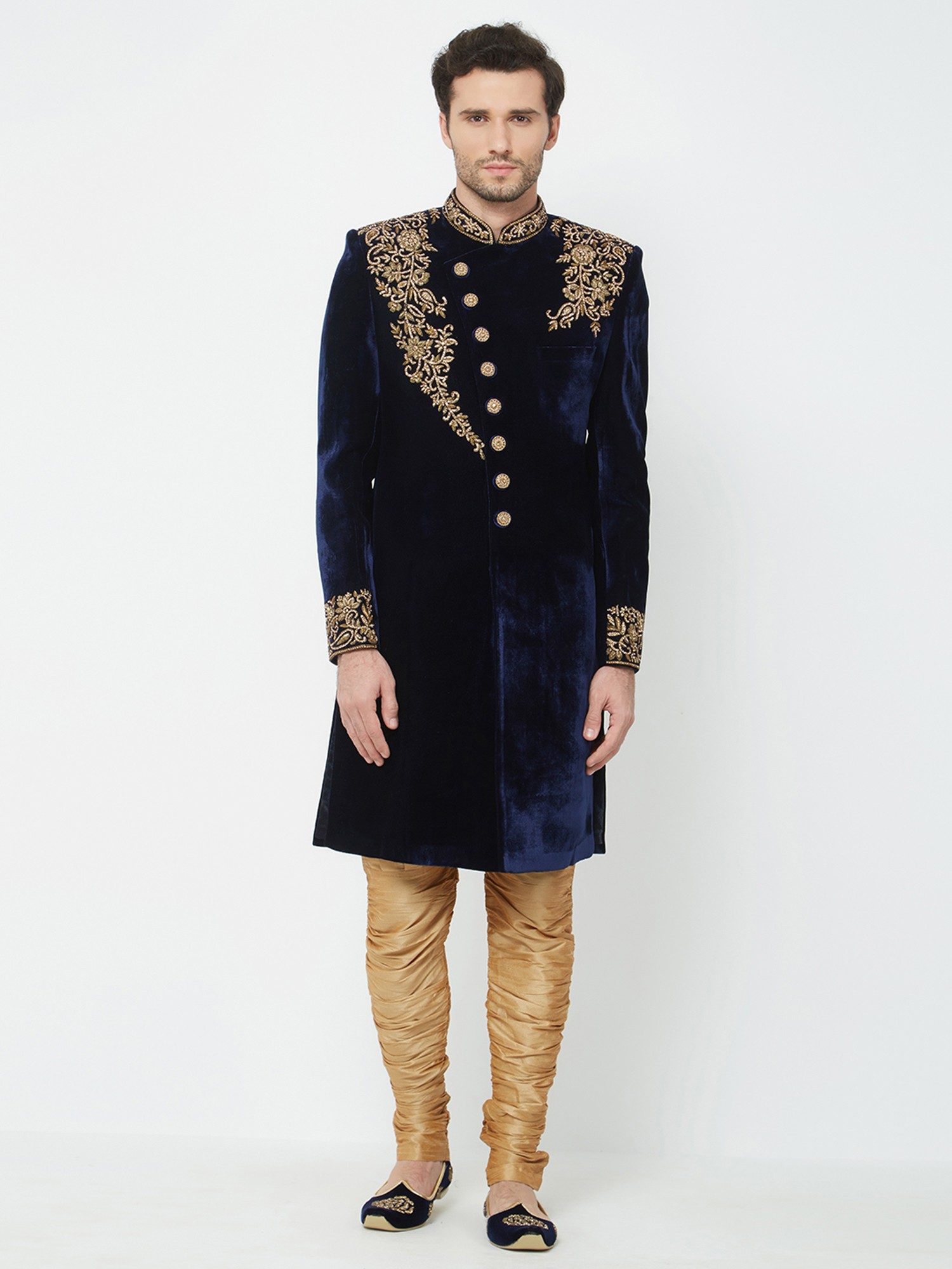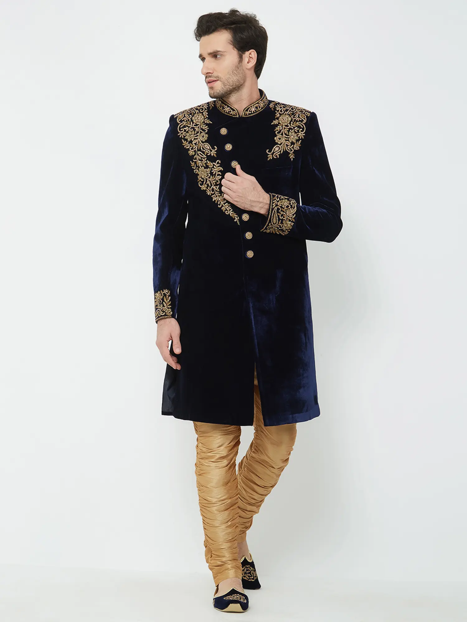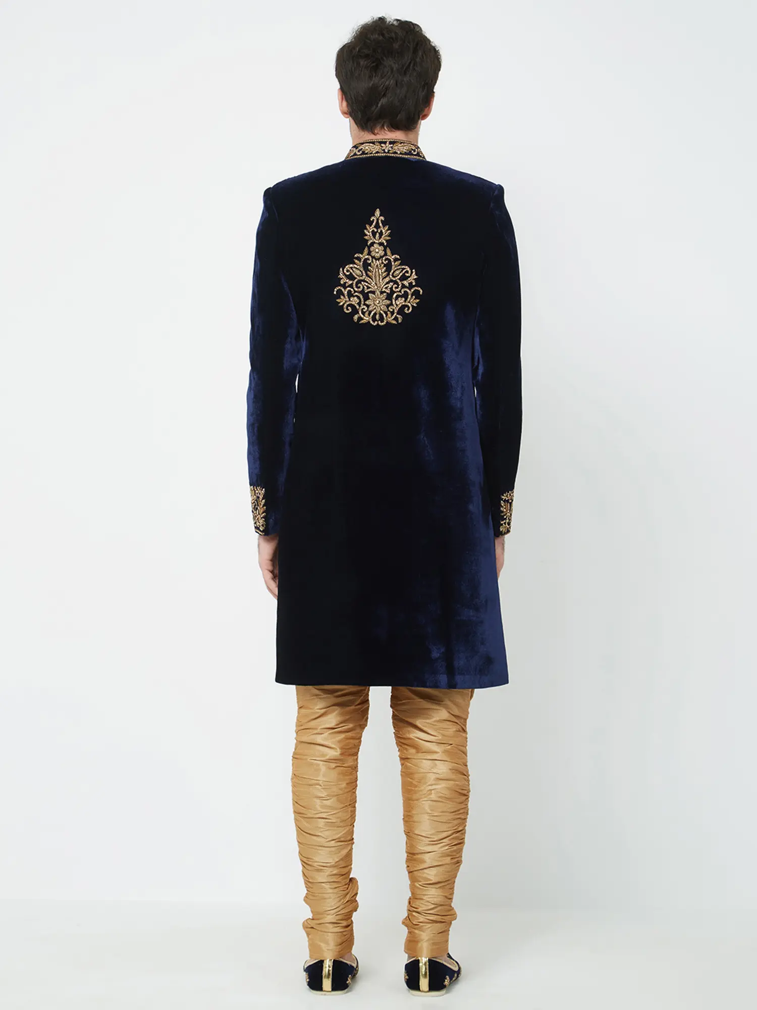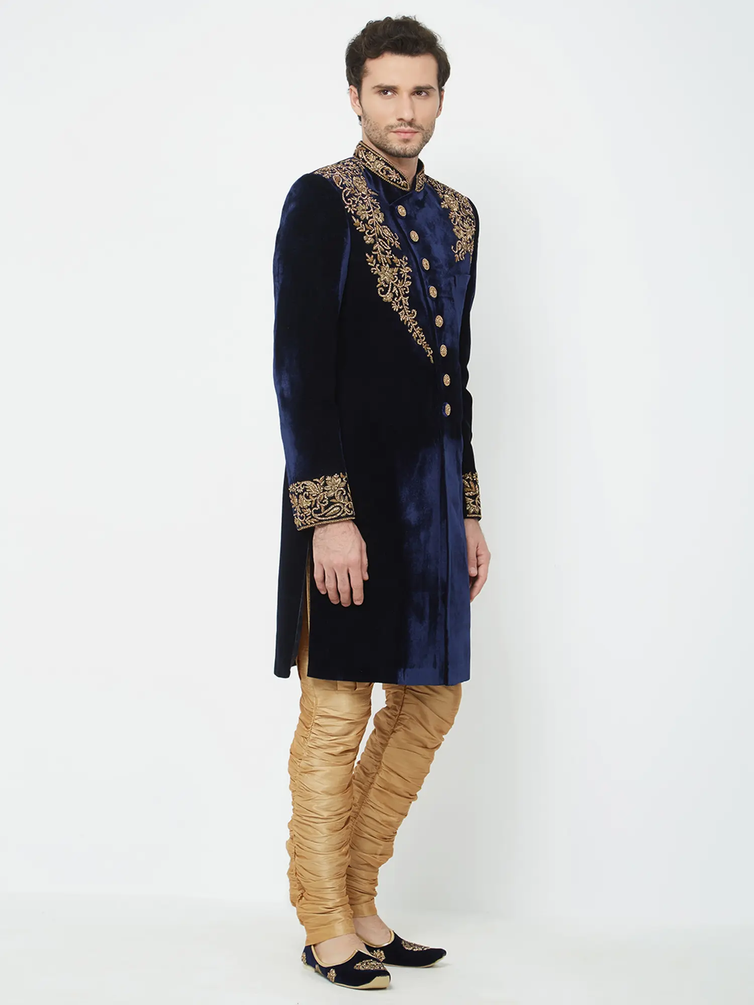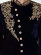 This navy velvet sherwani is richly adorned with intricate gold embroidery on the collar, shoulders, and cuffs.