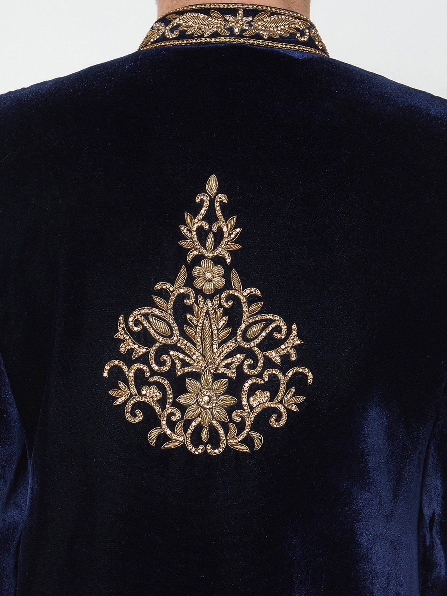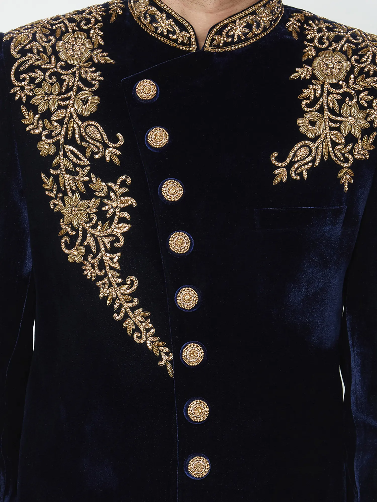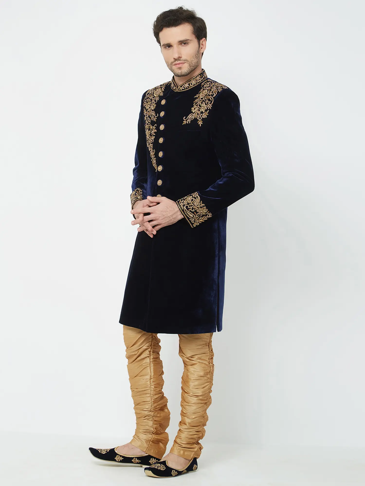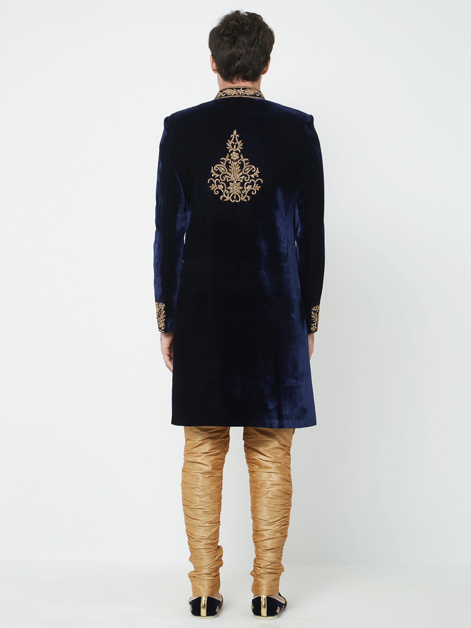 This navy velvet sherwani is richly adorned with intricate gold embroidery on the collar, shoulders, and cuffs.