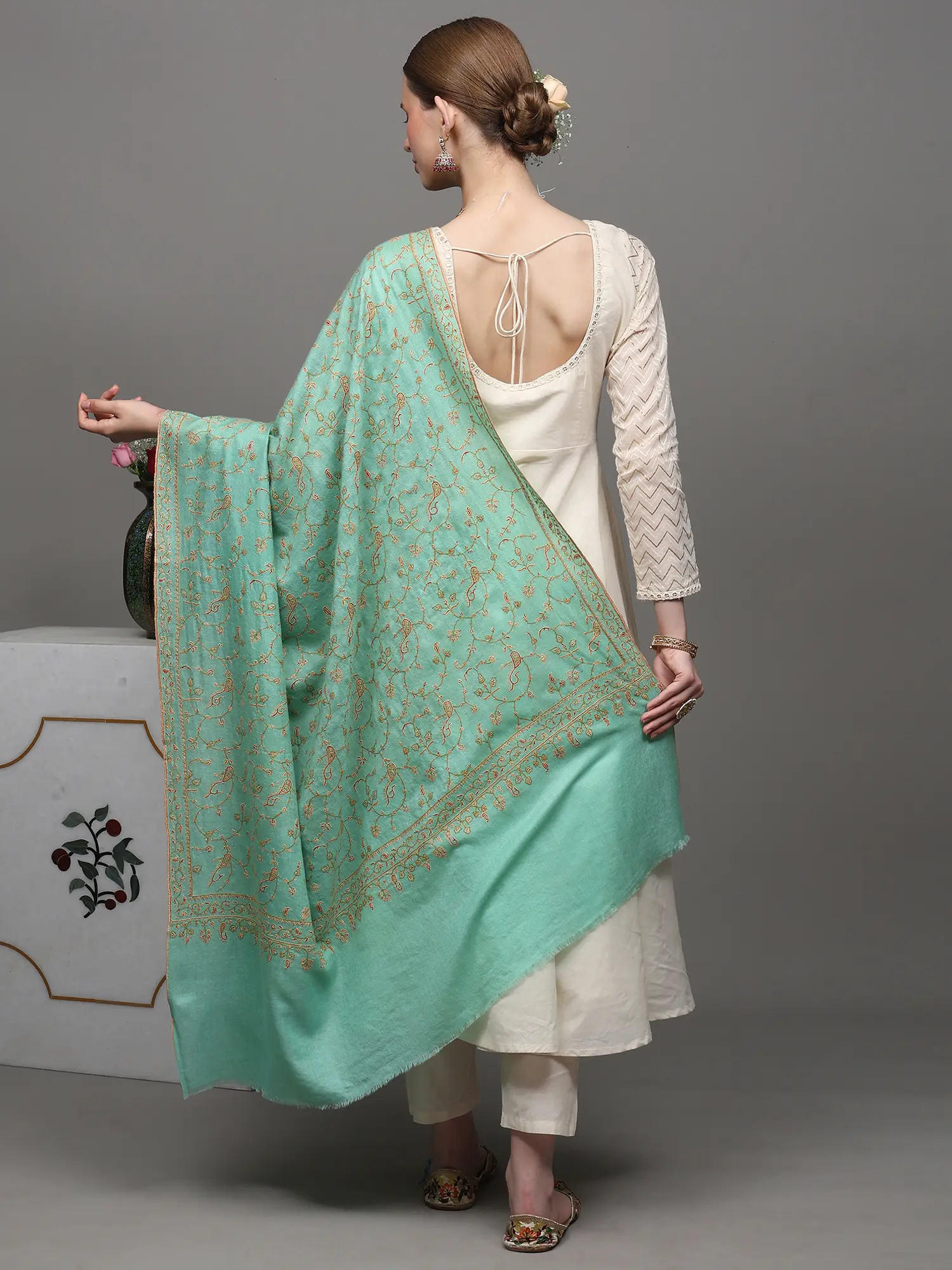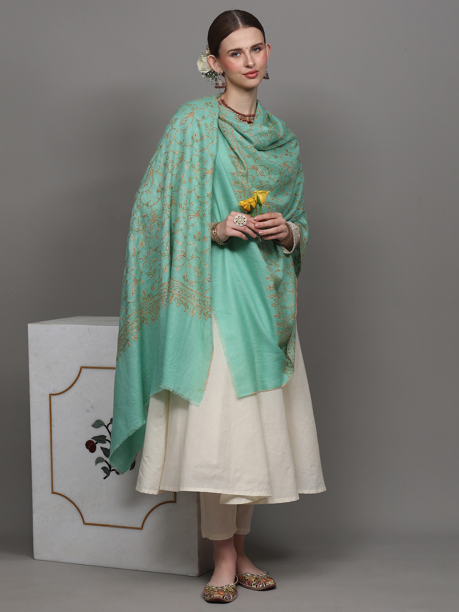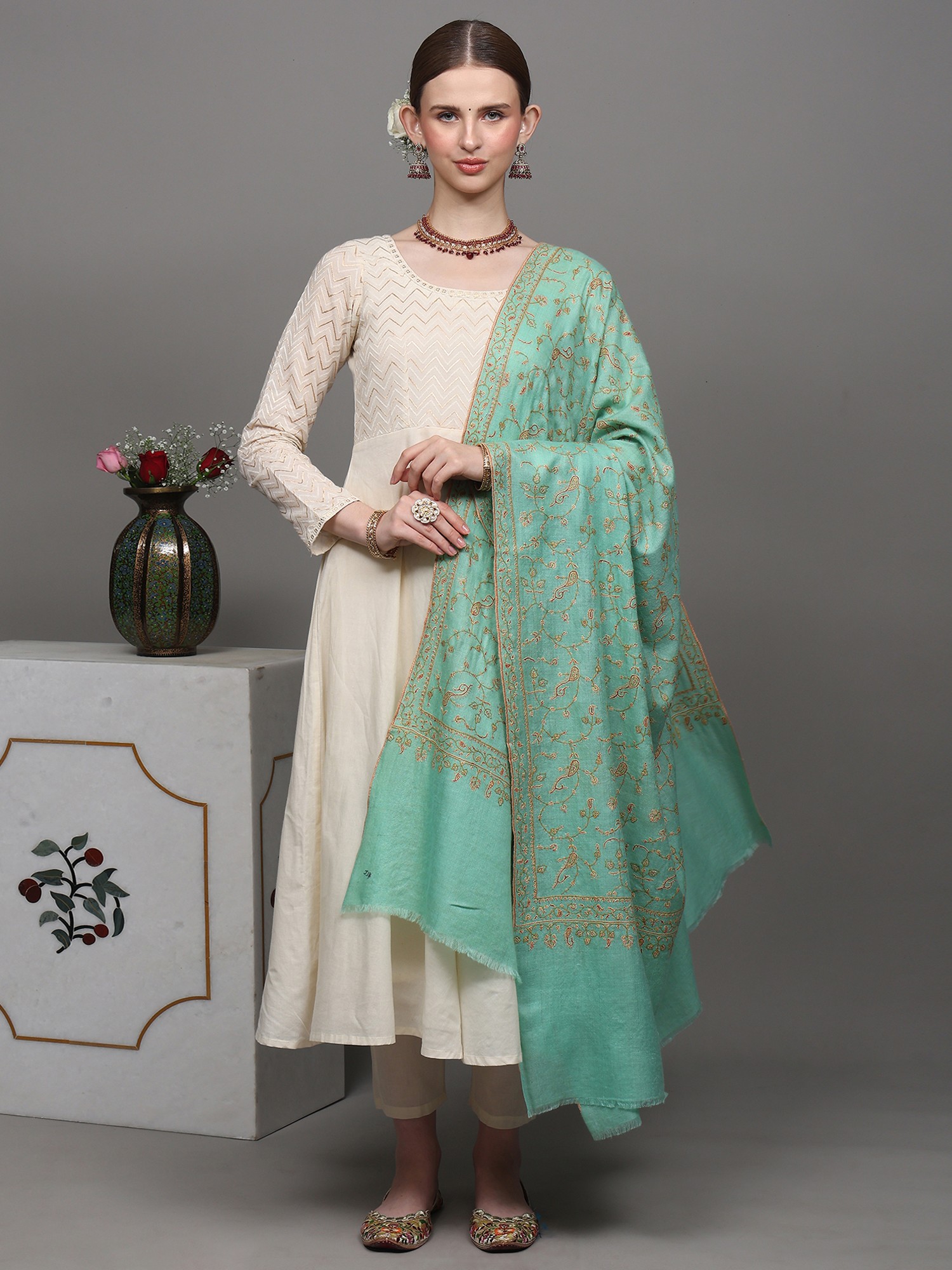 Introducing you to the Neptune green cashmere shawl with Kalka floral jaaldar sozni embroidery, embark on a journey of unparalleled sophistication. Its true elegance Neptune-green hue captures the essence of nature, evoking feelings of tranquility and freshness. Meticulously hand-embroidered by skilled artisans, it showcases a symphony of delicate floral motifs and intricate jaaldar patterns. Each stitch is a testament to the dedication and craftsmanship of its creator. This shawl is a true masterpiece that combines the sumptuousness of cashmere with the intricate beauty of sozni embroidery.
