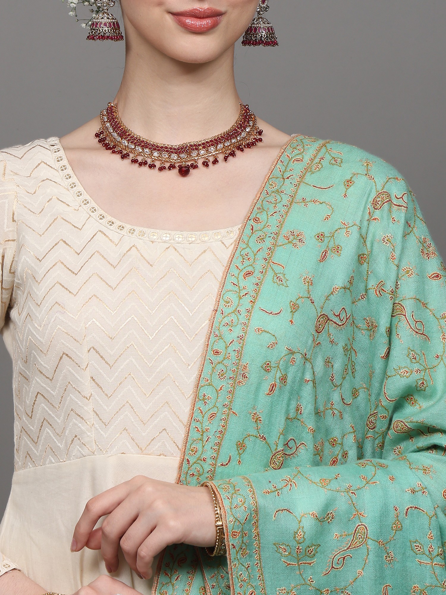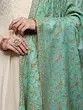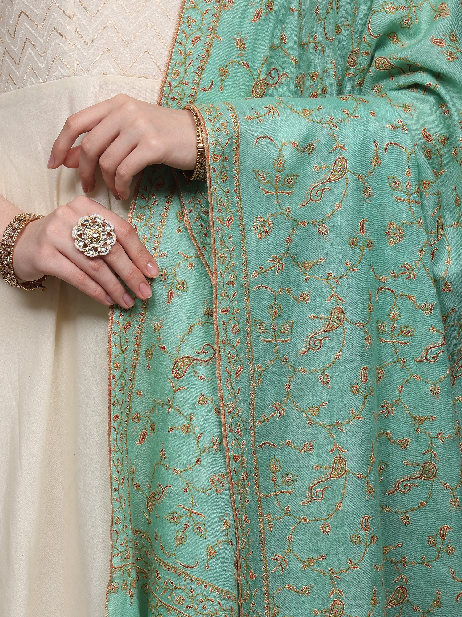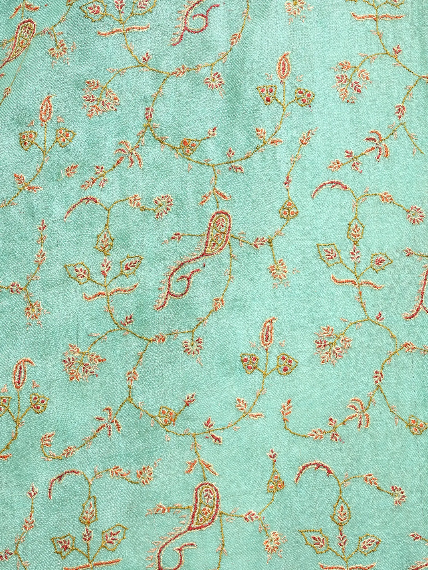 Introducing you to the Neptune green cashmere shawl with Kalka floral jaaldar sozni embroidery, embark on a journey of unparalleled sophistication. Its true elegance Neptune-green hue captures the essence of nature, evoking feelings of tranquility and freshness. Meticulously hand-embroidered by skilled artisans, it showcases a symphony of delicate floral motifs and intricate jaaldar patterns. Each stitch is a testament to the dedication and craftsmanship of its creator. This shawl is a true masterpiece that combines the sumptuousness of cashmere with the intricate beauty of sozni embroidery.