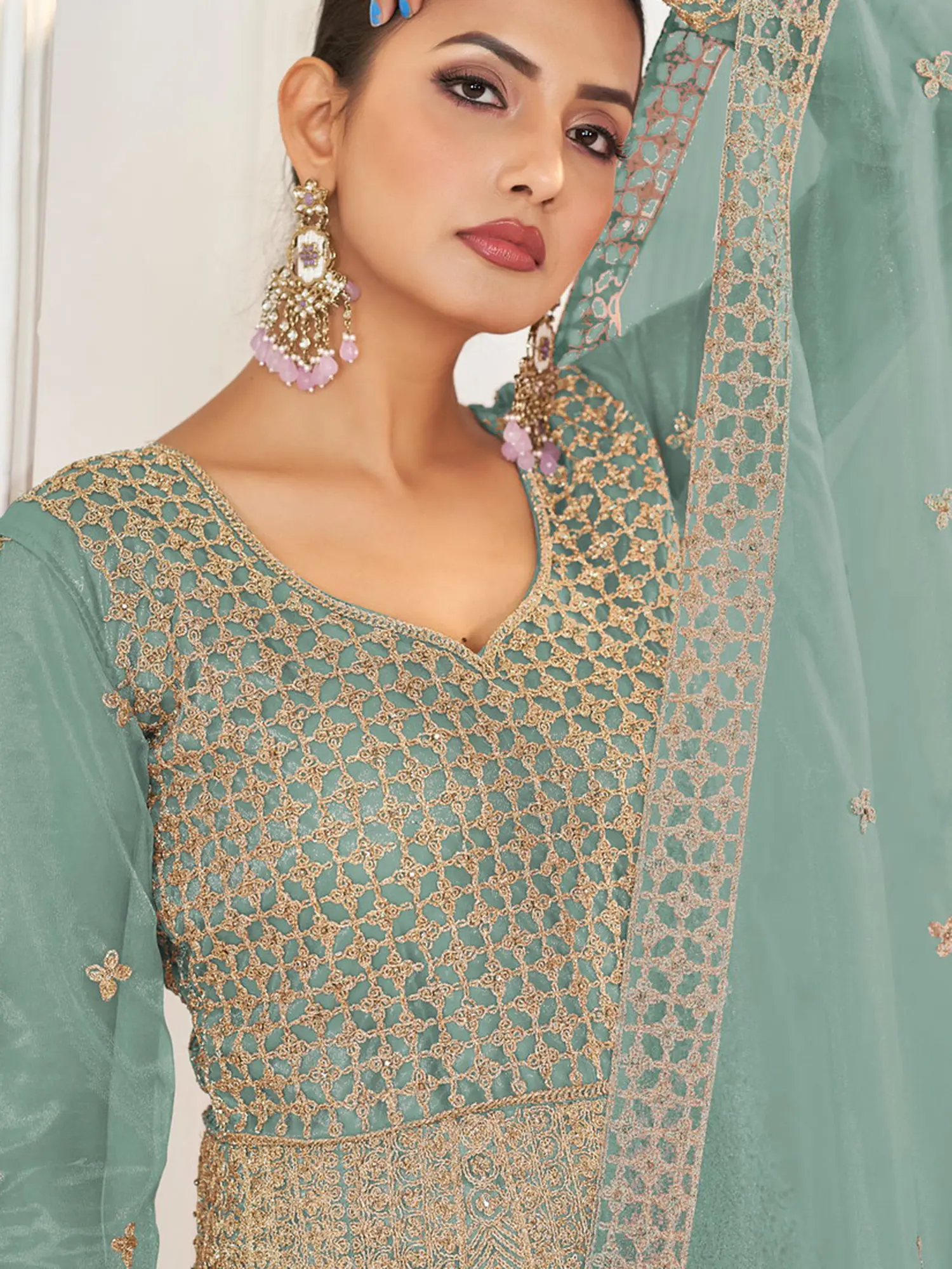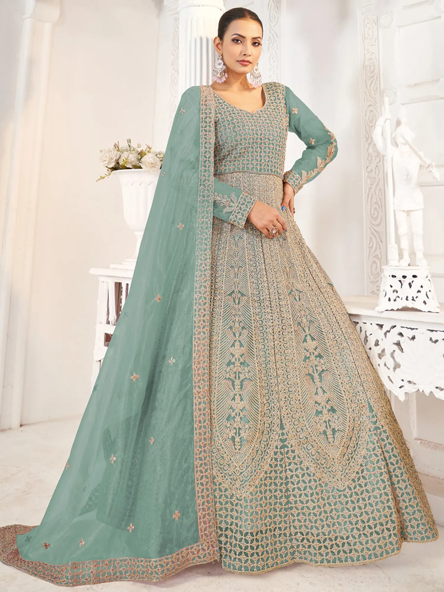 Party Wear Foux Georgette Metallic Foil Work Phthalo Green Anarkali Long Gown with Dupatta
