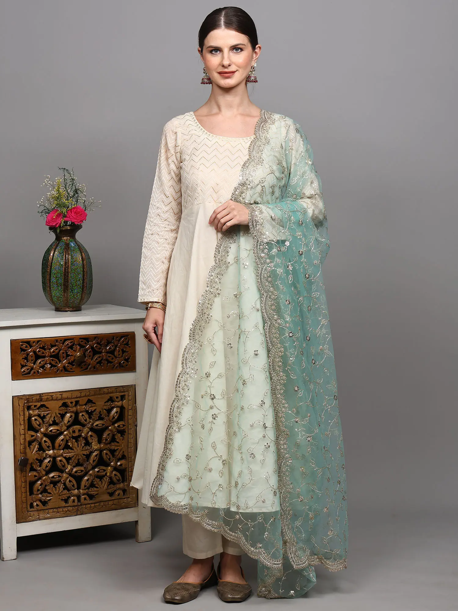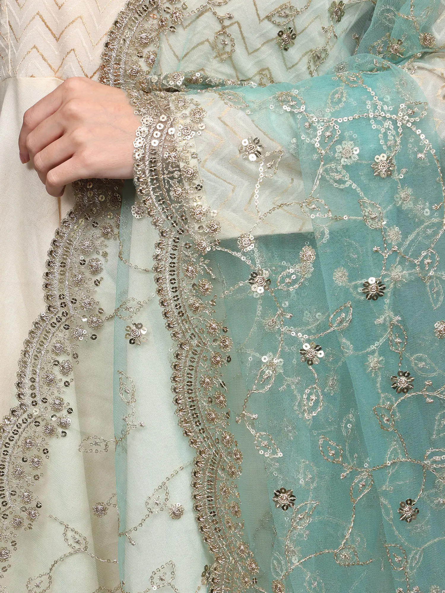 Net Dupatta with Zari-Sequins Embroidered Leaf Vine and Scalloped Border from Amritsar