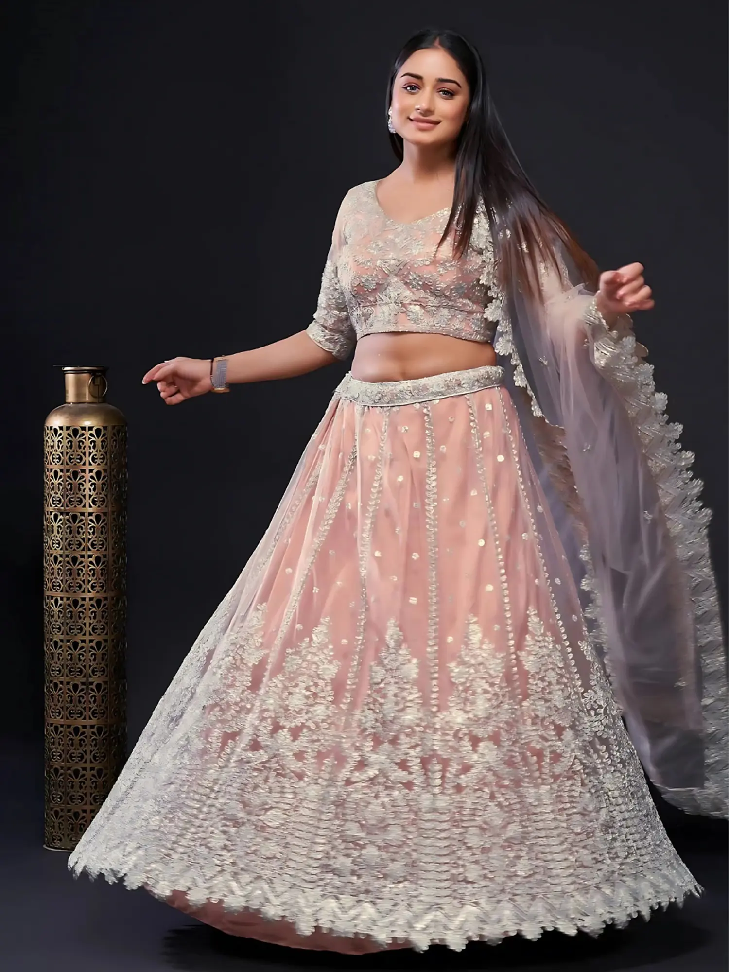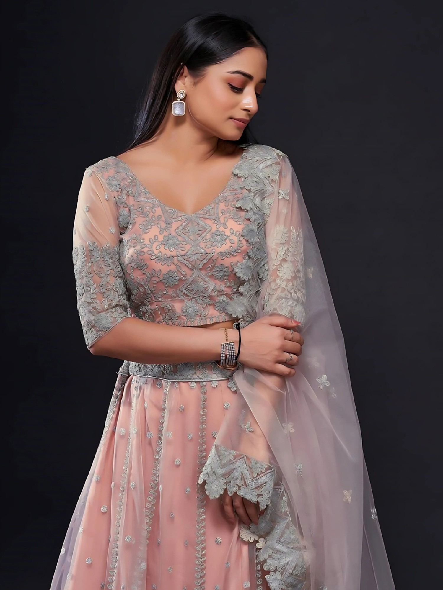 This lehenga choli set is more than just an outfit; it's a statement of style and confidence. The soft, alluring hue of the net is complemented by the exquisite silver embroidery, creating a harmonious blend of colors that exudes grace. The accompanying dupatta, also adorned with detailed embroidery and a decorative border, completes the ensemble, adding an extra layer of grandeur. Perfect for weddings, festive celebrations, or any special occasion where you wish to make a lasting impression, this lehenga set promises to make you feel like royalty. Embrace the opulence and tradition, and let this stunning creation elevate your ethnic wardrobe.
