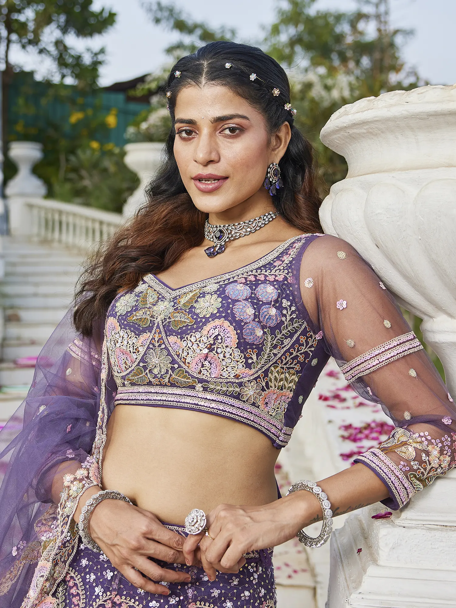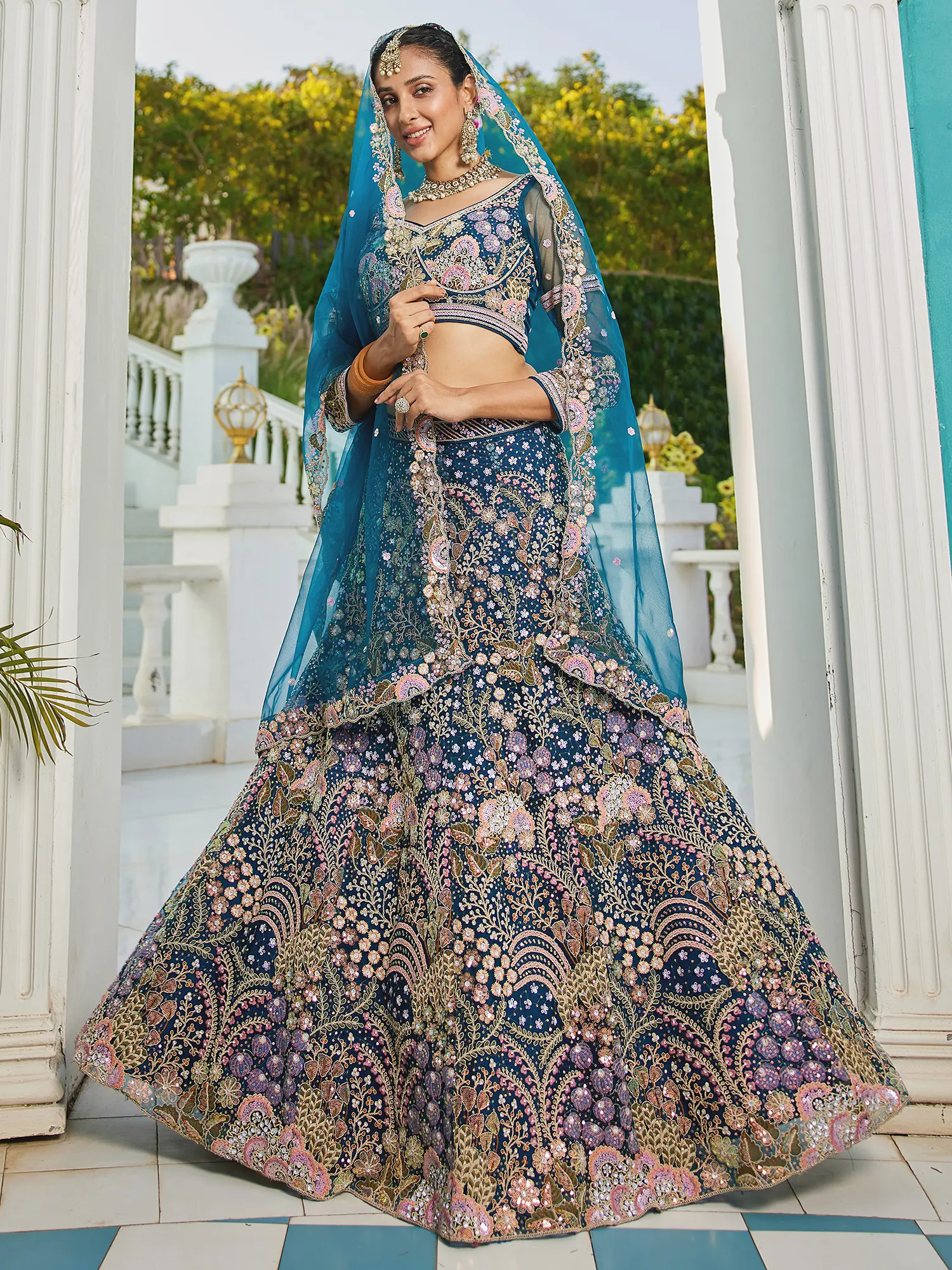 Intricately embroidered net lehenga choli set featuring opulent sequin and Zarkan work.