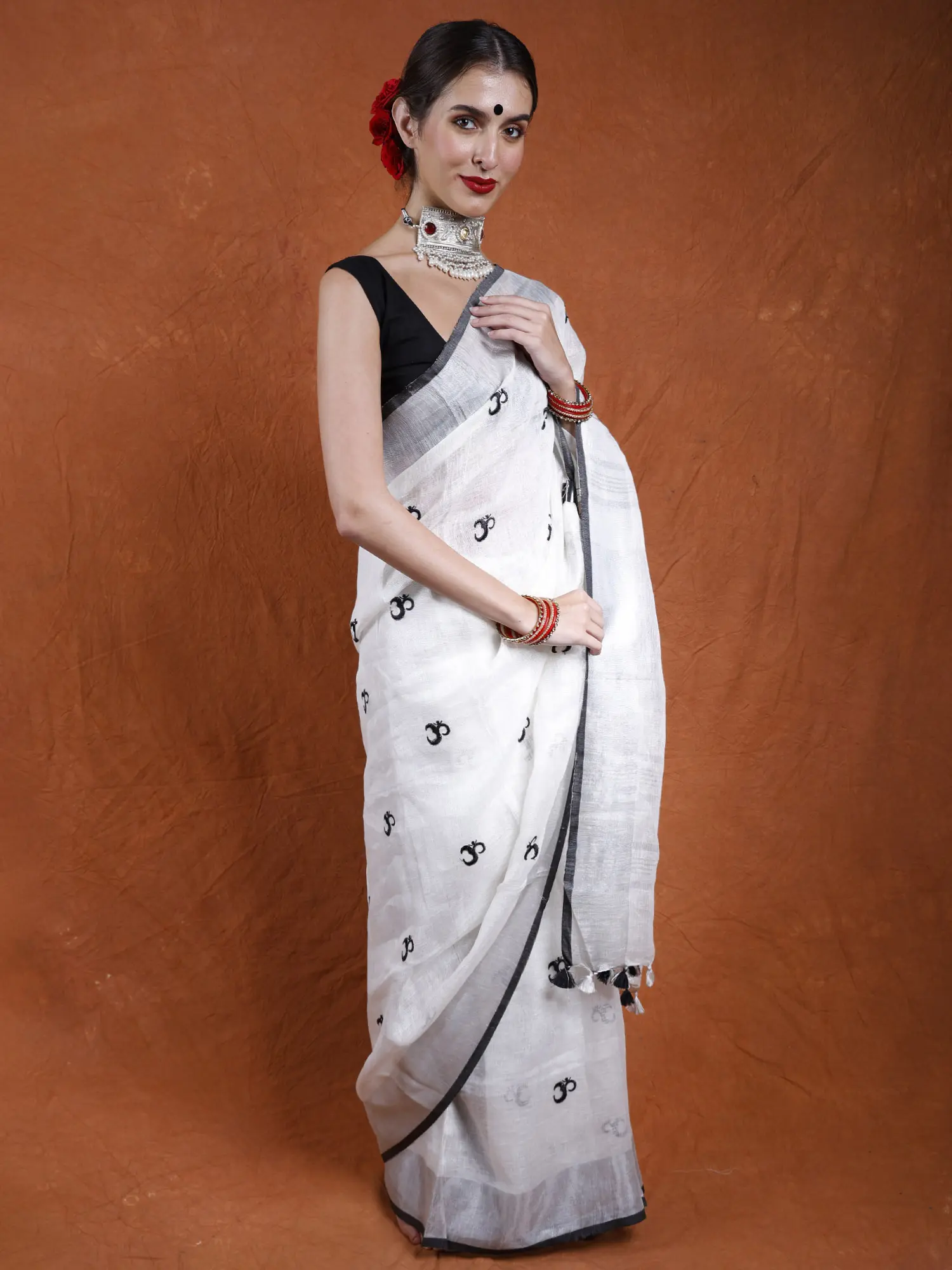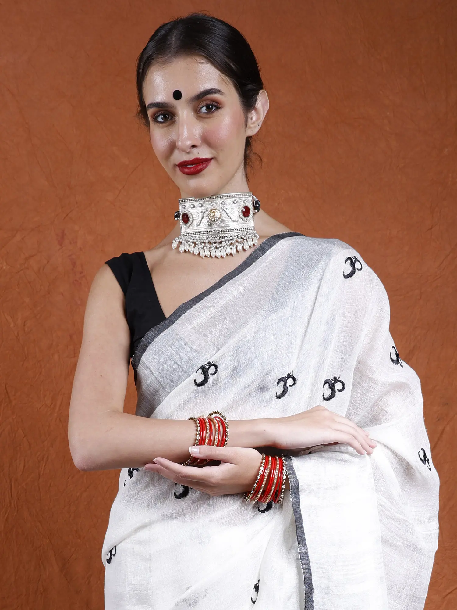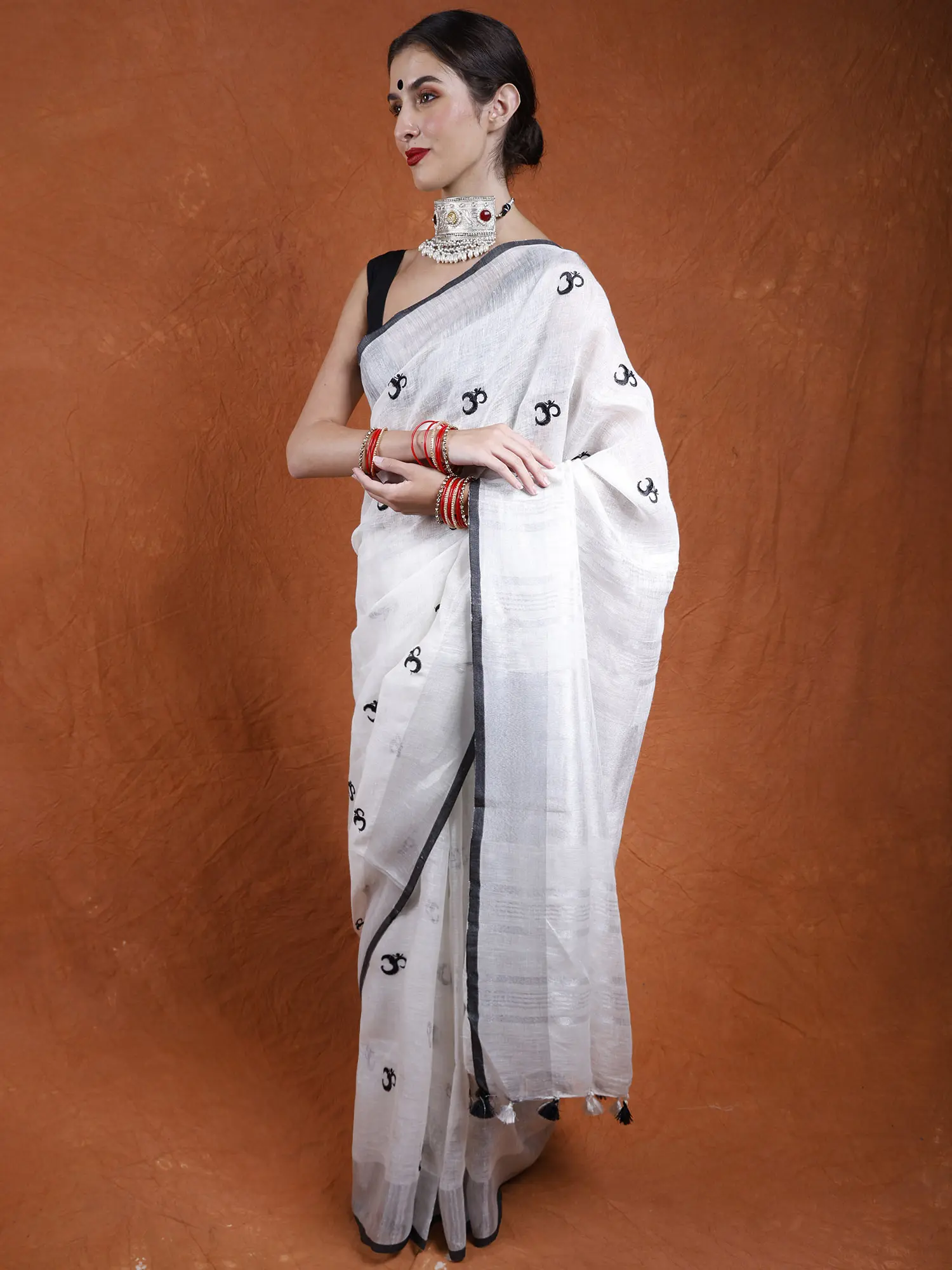 The black thread embroidered Om symbolizes spirituality and inner peace, infusing the saree with a deeper meaning. For women who embrace unconventional fashion and seek to make a statement, this saree is a must-have, offering a perfect blend of tradition, style, and individuality.