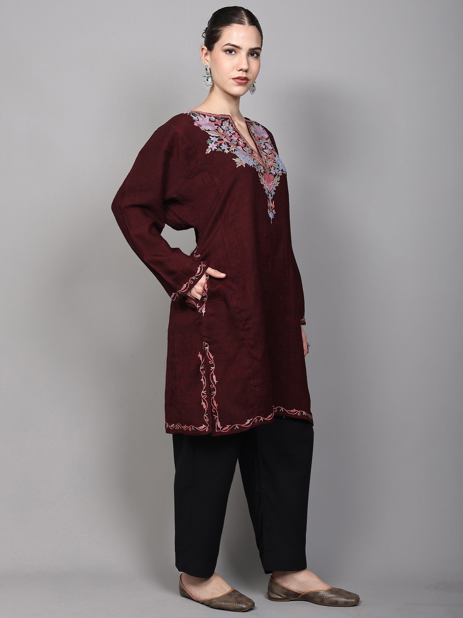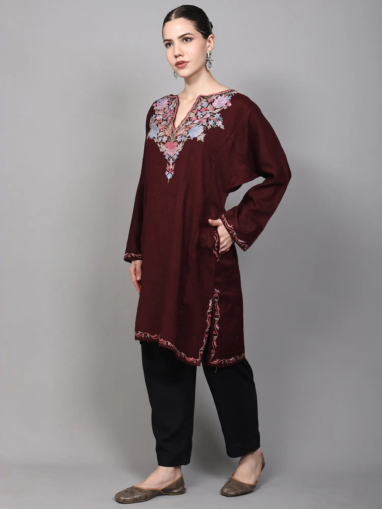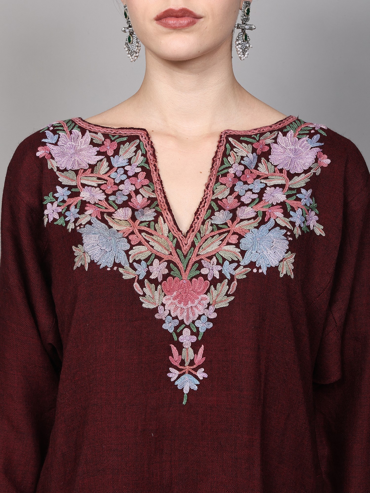 Kashmiri Phiran with Side Pockets and Aari Embroidered Paisleys on Neck