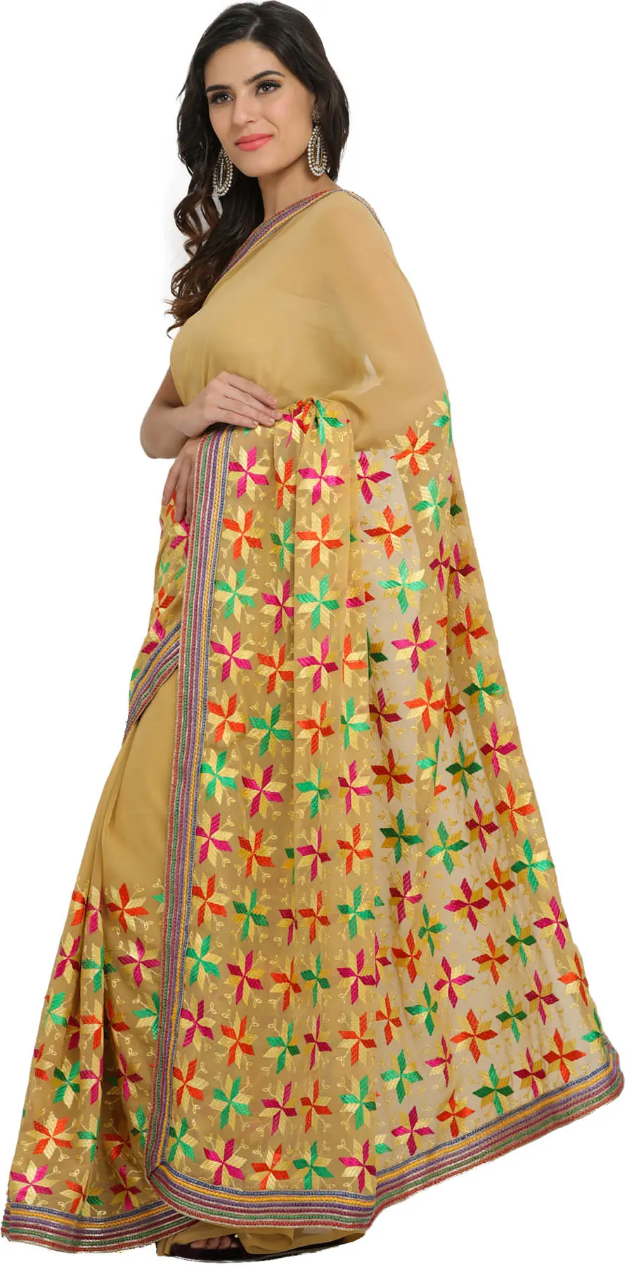 Immerse yourself in the vibrant artistry of Punjab with this exquisite wheat-colored Phulkari saree. Crafted from luxurious georgette, this saree is a testament to timeless Indian craftsmanship, bringing the rich heritage of Phulkari embroidery to your wardrobe. The delicate georgette fabric drapes beautifully, offering a graceful and elegant silhouette that is both comfortable and chic. The true star of this saree is the intricate Phulkari work, a traditional embroidery technique hailing from Punjab, characterized by its bold, colorful stitches and geometric patterns. Here, the embroidery takes the form of charming, star-like floral motifs scattered across the fabric in a delightful medley of vibrant hues. Shades of crimson, emerald green, sunny yellow, and fuchsia burst forth against the soft wheat background, creating a visually captivating spectacle. Each stitch is meticulously placed, showcasing the skill and dedication of the artisans who brought this piece to life. This intricate detail makes each saree a unique work of art. Adding a touch of regal splendor is the meticulously embroidered Gota border that graces the edges of the saree. Gota Patti work, a traditional Rajasthani embellishment, uses pieces of golden or silver ribbon appliquéd onto the fabric to create intricate patterns. This saree features a multi-colored Gota border that runs along the length, framing the intricate Phulkari embroidery and adding a subtle sheen and textural contrast. The combination of Phulkari and Gota work creates a harmonious blend of Punjabi and Rajasthani aesthetics, resulting in a truly captivating and resplendent garment. The gentle wheat hue of the georgette serves as a perfect canvas for the riot of colors in the embroidery, making the motifs pop and drawing the eye with their lively charm. This saree is designed to make a statement, whether you're attending a wedding, a festive celebration, or a special cultural event. It’s a piece that speaks of tradition, celebration, and effortless style. The flowing nature of the georgette ensures that the saree moves with a captivating grace, enhancing its overall appeal. Beyond its aesthetic beauty, this saree offers versatility. The accompanying blouse fabric can be tailored to your specific measurements, allowing for a personalized fit and ensuring you look and feel your absolute best. Embrace the spirit of Punjab and elevate your ethnic wear collection with this breathtaking Phulkari saree, a wearable piece of art that celebrates heritage and craftsmanship.