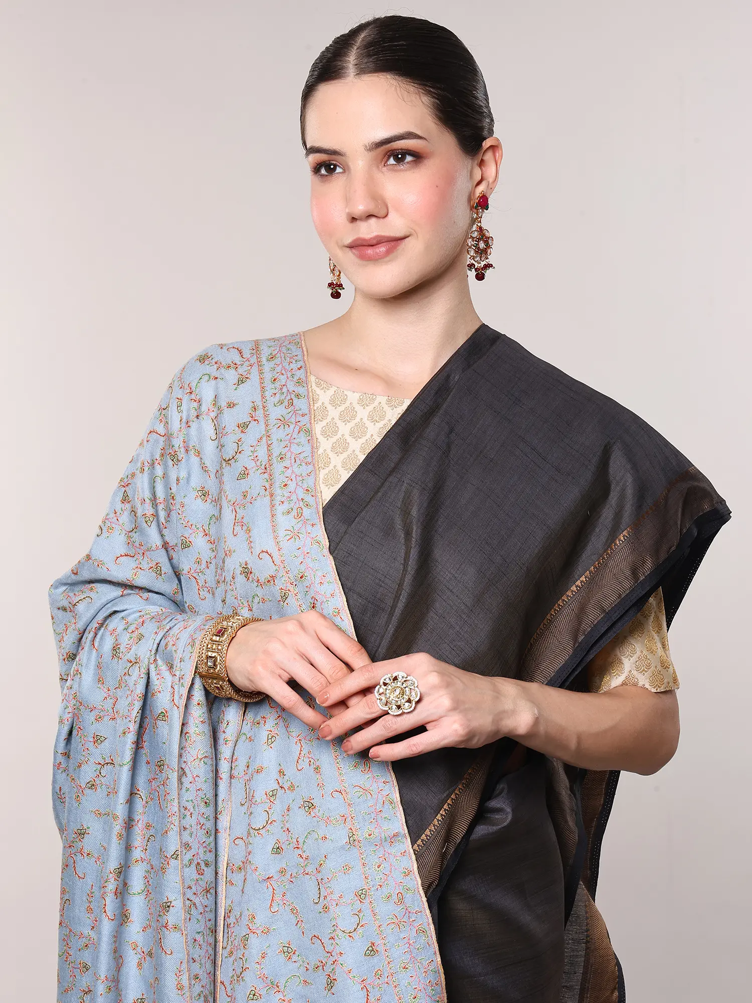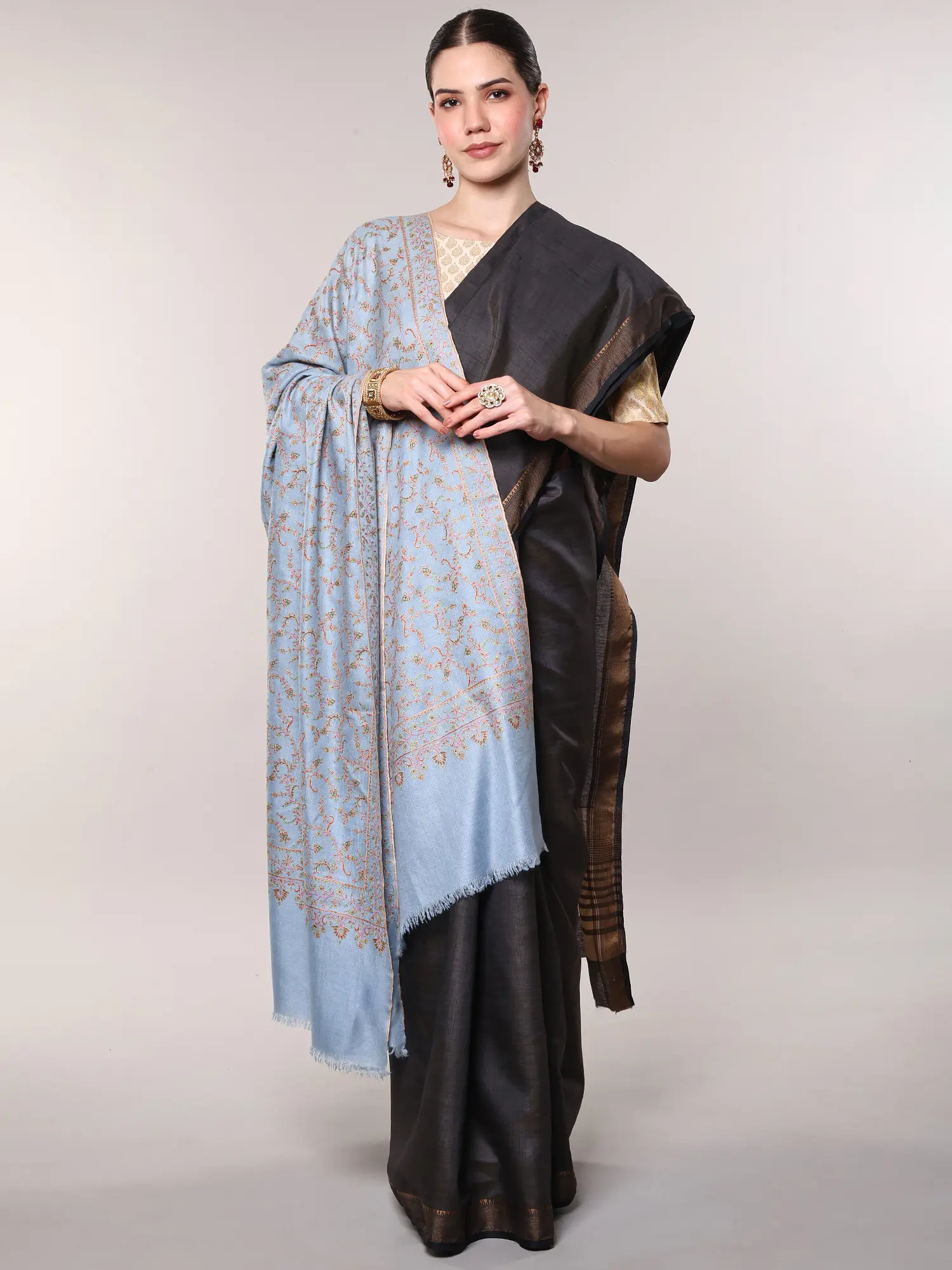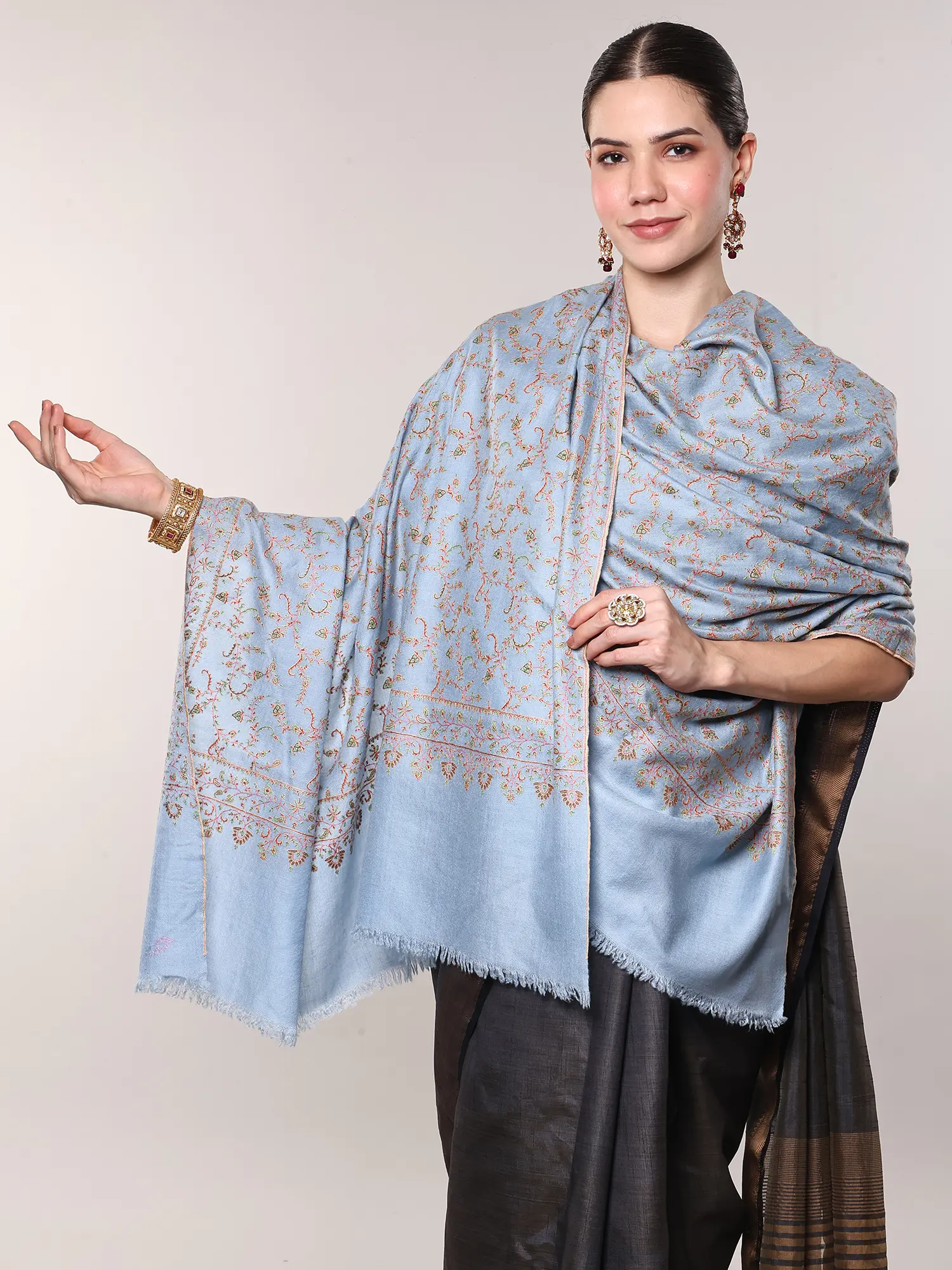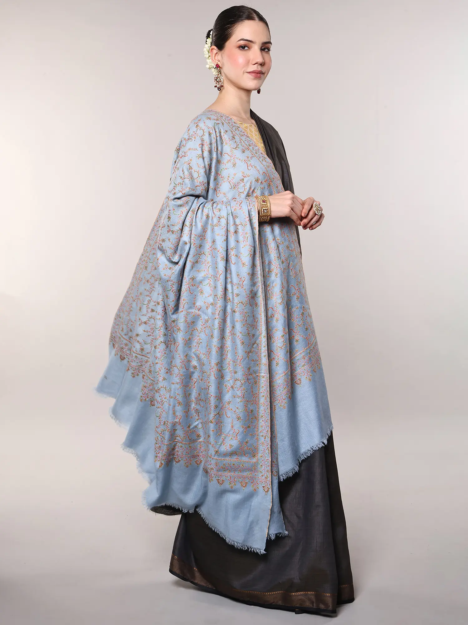 The true magic of this Pashmina shawl lies in its breathtaking Jaaldar Sozni embroidery. Meticulously hand-stitched by skilled artisans, the delicate floral sprigs bloom across the soft, pale blue canvas, creating a mesmerizing tapestry of color and texture. Each stitch is a whisper of dedication, a testament to the patience and precision that defines Kashmiri embroidery. The Jaaldar technique, characterized by its open, net-like patterns, allows the embroidery to interlace gracefully, adding a subtle translucence and a captivating depth to the design.