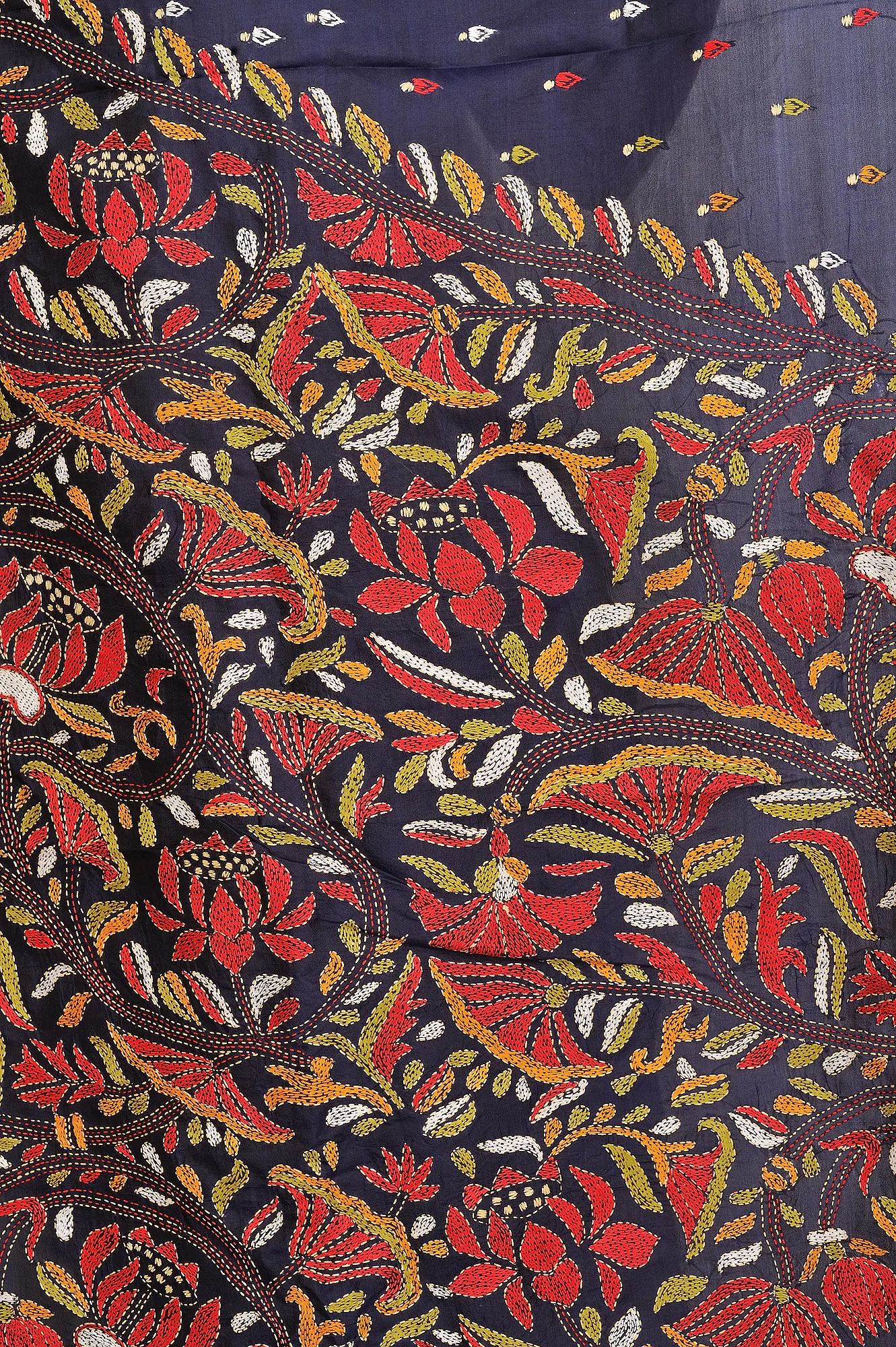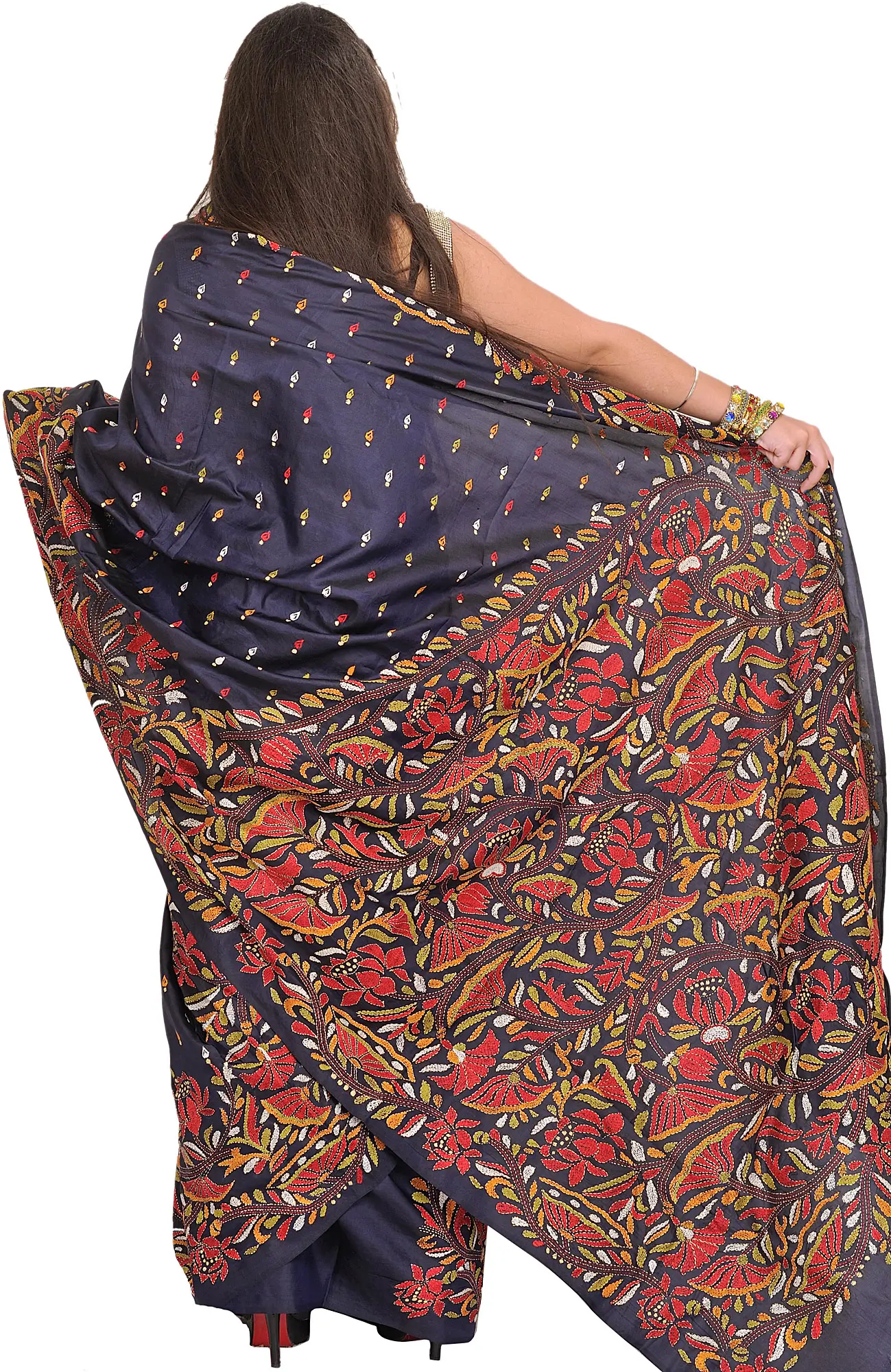 Caviar-Black Sari from Kolkata with Floral Kantha-Embroidery by Hand