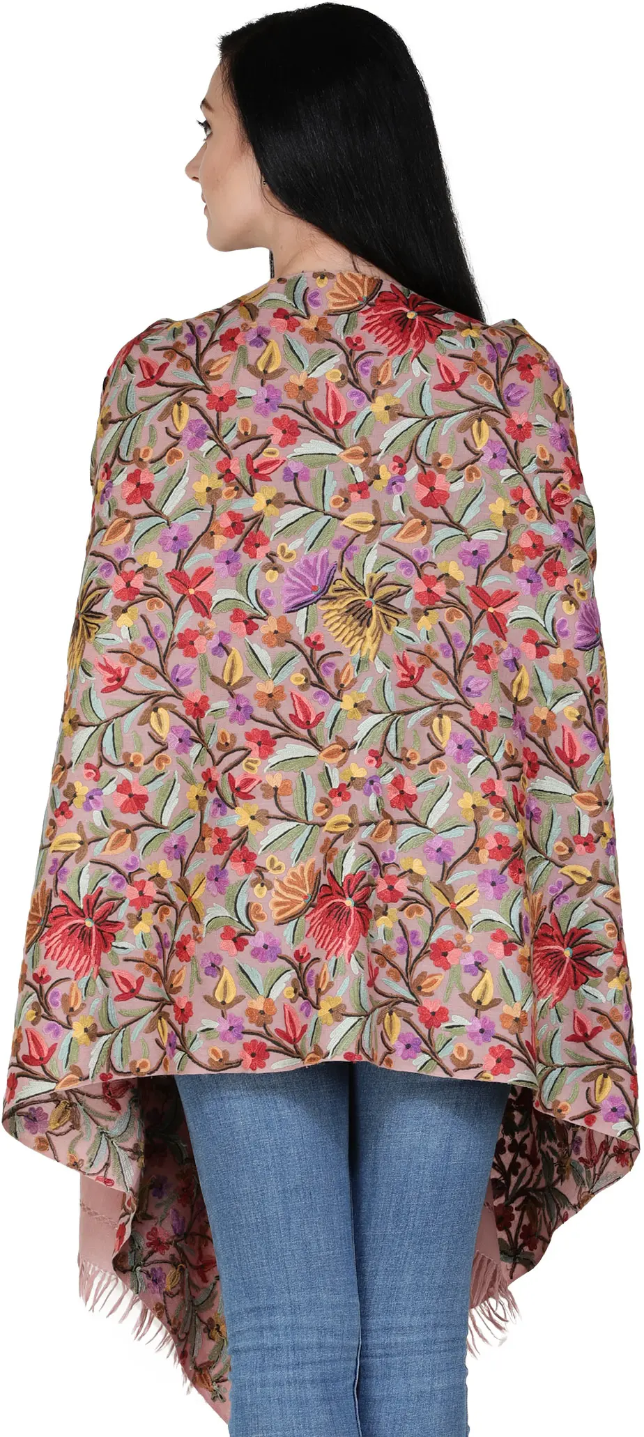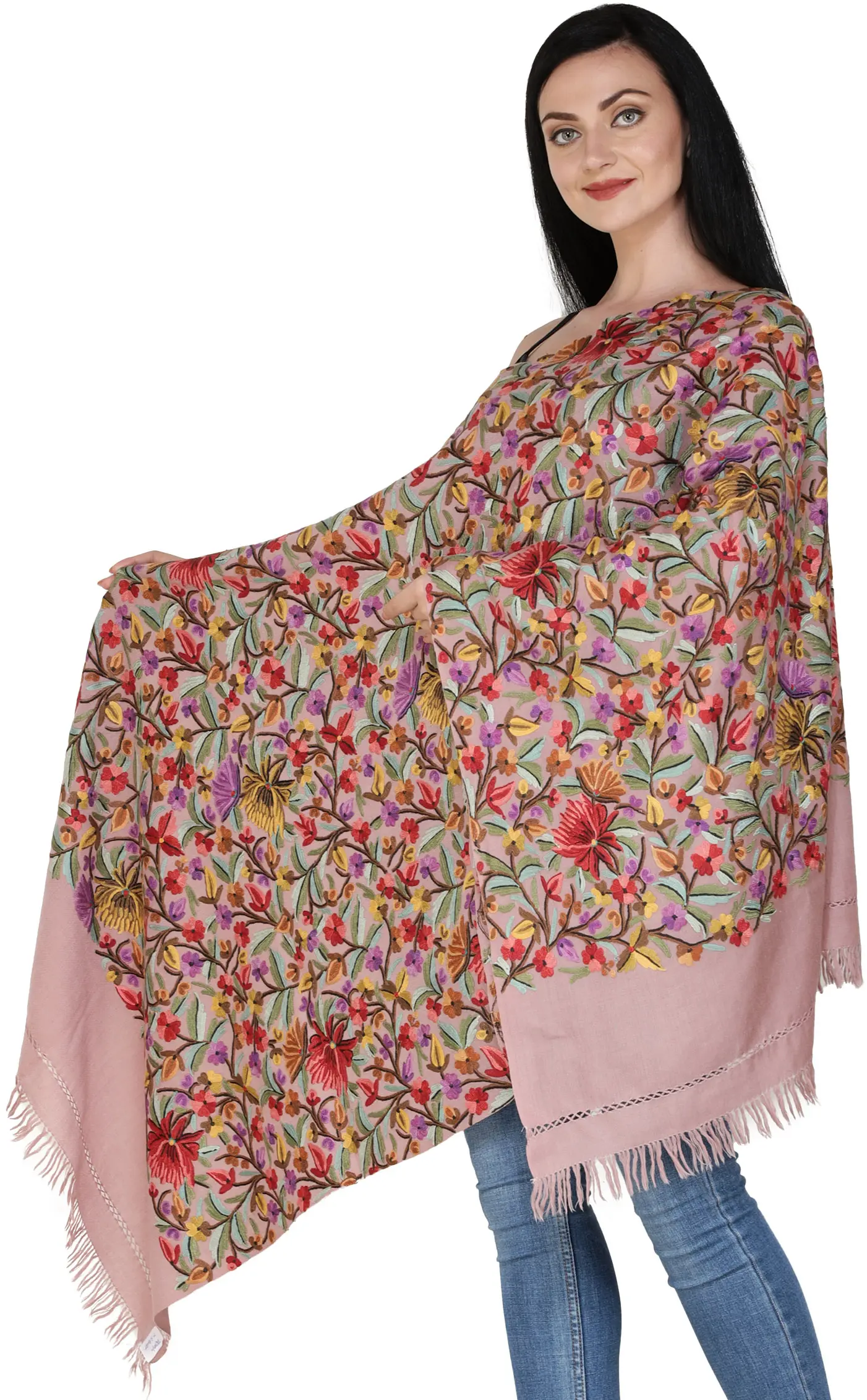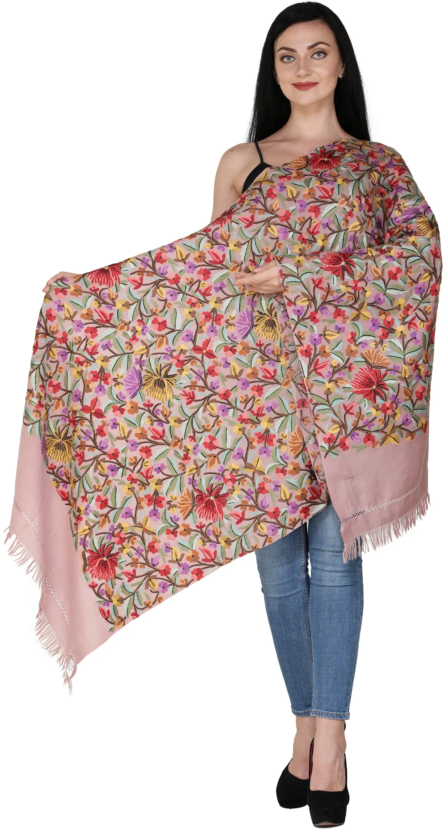 Kashmiri Stole with Hand-Embroidered Multicolor Flowers All-Over