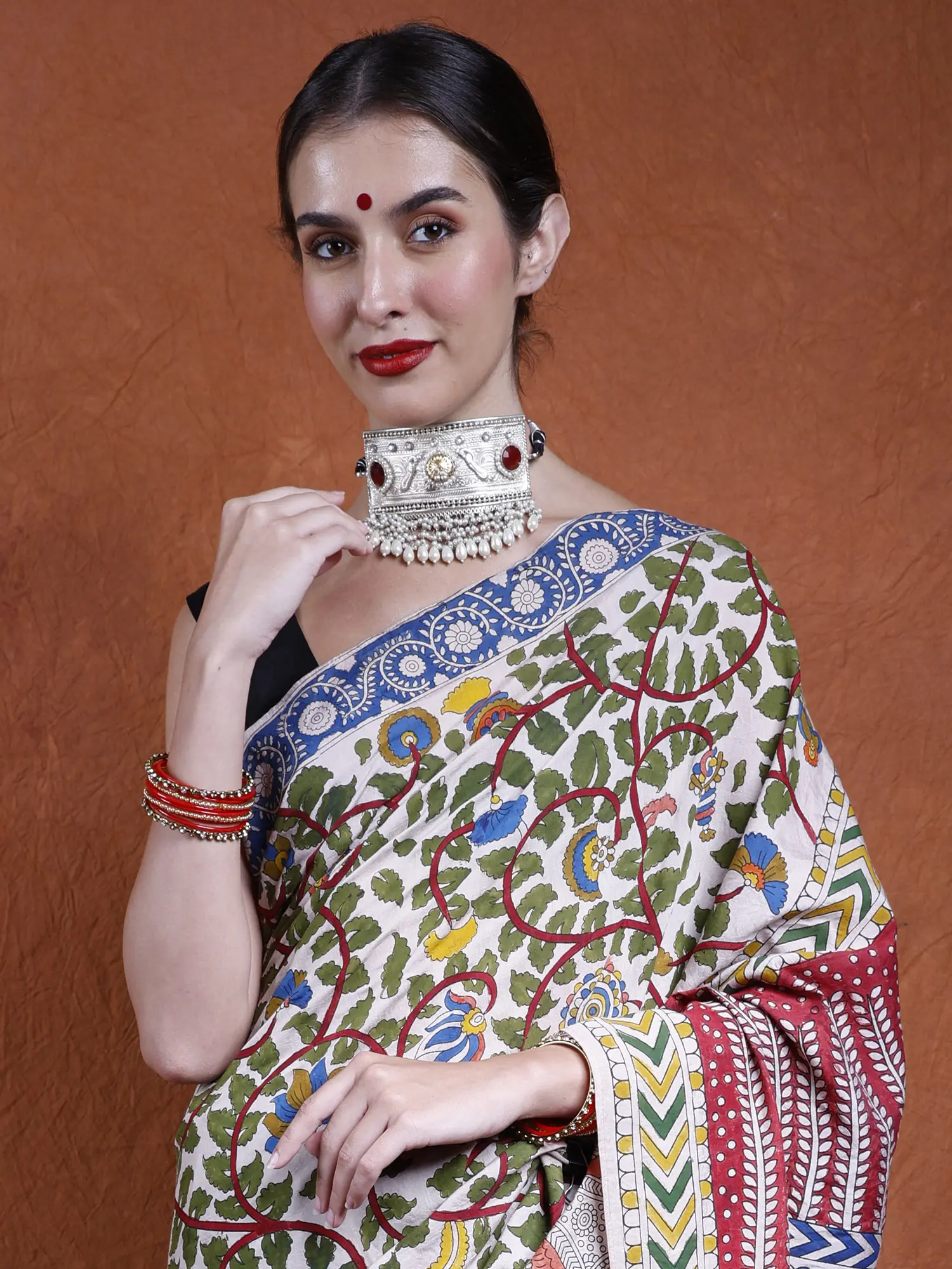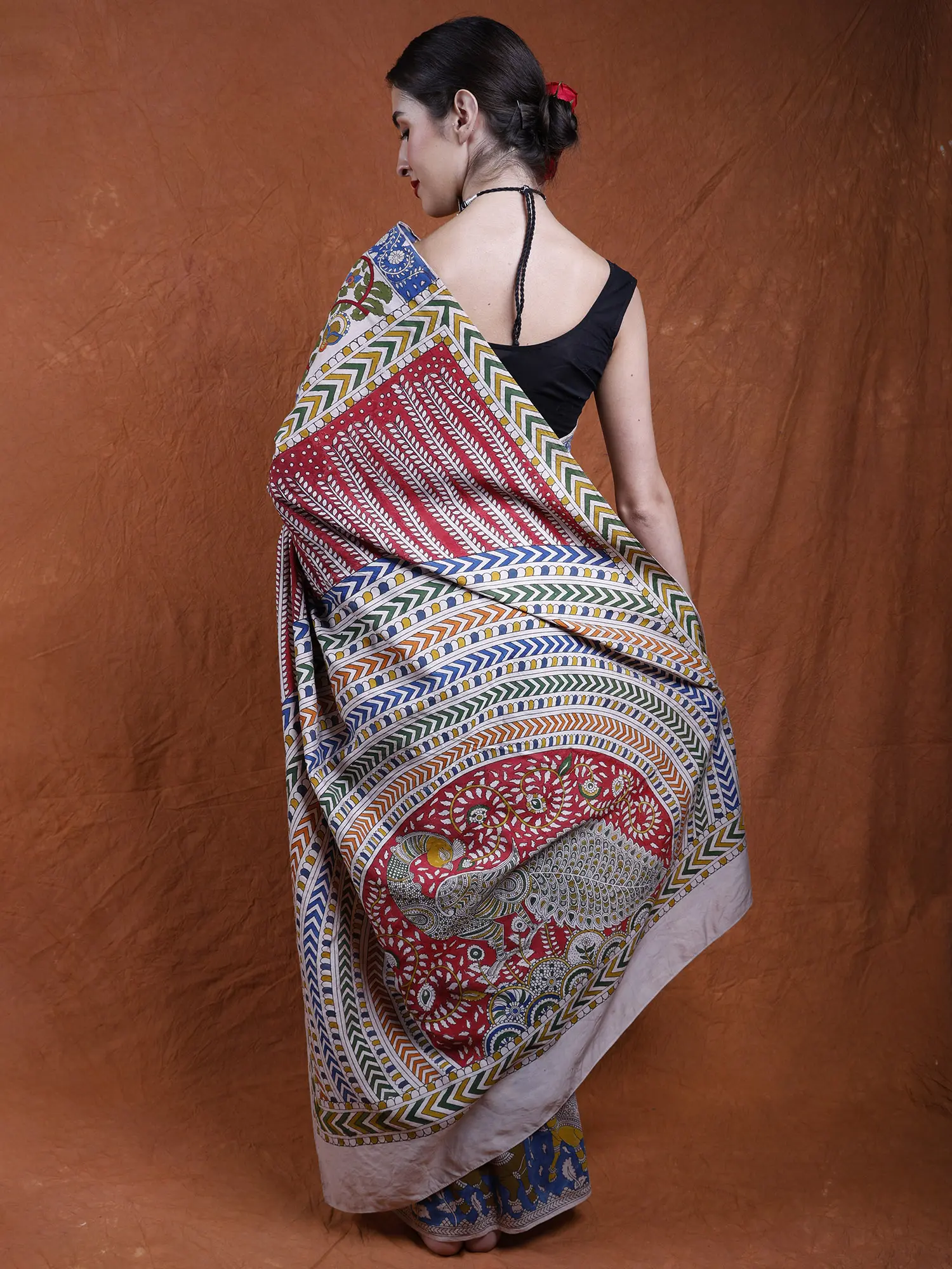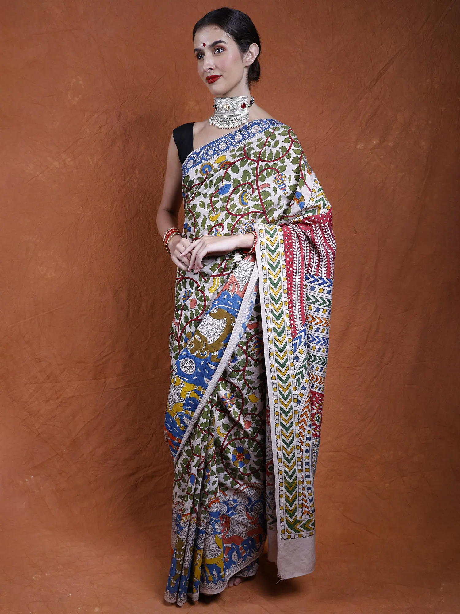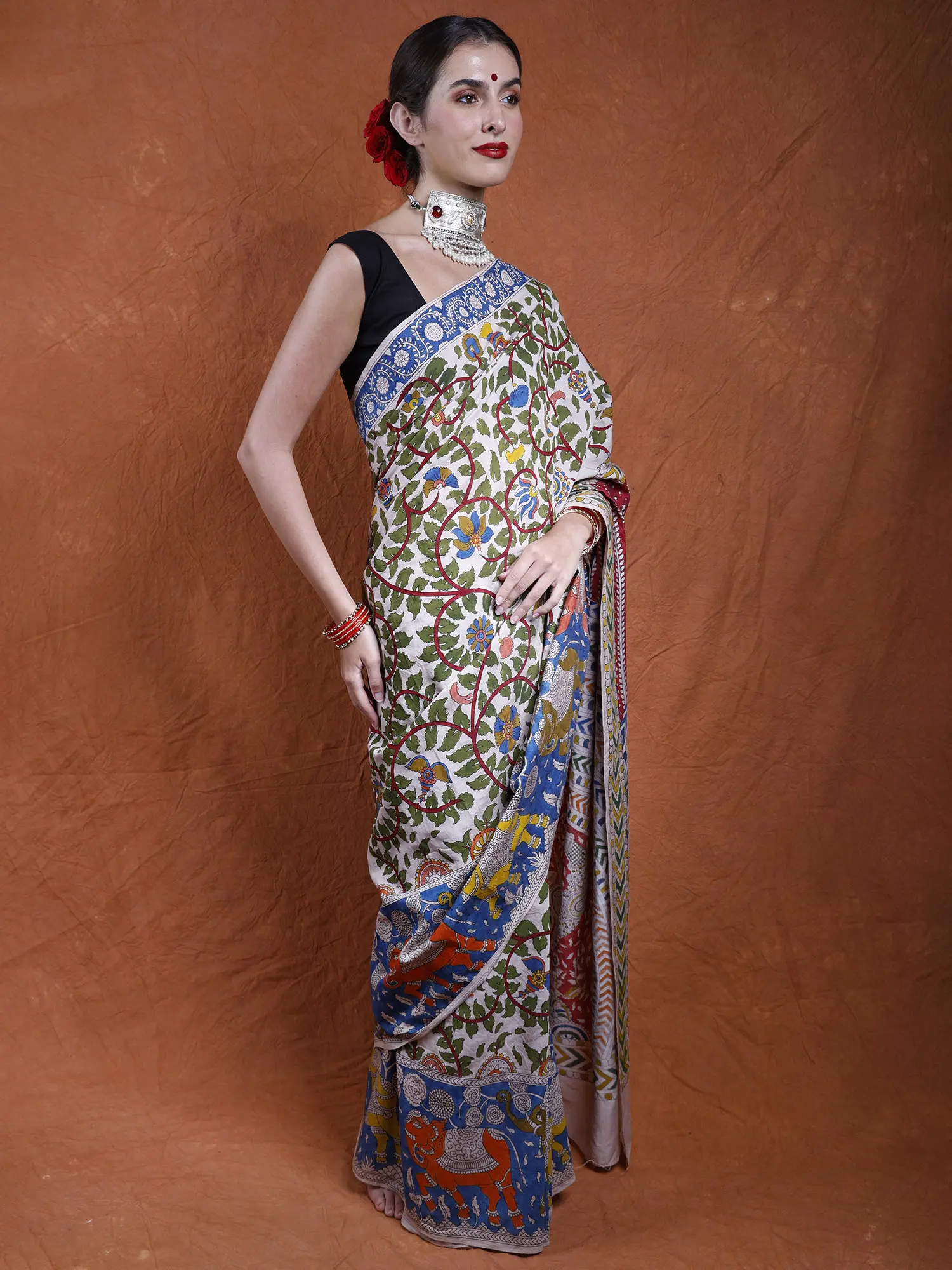 The soft peach hue of the cotton fabric adds a touch of elegance, while the intricate artwork infuses the saree with a timeless allure. It's more than just clothing; it's a wearable work of art, celebrating nature's splendor and the artistic legacy of Gujarat's folk traditions.