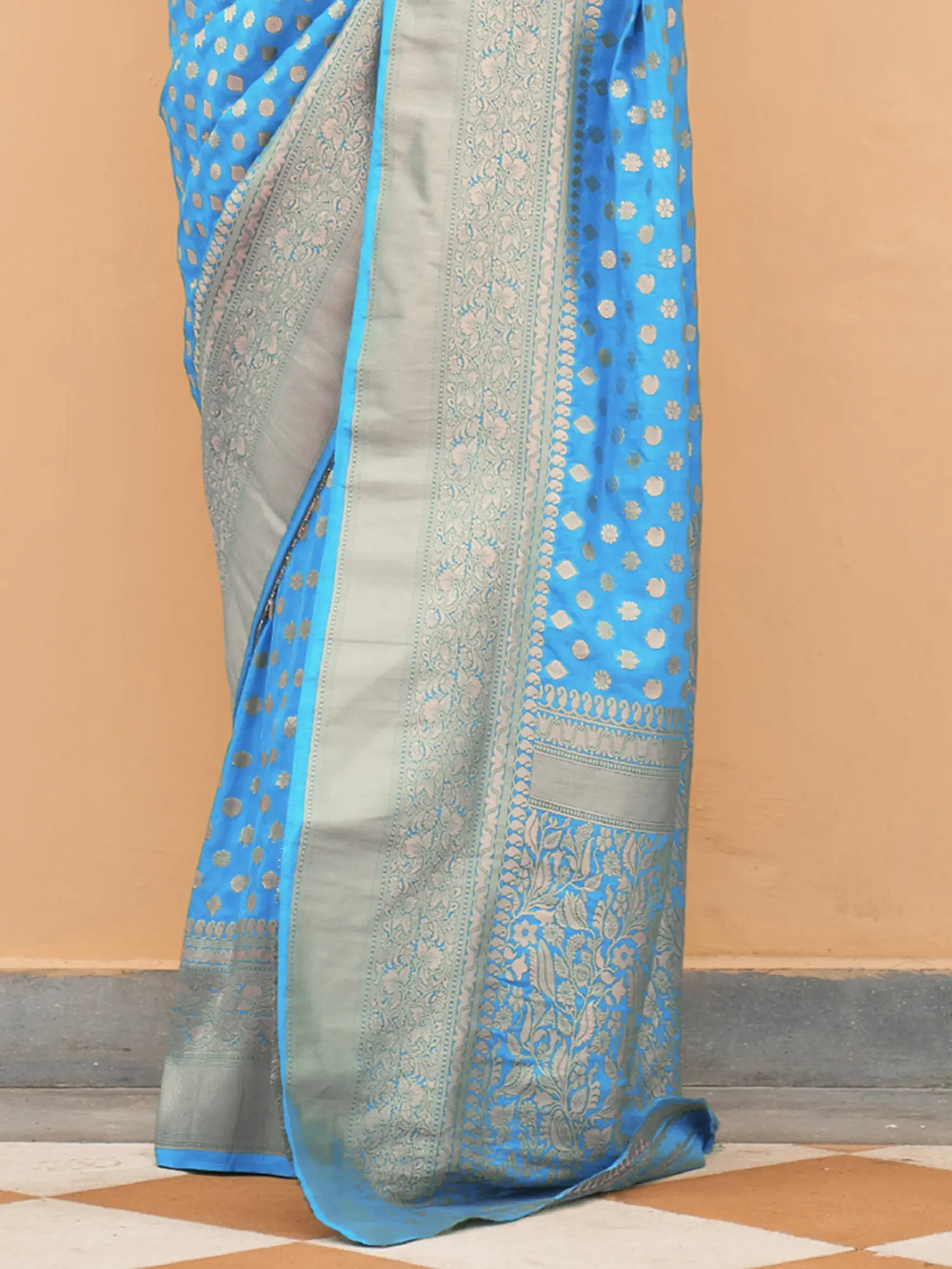 The saree's body is adorned with a beautiful all-over pattern, adding depth and texture to the light blue base. This subtle patterning ensures the saree is both sophisticated and understated, perfect for making a statement without being overwhelming. The contrast of the silver detailing against the bright blue creates a captivating visual appeal. The luxurious nylon fabric drapes beautifully, falling gracefully to create a flattering silhouette. Whether you're attending a family gathering, a festive celebration, or simply want to elevate your everyday style, this saree is an excellent choice.