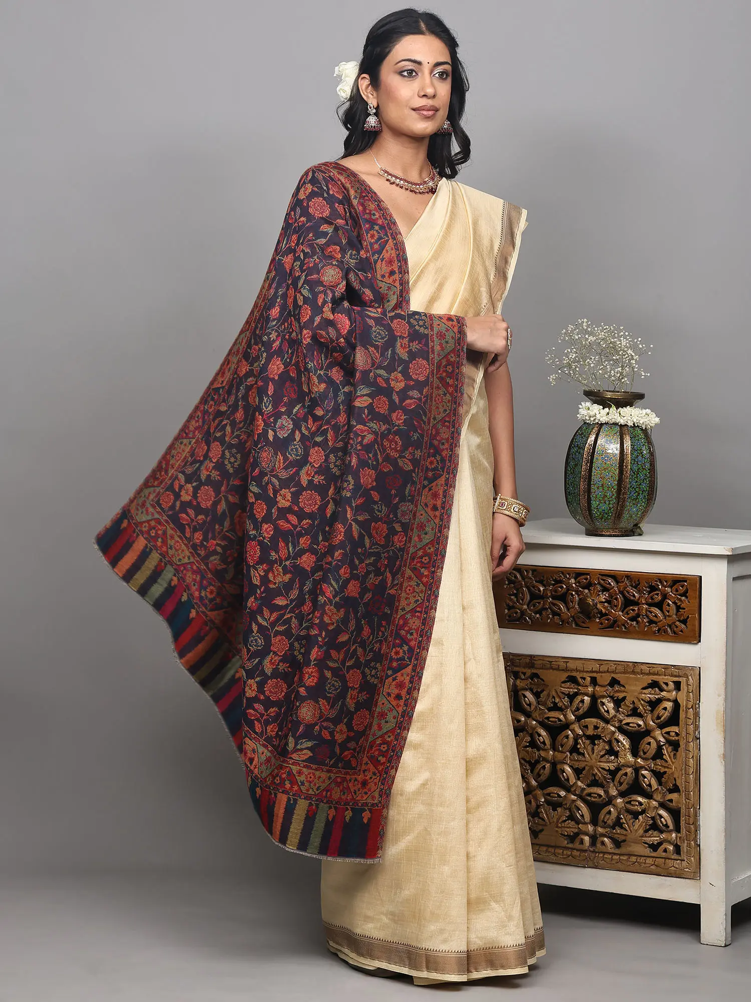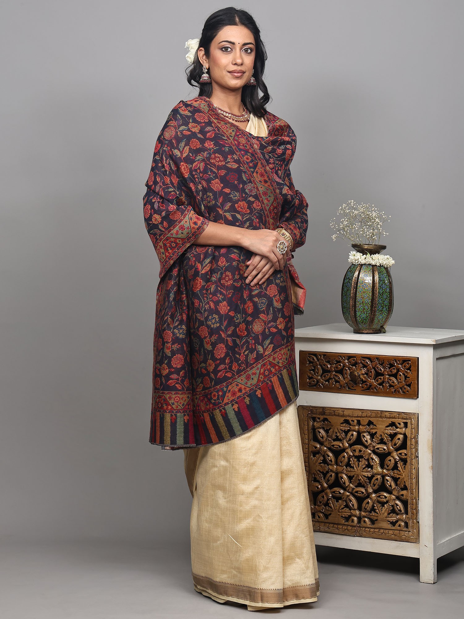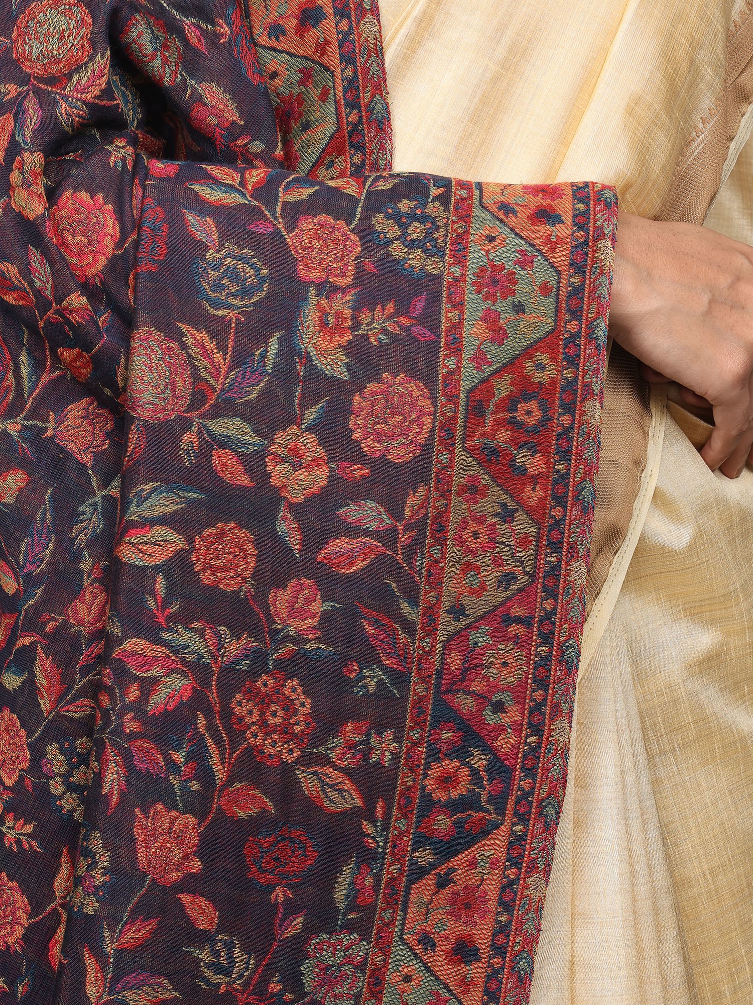Discover a masterpiece of textile artistry with this exquisite reversible shawl. Crafted from fine wool, it offers unparalleled warmth and a luxurious feel against the skin. The rich, deep navy base of this shawl is adorned with a vibrant, all-over woven pattern of delicate floral vines. These intricate blossoms and winding stems create a visually captivating tapestry, bringing to mind the lushness of a secret garden in bloom. The detailed craftsmanship showcases a dedication to traditional weaving techniques, resulting in a piece that is both substantial and strikingly beautiful.