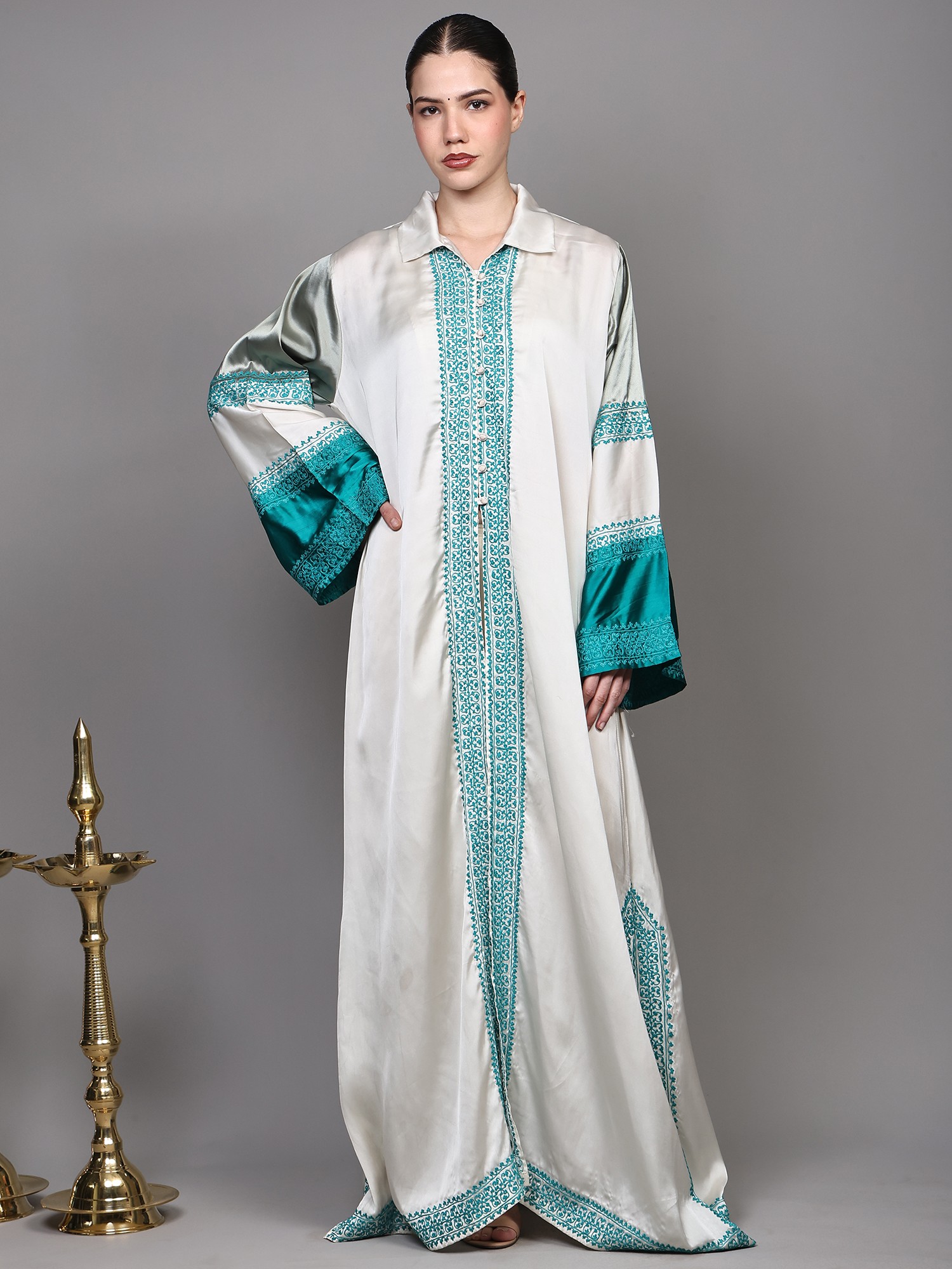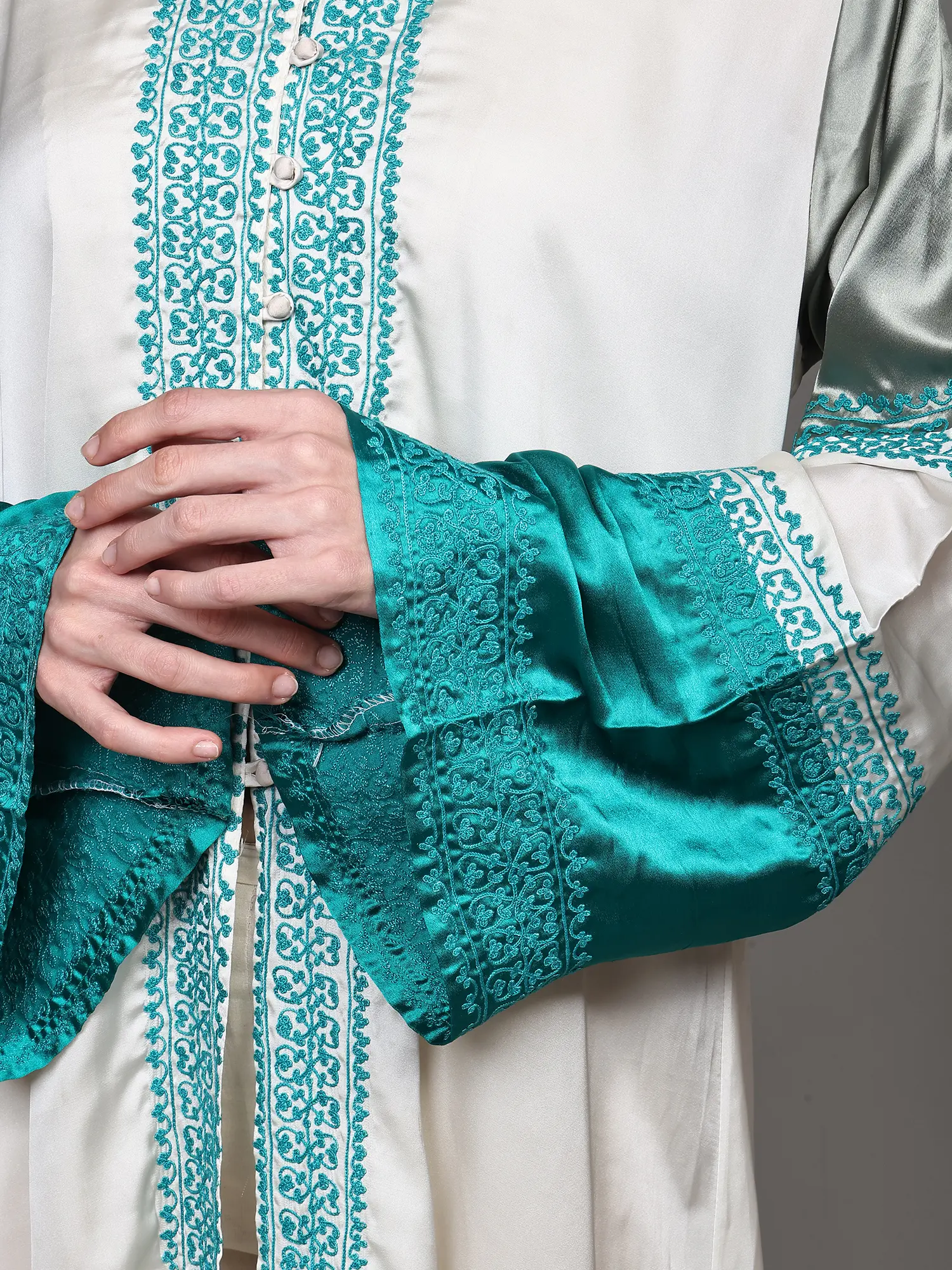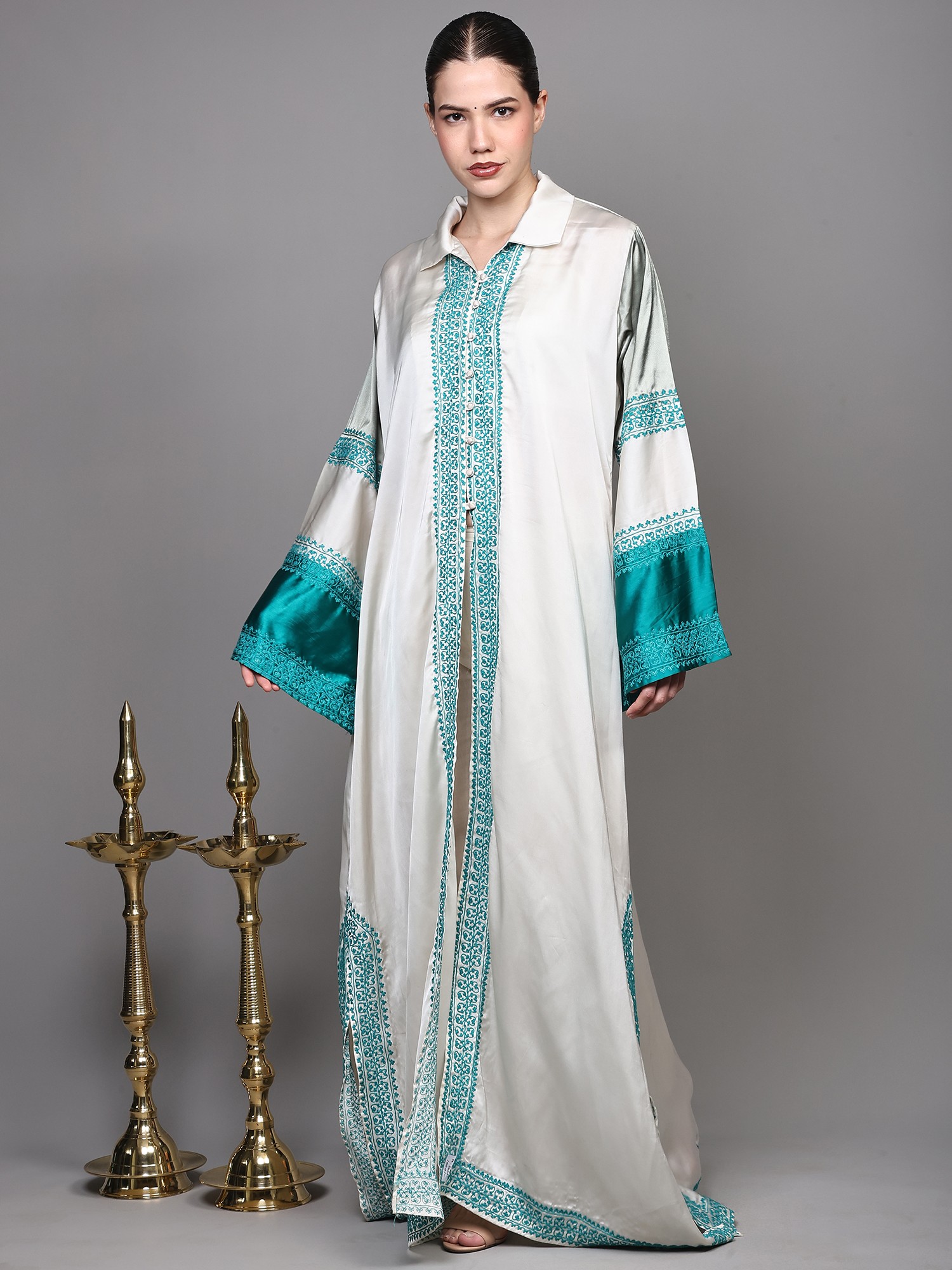 The true heart of this abaya lies in its breathtaking Aari embroidery. Originating from the picturesque valleys of Kashmir, this traditional needlework technique is characterized by its delicate chain-stitch patterns created with a hook-like needle. Here, the embroidery adorns the front placket, the cuffs, and the hemline in a striking teal hue. The intricate motifs, inspired by nature and ancient designs, are meticulously handcrafted, showcasing the skill and dedication of the artisans. The contrasting colors create a captivating visual, drawing the eye to the exquisite detailing and lending an air of opulence to the entire ensemble. The bell sleeves, a modern touch, are further enhanced by the embroidered cuffs, offering a contemporary twist on a classic design.