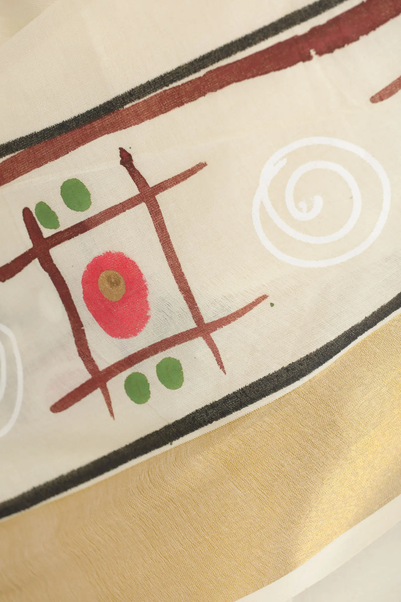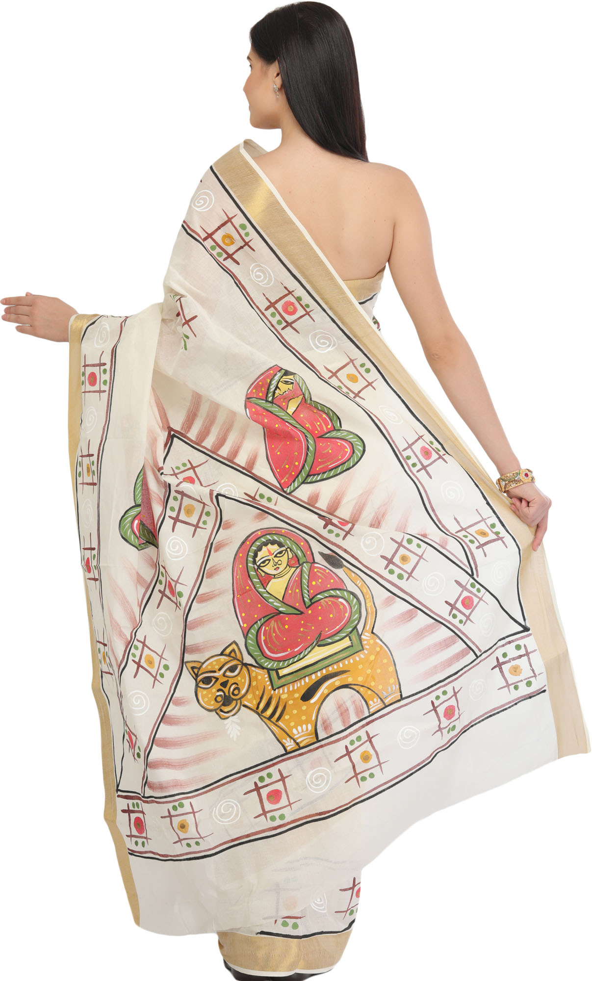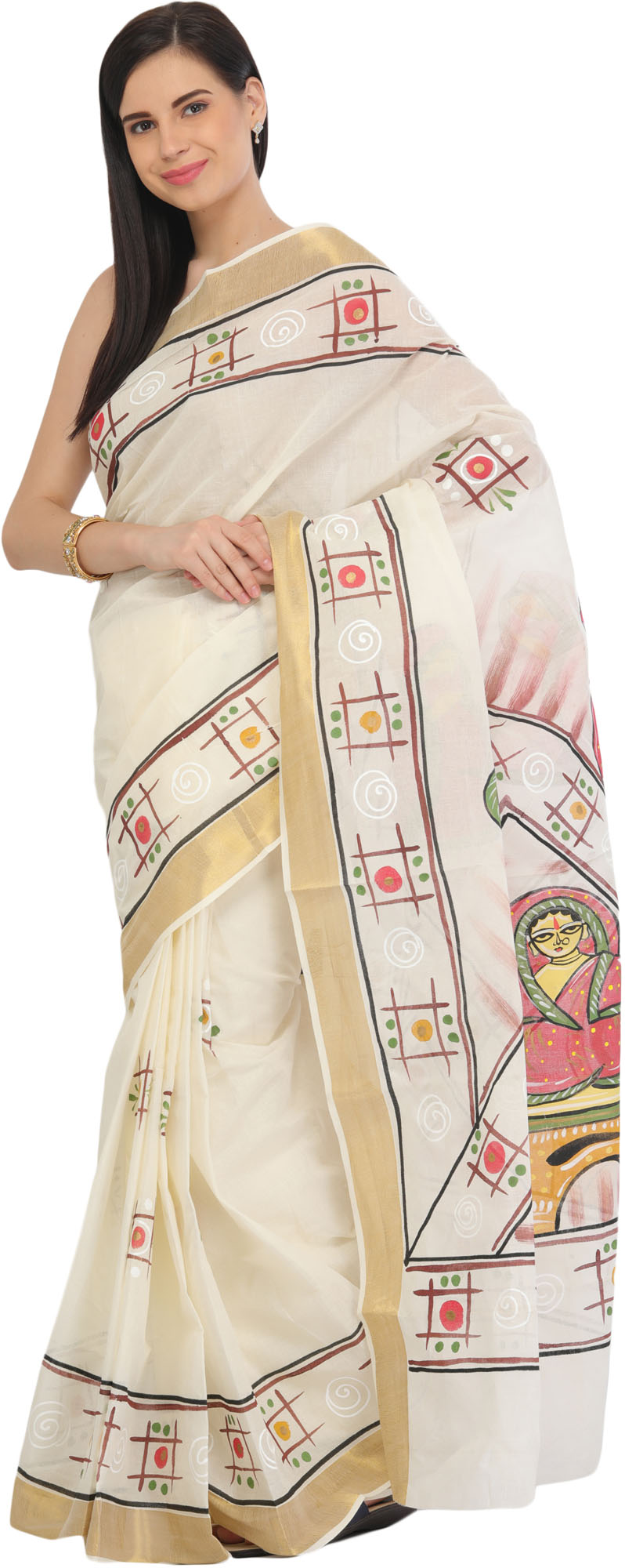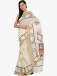 Off-White Hand Painted Jamini Roy Sari with Golden Border